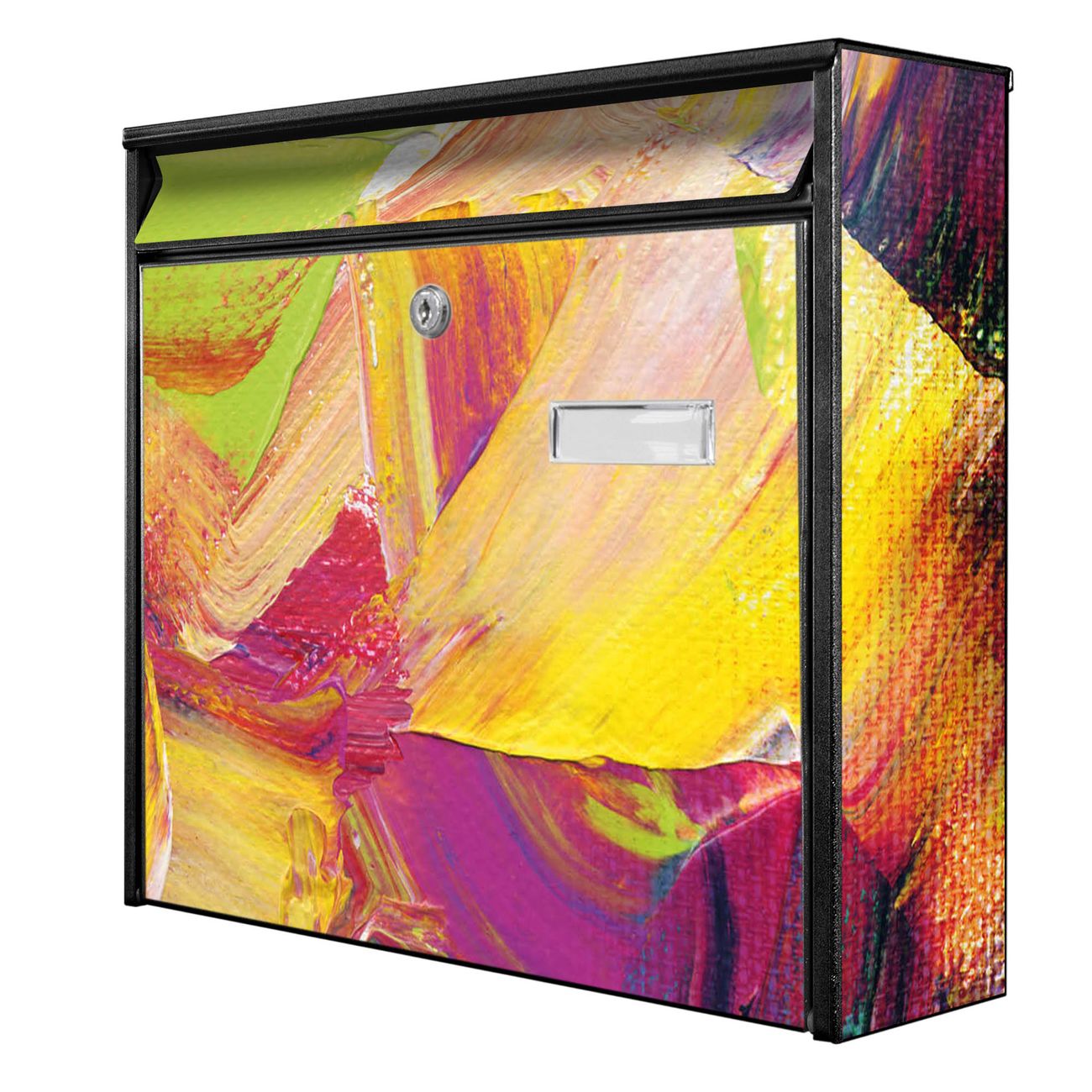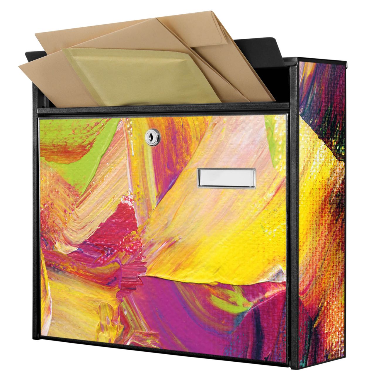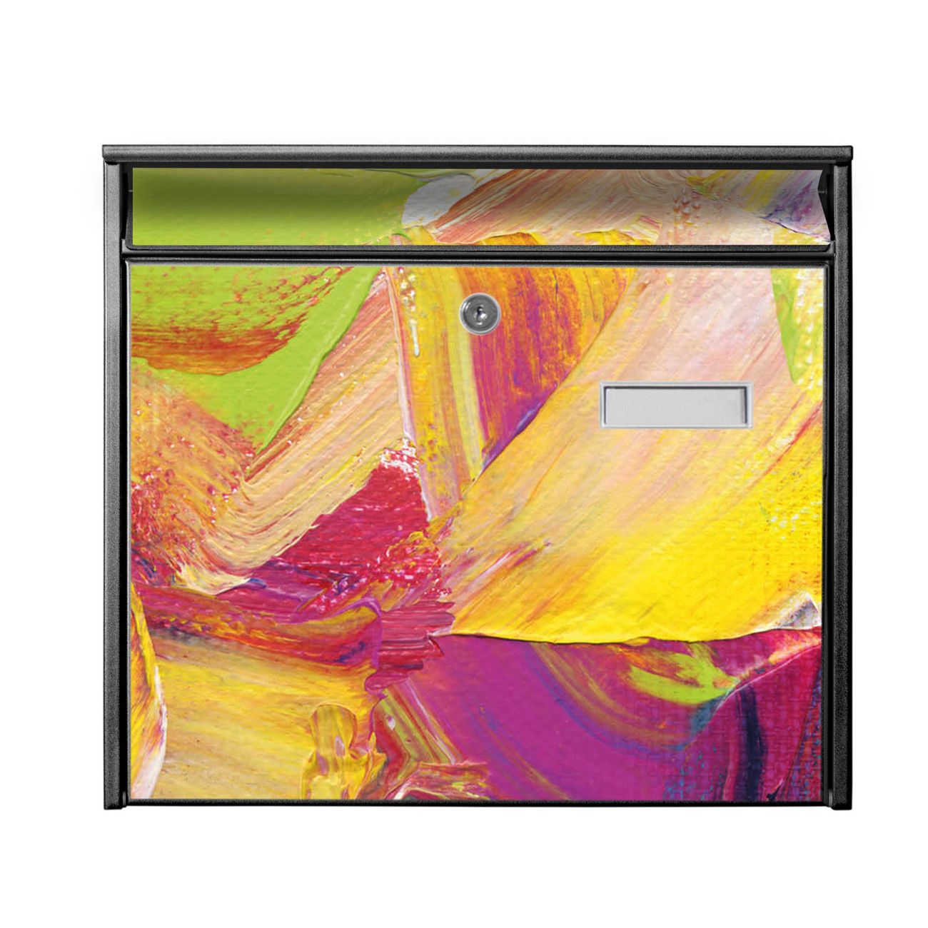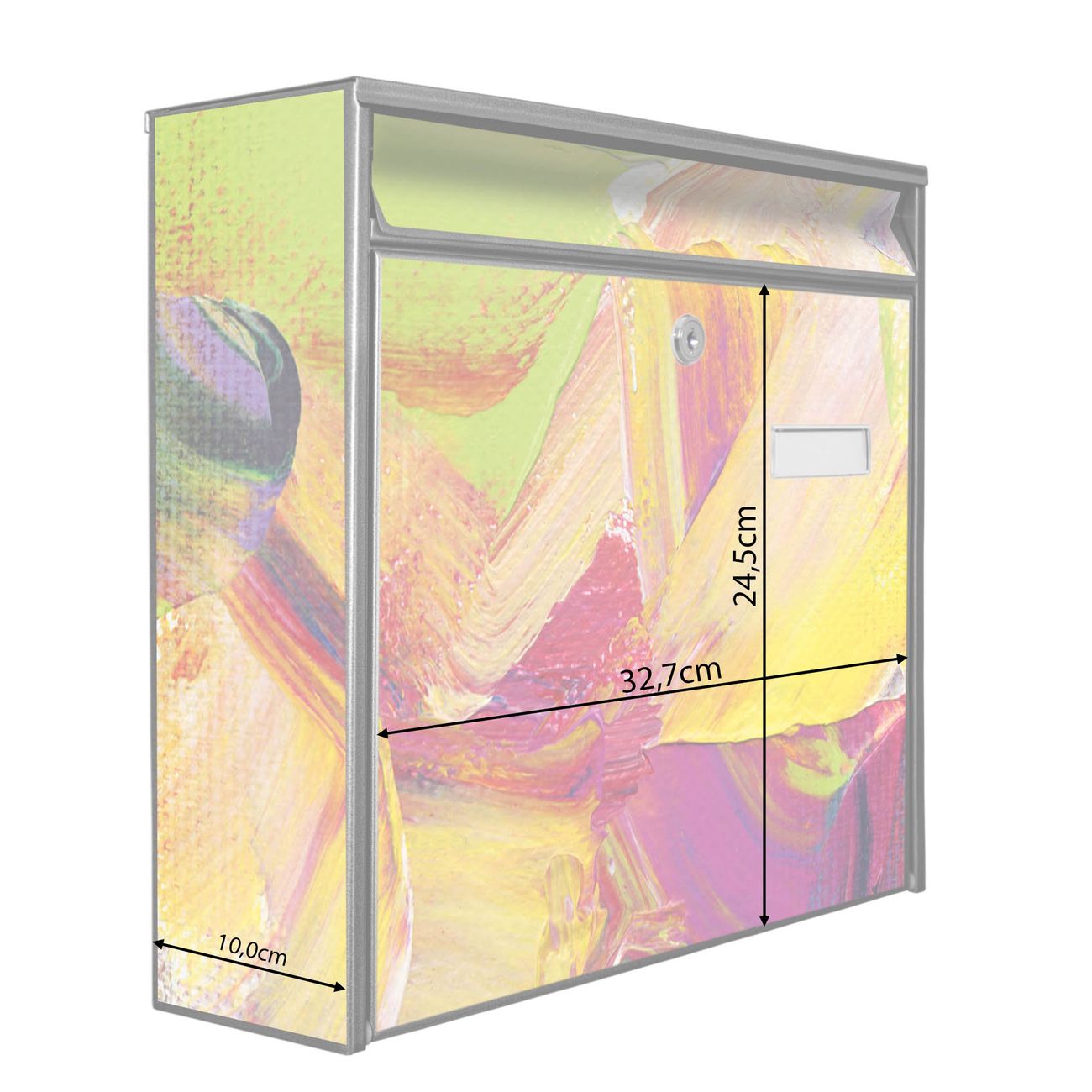 Der Burg Wächter Mail Briefkasten mit Motiv Farbe auf Leinwand bietet Ihnen mit seinem Fassungsvermögen genügend Platz auch für große A4 Sendungen. Auf Wunsch können Sie bei uns den passenden Standfuß kaufen und so aus dem Wandbriefkasten einen Standbriefkasten machen. Wir bieten Ihnen ebenfalls Namensschilder, bereits beschriftet oder frei zu beschriften, und verschiedene selbst gestaltete Bitte-Keine-Werbung-Aufkleber.