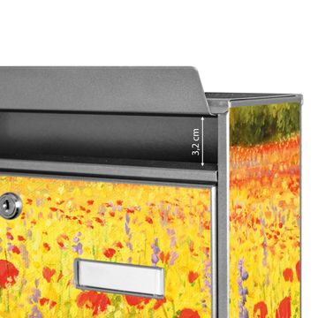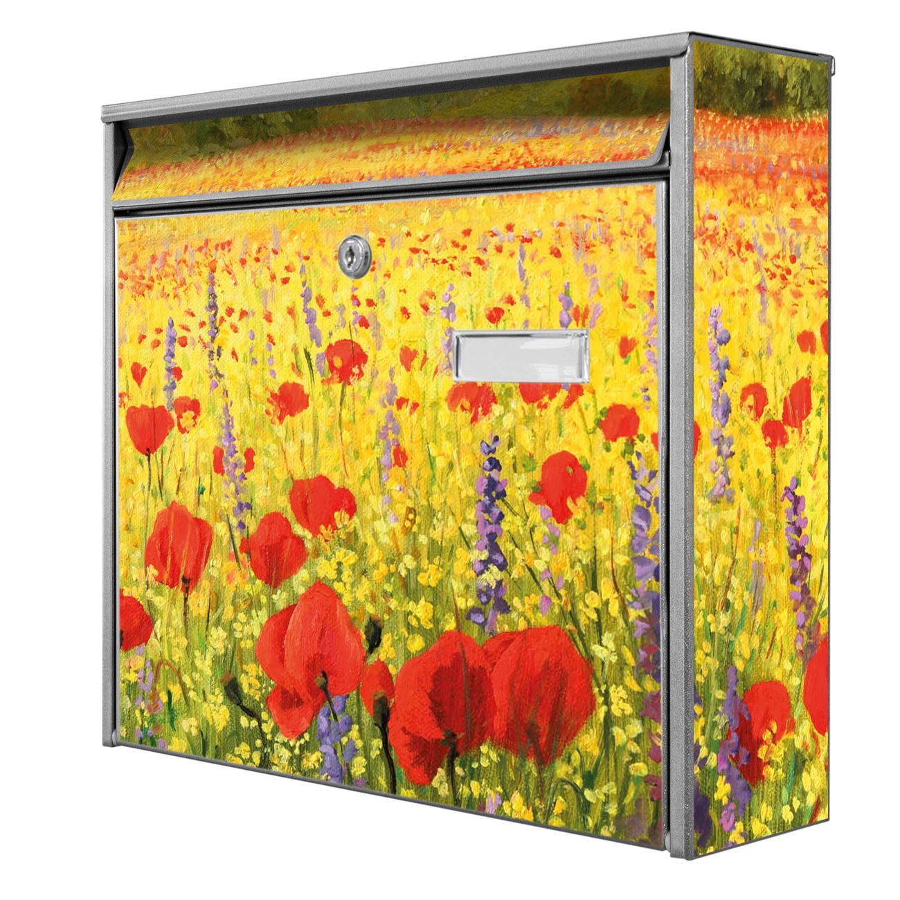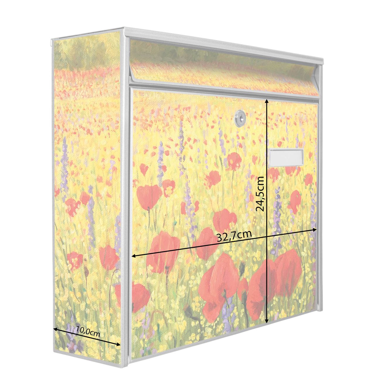 Der Burg Wächter Mail Briefkasten mit Motiv Feld Mit Mohnblumen bietet Ihnen mit seinem Fassungsvermögen genügend Platz auch für große A4 Sendungen. Auf Wunsch können Sie bei uns den passenden Standfuß kaufen und so aus dem Wandbriefkasten einen Standbriefkasten machen. Wir bieten Ihnen ebenfalls Namensschilder, bereits beschriftet oder frei zu beschriften, und verschiedene selbst gestaltete Bitte-Keine-Werbung-Aufkleber.