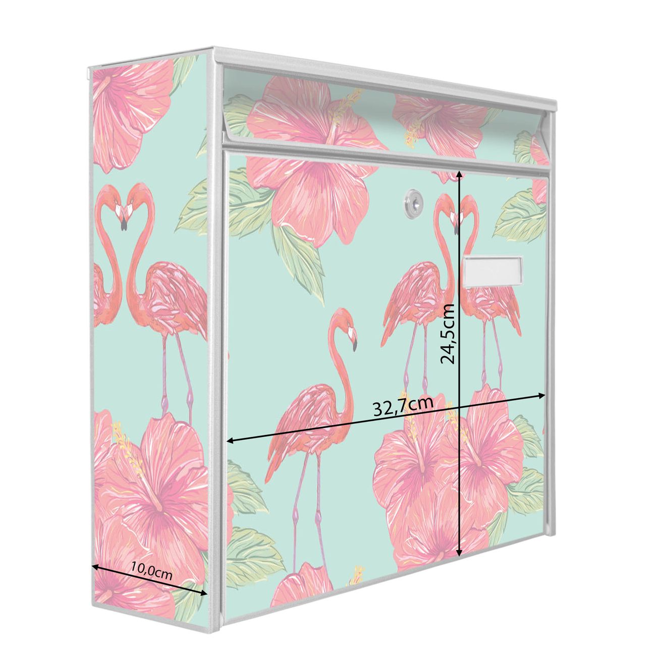 Der Burg Wächter Mail Briefkasten mit Motiv Flamingo Liebe bietet Ihnen mit seinem Fassungsvermögen genügend Platz auch für große A4 Sendungen. Auf Wunsch können Sie bei uns den passenden Standfuß kaufen und so aus dem Wandbriefkasten einen Standbriefkasten machen. Wir bieten Ihnen ebenfalls Namensschilder, bereits beschriftet oder frei zu beschriften, und verschiedene selbst gestaltete Bitte-Keine-Werbung-Aufkleber.