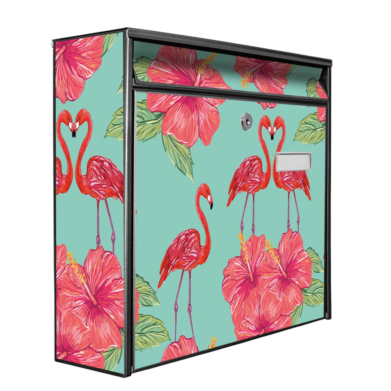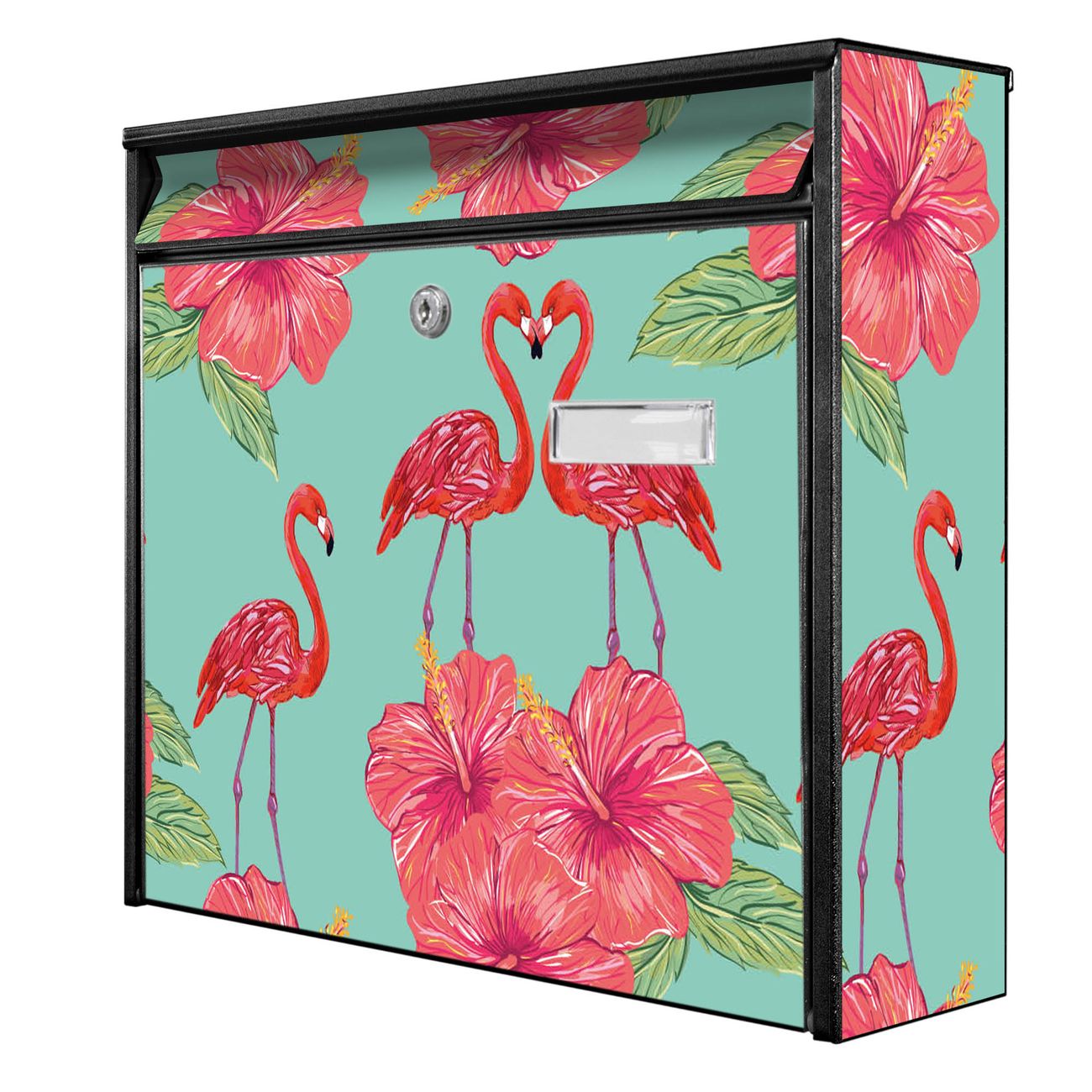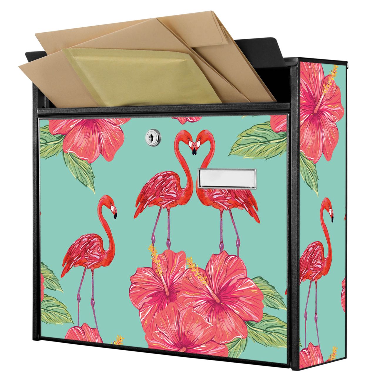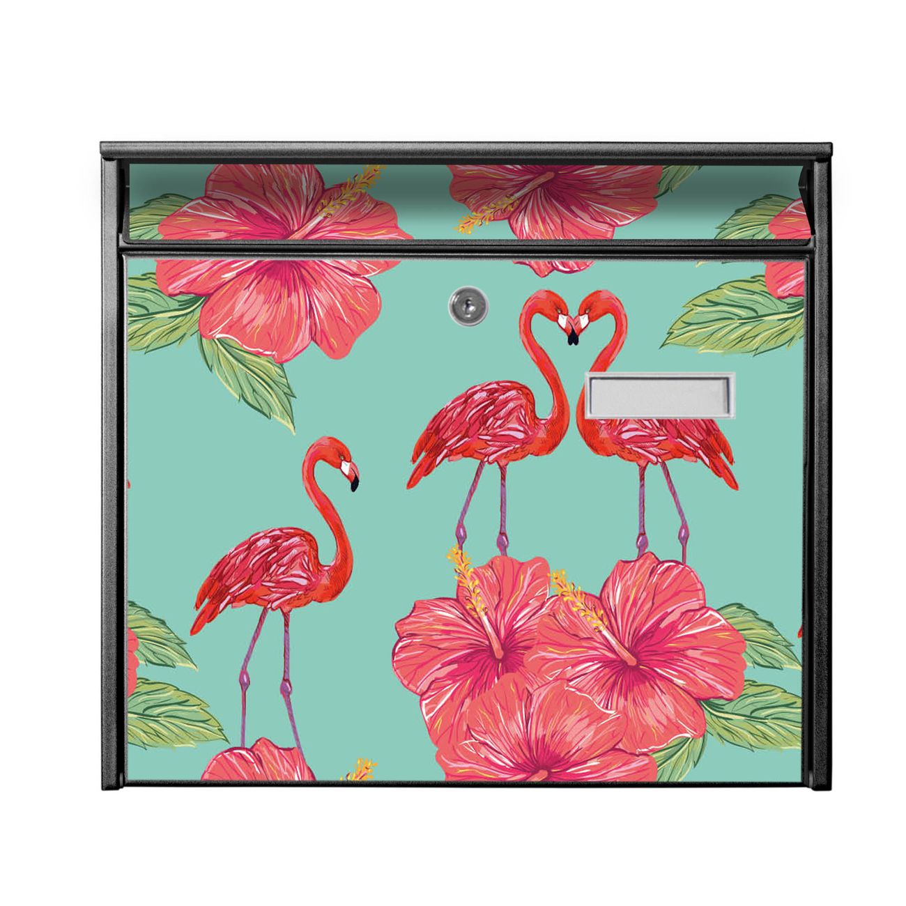 Der Burg Wächter Mail Briefkasten mit Motiv Flamingo Liebe bietet Ihnen mit seinem Fassungsvermögen genügend Platz auch für große A4 Sendungen. Auf Wunsch können Sie bei uns den passenden Standfuß kaufen und so aus dem Wandbriefkasten einen Standbriefkasten machen. Wir bieten Ihnen ebenfalls Namensschilder, bereits beschriftet oder frei zu beschriften, und verschiedene selbst gestaltete Bitte-Keine-Werbung-Aufkleber.