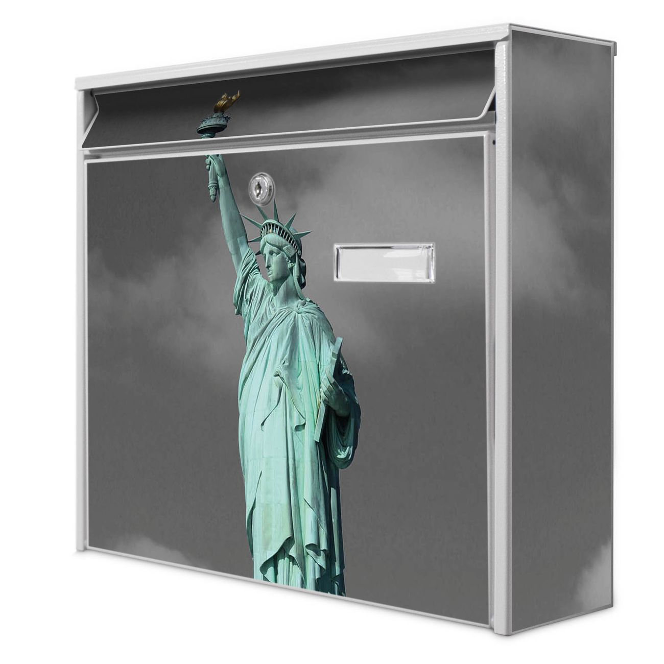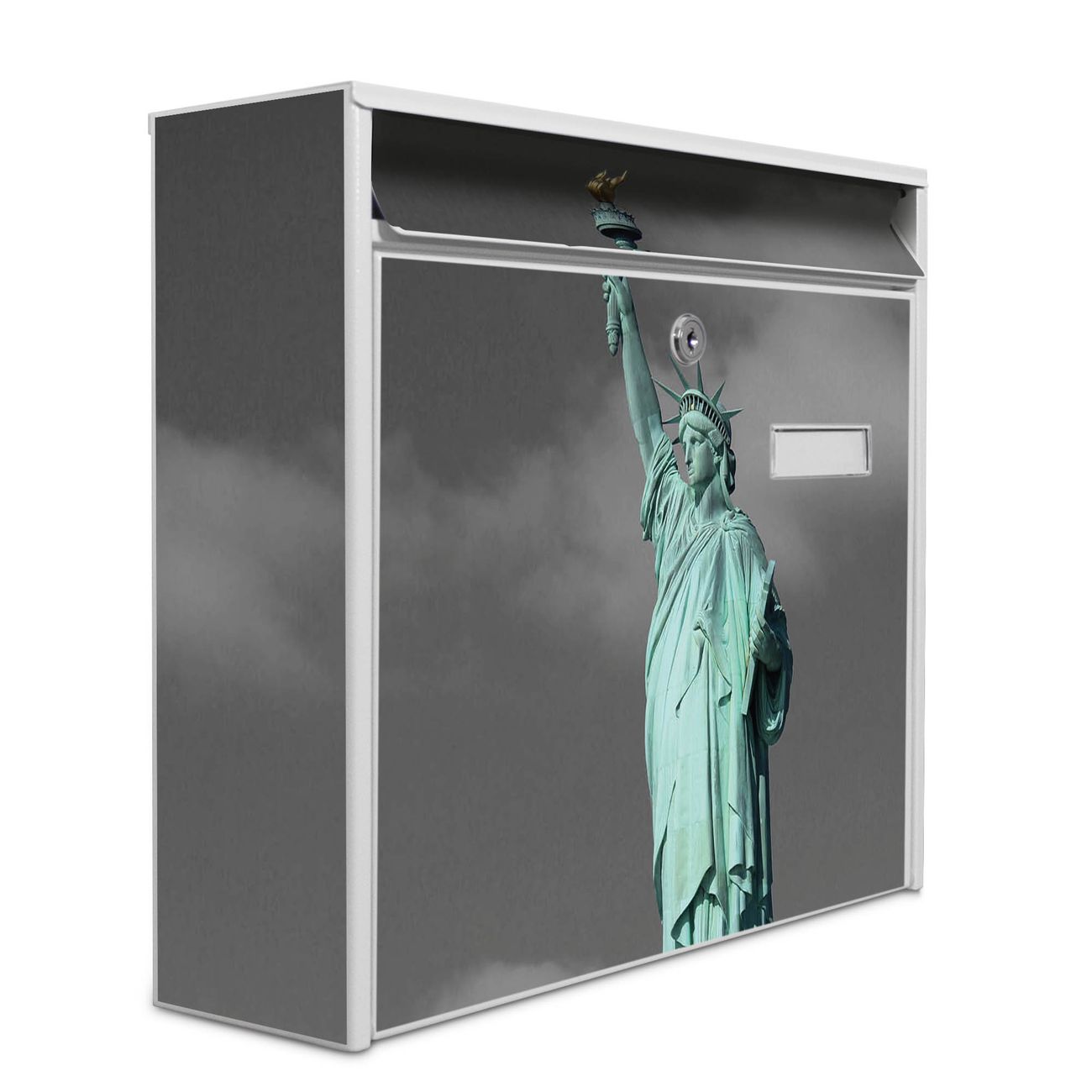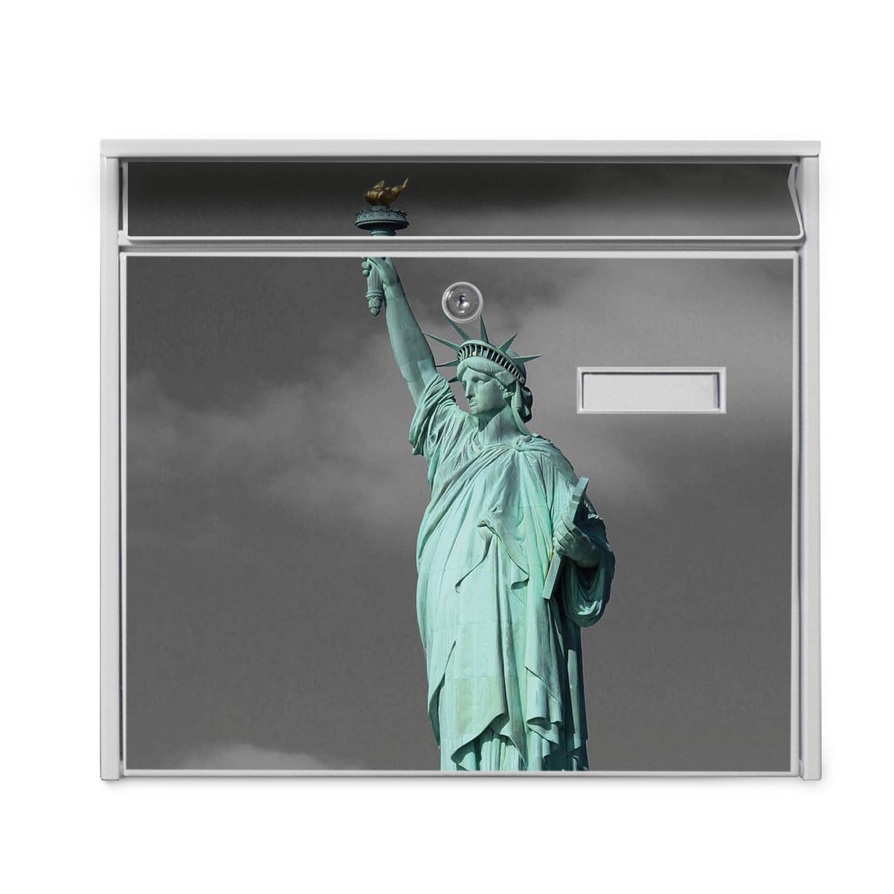 Der Burg Wächter Mail Briefkasten mit Motiv Freiheitsstatue bietet Ihnen mit seinem Fassungsvermögen genügend Platz auch für große A4 Sendungen. Auf Wunsch können Sie bei uns den passenden Standfuß kaufen und so aus dem Wandbriefkasten einen Standbriefkasten machen. Wir bieten Ihnen ebenfalls Namensschilder, bereits beschriftet oder frei zu beschriften, und verschiedene selbst gestaltete Bitte-Keine-Werbung-Aufkleber.
