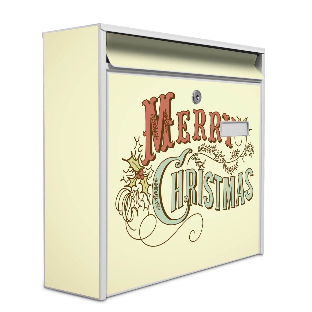 Der Burg Wächter Mail Briefkasten mit Motiv Frohes Fest bietet Ihnen mit seinem Fassungsvermögen genügend Platz auch für große A4 Sendungen. Auf Wunsch können Sie bei uns den passenden Standfuß kaufen und so aus dem Wandbriefkasten einen Standbriefkasten machen. Wir bieten Ihnen ebenfalls Namensschilder, bereits beschriftet oder frei zu beschriften, und verschiedene selbst gestaltete Bitte-Keine-Werbung-Aufkleber.