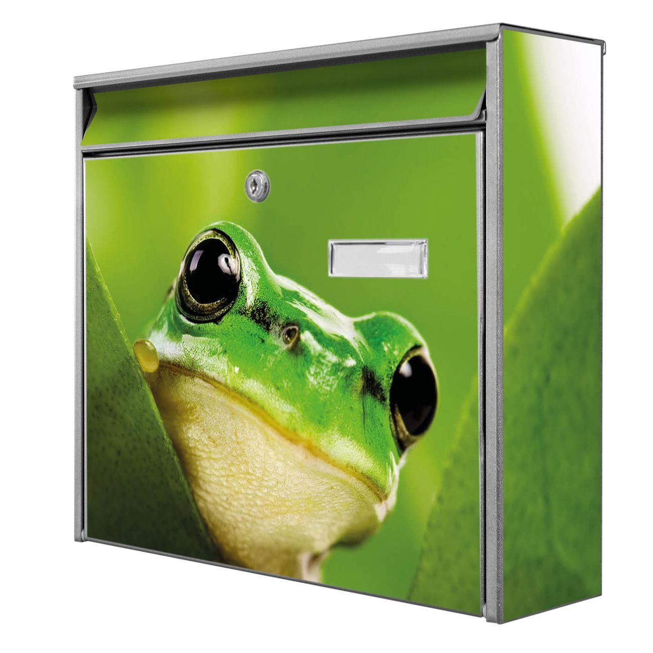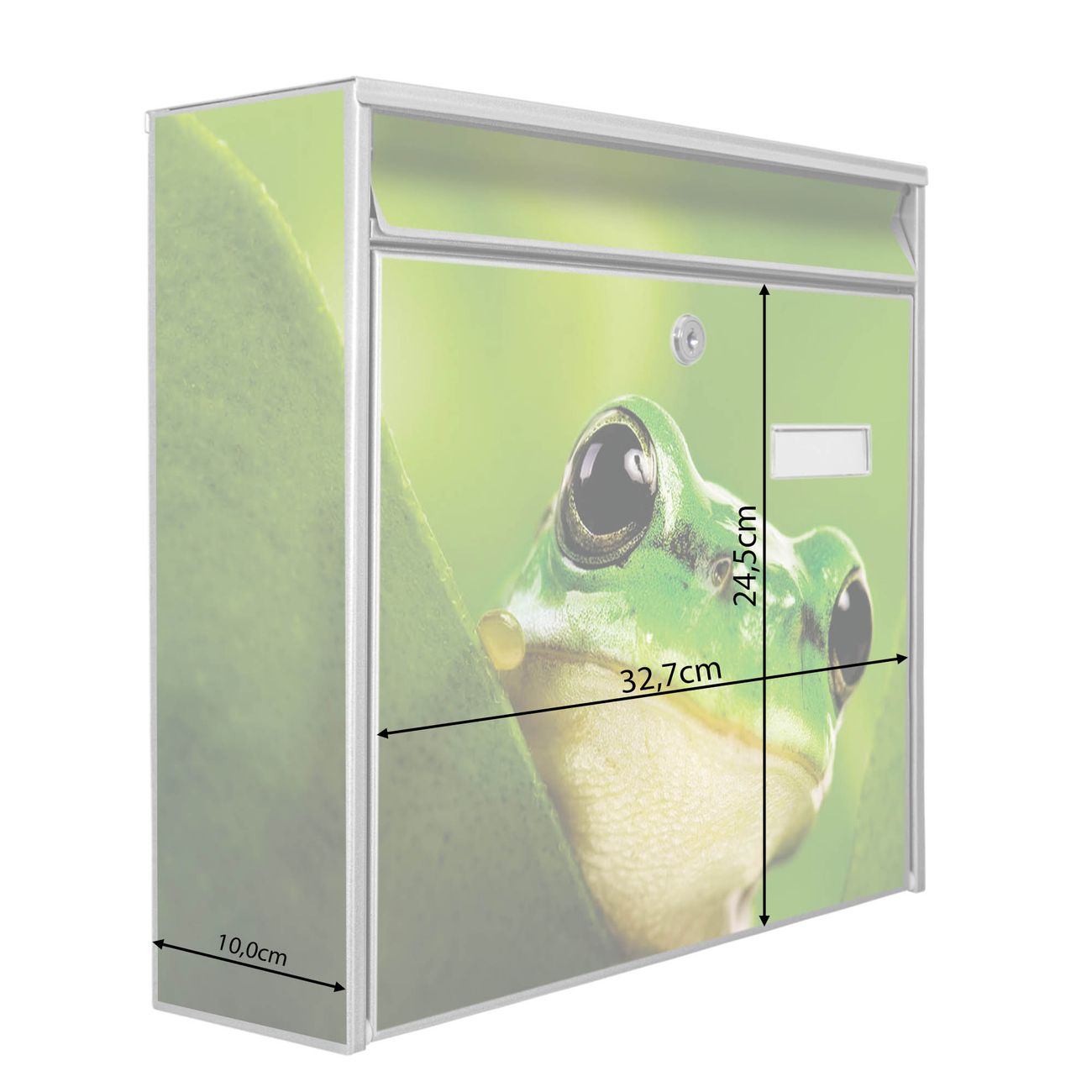 Der Burg Wächter Mail Briefkasten mit Motiv Frosch bietet Ihnen mit seinem Fassungsvermögen genügend Platz auch für große A4 Sendungen. Auf Wunsch können Sie bei uns den passenden Standfuß kaufen und so aus dem Wandbriefkasten einen Standbriefkasten machen. Wir bieten Ihnen ebenfalls Namensschilder, bereits beschriftet oder frei zu beschriften, und verschiedene selbst gestaltete Bitte-Keine-Werbung-Aufkleber.