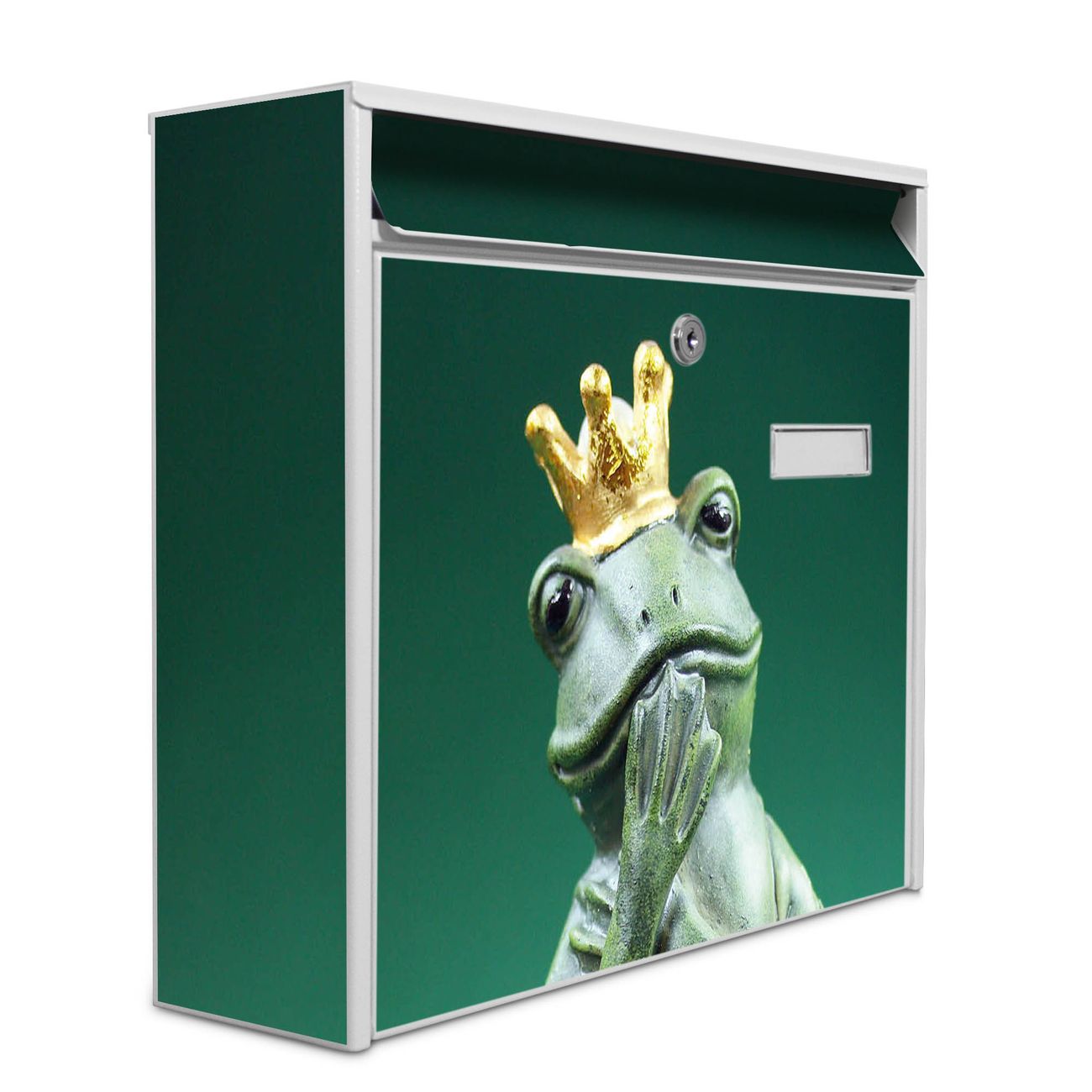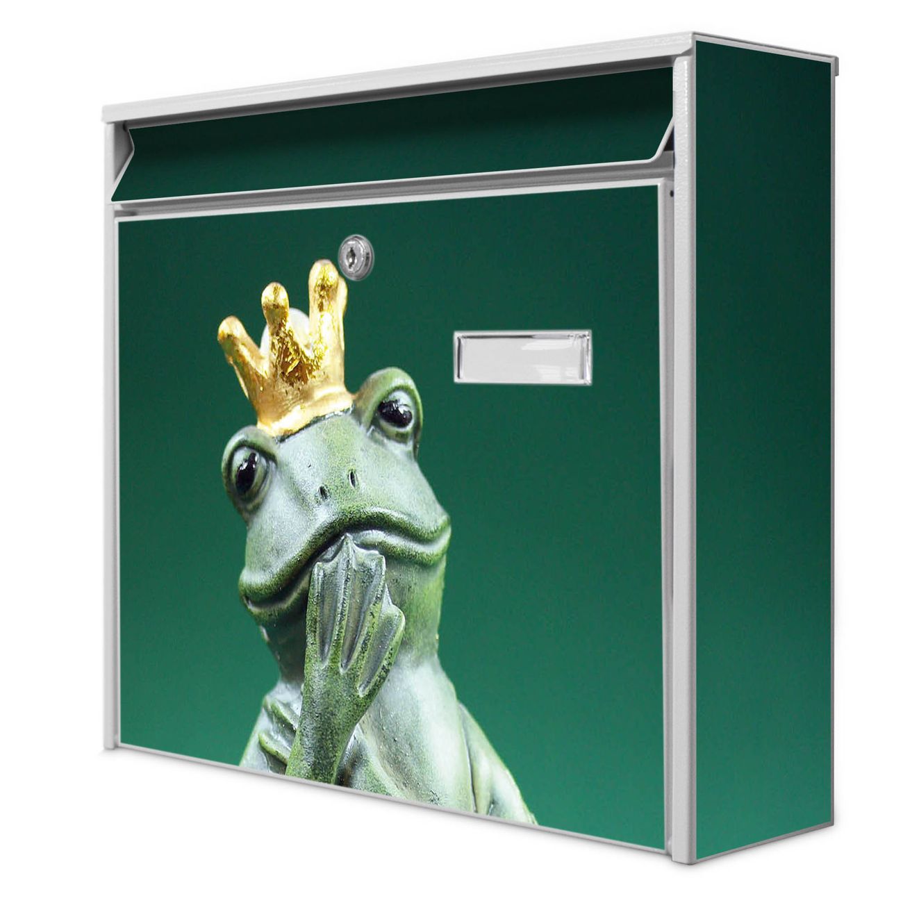Der Postkasten mit Motiv Froschkönig hat ein sehr ansprechendes und zeitloses Design. Heben Sie Sich von der tristen grauen Masse ab, ohne auf Funktionalität zu verzichten. Die weite Öffnung ohne scharfe Kanten ermöglicht eine einfache Handhabung beim Entnehmen der Post. Die Größe bietet genügend Platz für Sendungen aller Art, der Einwurf fasst auch größere A4 Sendungen. Ihr Burg-Wächter Motivbriefkasten wird in Sachsen in einer kleinen Manufaktur von Hand veredelt. Die Motivfolie ist lösungsmittelfrei und schutzlaminiert, dies sorgt für einen langen Halt. Wir legen großen Wert auf die Verbindung von Funktionalität und Design.