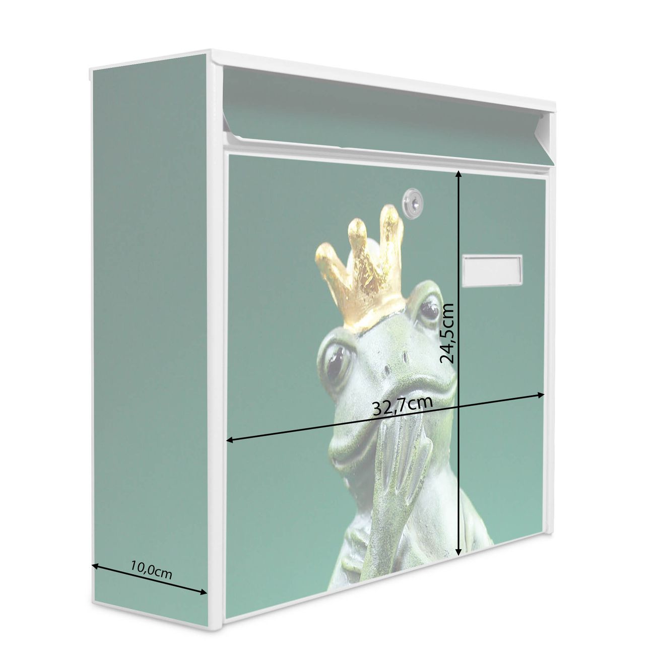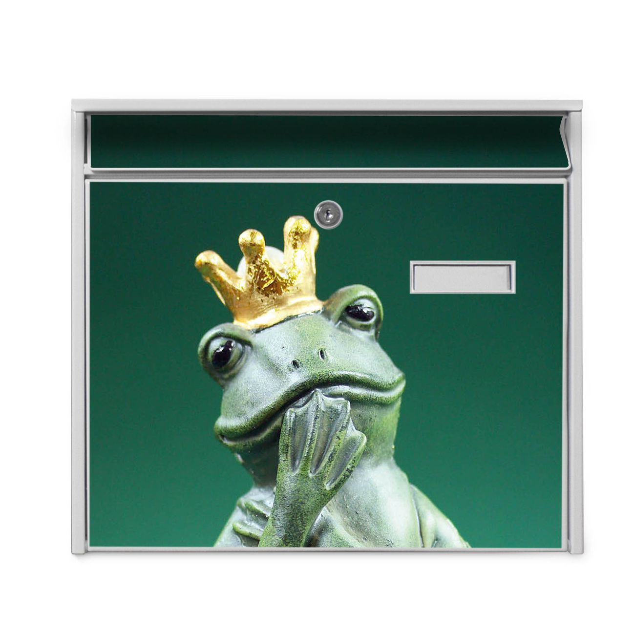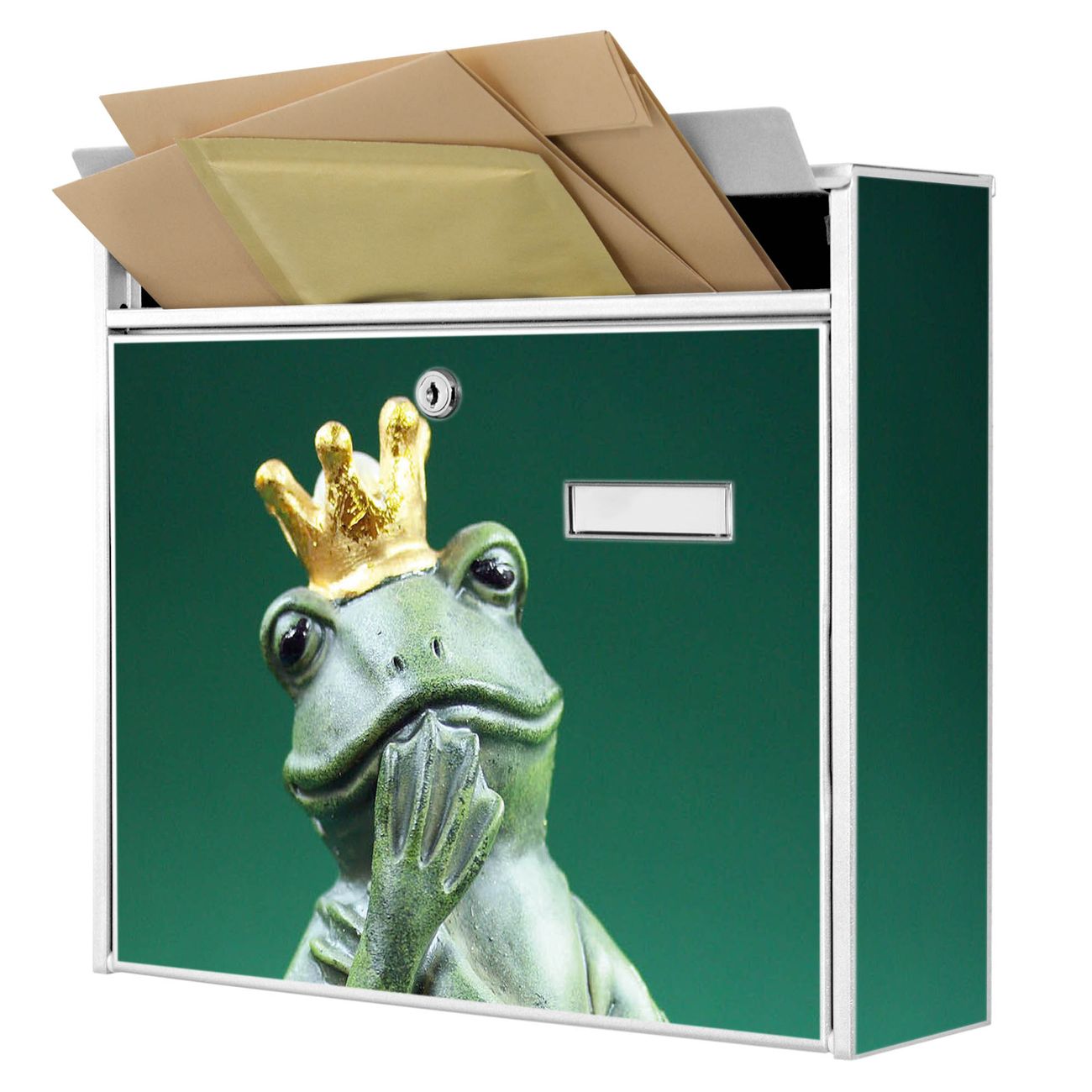 Der Burg Wächter Mail Briefkasten mit Motiv Froschkönig bietet Ihnen mit seinem Fassungsvermögen genügend Platz auch für große A4 Sendungen. Auf Wunsch können Sie bei uns den passenden Standfuß kaufen und so aus dem Wandbriefkasten einen Standbriefkasten machen. Wir bieten Ihnen ebenfalls Namensschilder, bereits beschriftet oder frei zu beschriften, und verschiedene selbst gestaltete Bitte-Keine-Werbung-Aufkleber.