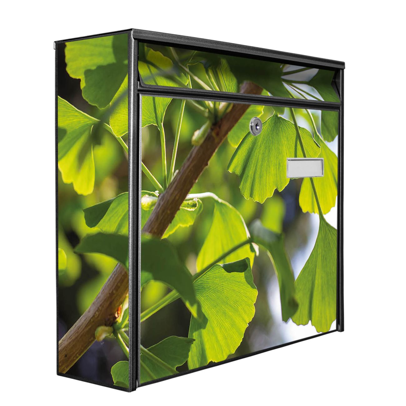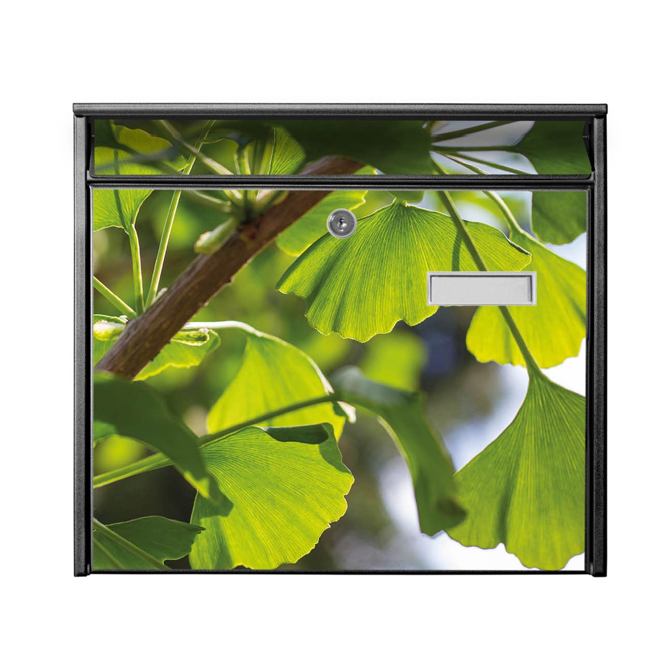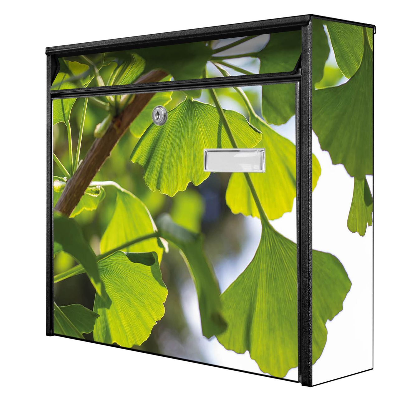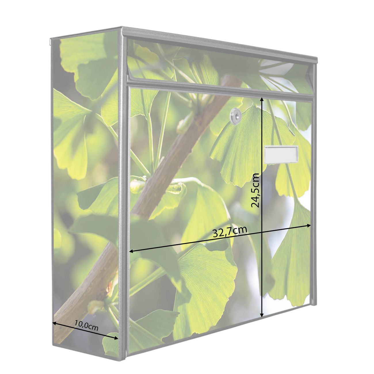 Der Burg Wächter Mail Briefkasten mit Motiv Gingko bietet Ihnen mit seinem Fassungsvermögen genügend Platz auch für große A4 Sendungen. Auf Wunsch können Sie bei uns den passenden Standfuß kaufen und so aus dem Wandbriefkasten einen Standbriefkasten machen. Wir bieten Ihnen ebenfalls Namensschilder, bereits beschriftet oder frei zu beschriften, und verschiedene selbst gestaltete Bitte-Keine-Werbung-Aufkleber.