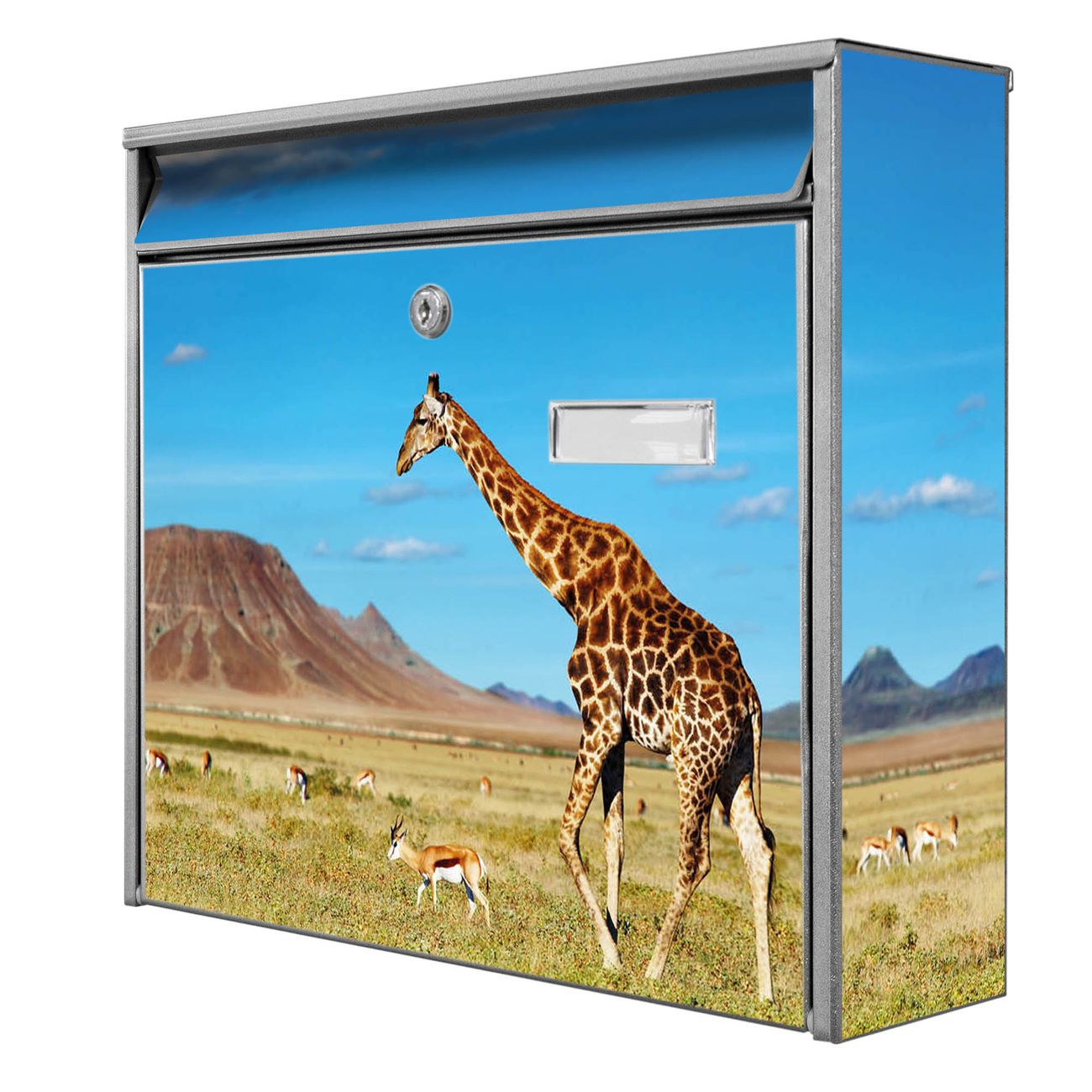 Der Burg Wächter Mail Briefkasten mit Motiv Giraffe bietet Ihnen mit seinem Fassungsvermögen genügend Platz auch für große A4 Sendungen. Auf Wunsch können Sie bei uns den passenden Standfuß kaufen und so aus dem Wandbriefkasten einen Standbriefkasten machen. Wir bieten Ihnen ebenfalls Namensschilder, bereits beschriftet oder frei zu beschriften, und verschiedene selbst gestaltete Bitte-Keine-Werbung-Aufkleber.