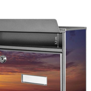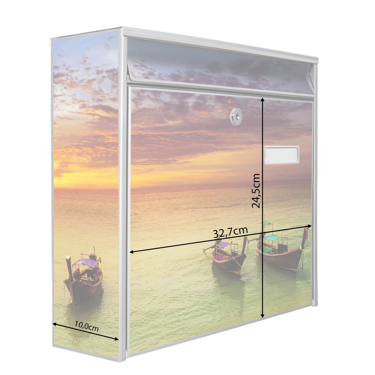 Die Größe des Briefkastens ist 36 x 32 x 10cm (BxHxT) groß. Das Motiv besteht aus einer wetter- und UV-festen Folie, die mit einem Schutzlaminat überzogen ist und Ihren Briefkasten zusätzlich vor Kratzern schützt. Sie erhalten 2 Schlüssel sowie das Montagematerial.