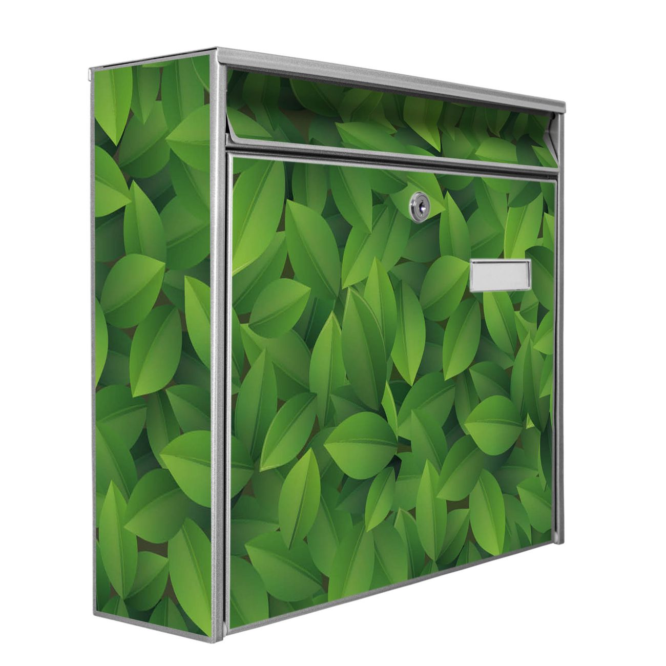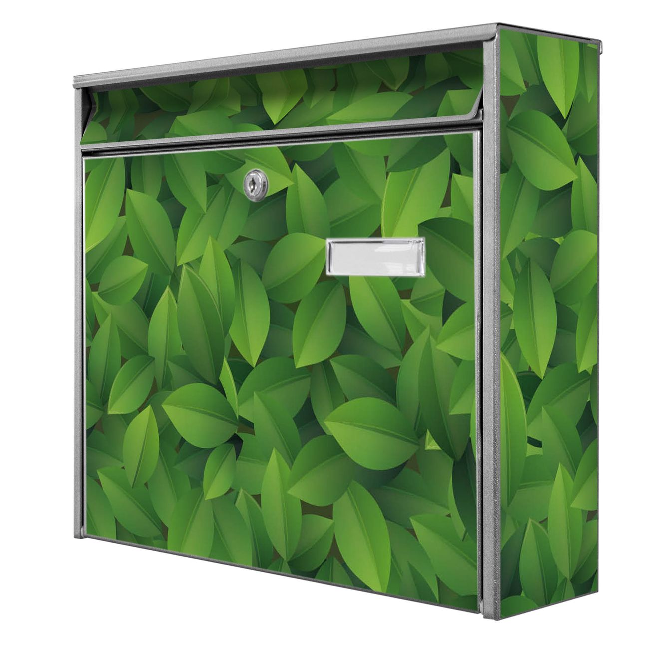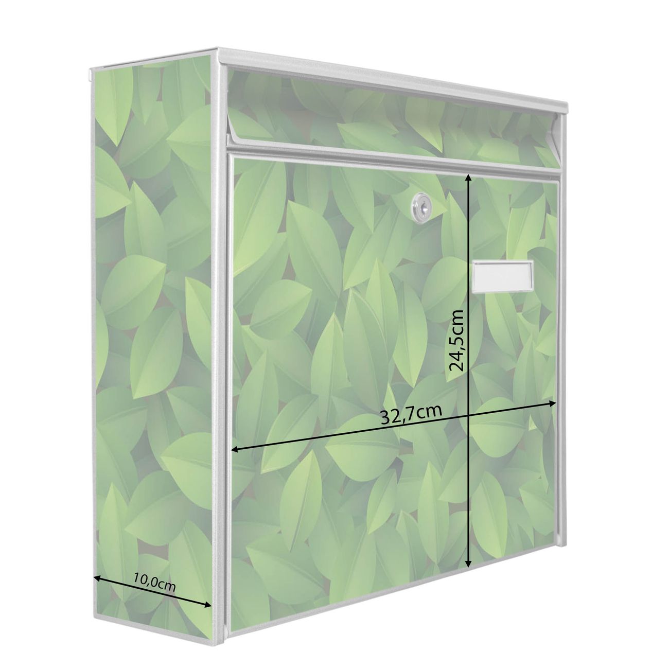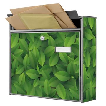 Der Burg Wächter Mail Briefkasten mit Motiv Grüne Blätter bietet Ihnen mit seinem Fassungsvermögen genügend Platz auch für große A4 Sendungen. Auf Wunsch können Sie bei uns den passenden Standfuß kaufen und so aus dem Wandbriefkasten einen Standbriefkasten machen. Wir bieten Ihnen ebenfalls Namensschilder, bereits beschriftet oder frei zu beschriften, und verschiedene selbst gestaltete Bitte-Keine-Werbung-Aufkleber.