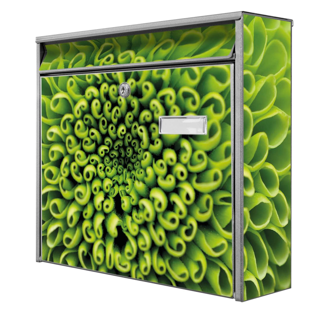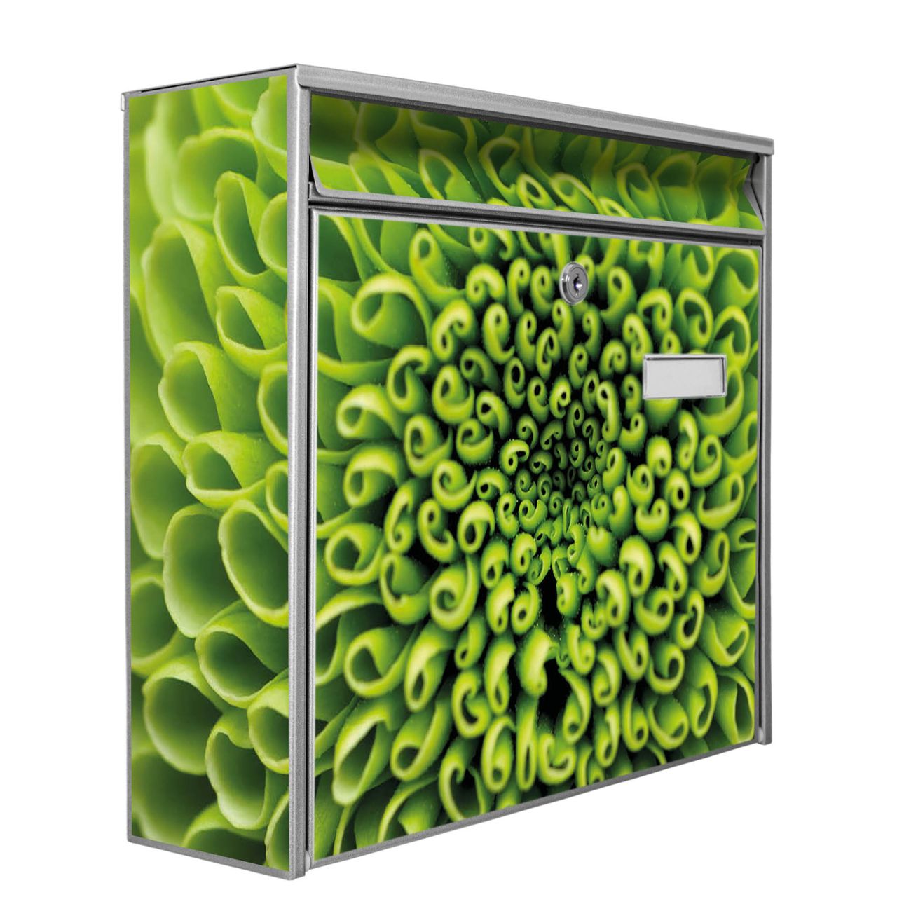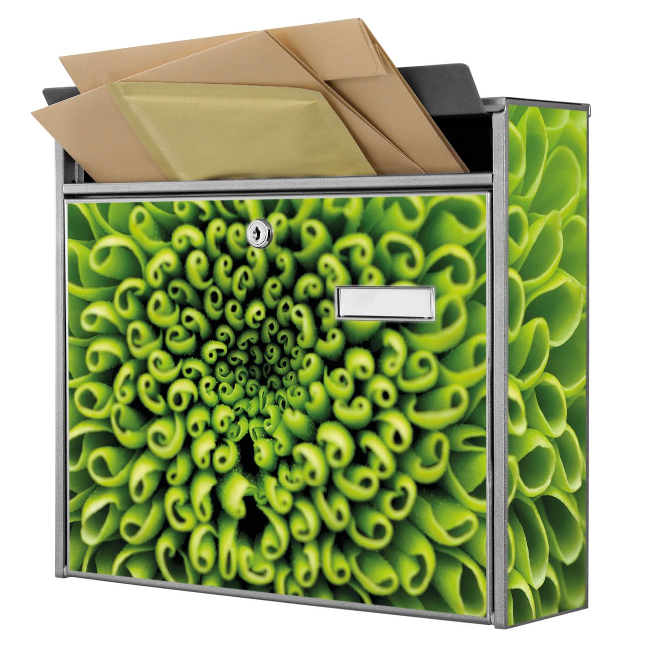 Der Burg Wächter Mail Briefkasten mit Motiv Grüne Chrysantheme bietet Ihnen mit seinem Fassungsvermögen genügend Platz auch für große A4 Sendungen. Auf Wunsch können Sie bei uns den passenden Standfuß kaufen und so aus dem Wandbriefkasten einen Standbriefkasten machen. Wir bieten Ihnen ebenfalls Namensschilder, bereits beschriftet oder frei zu beschriften, und verschiedene selbst gestaltete Bitte-Keine-Werbung-Aufkleber.