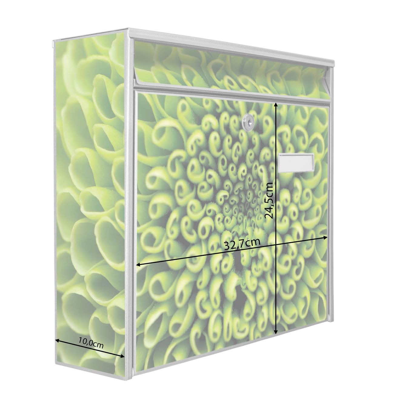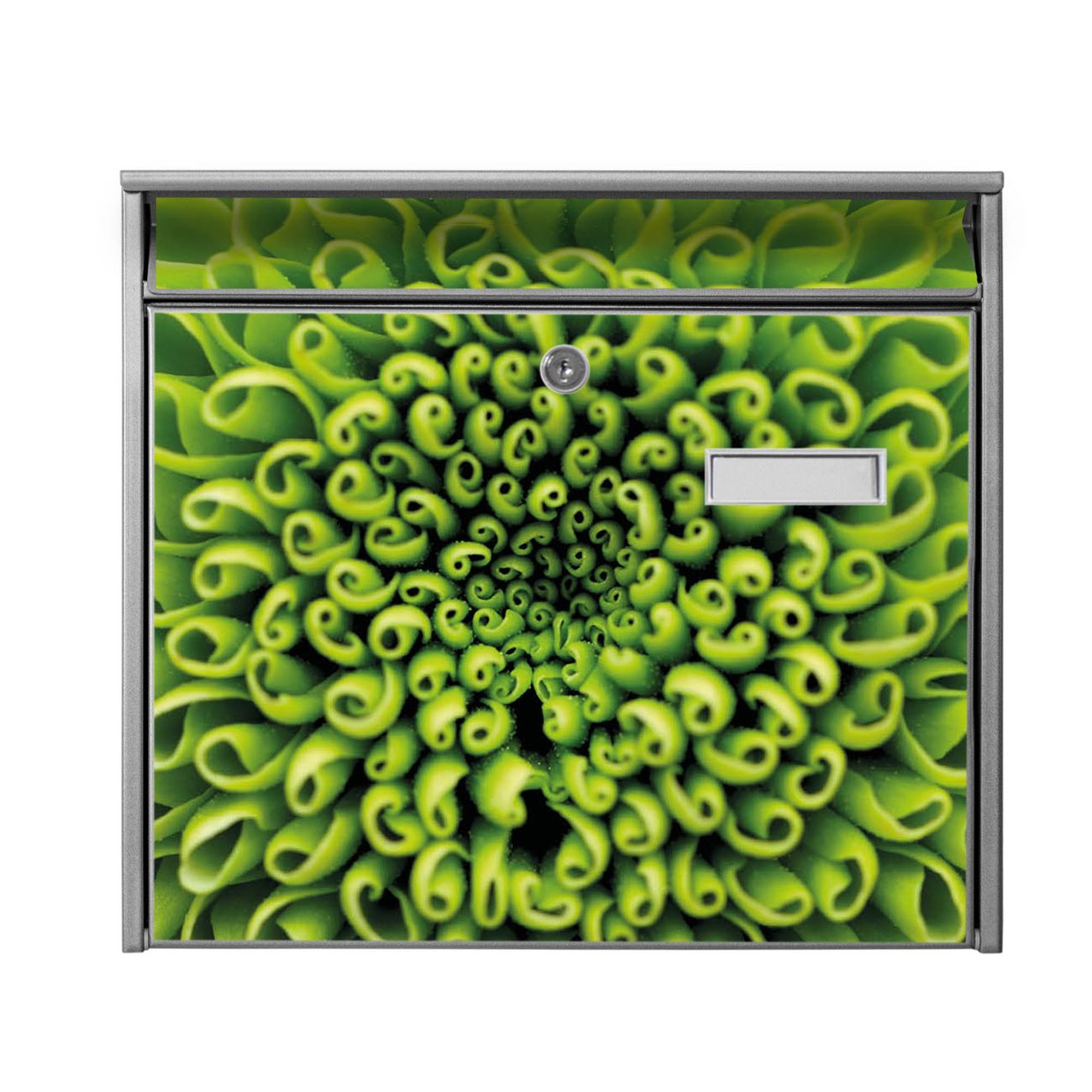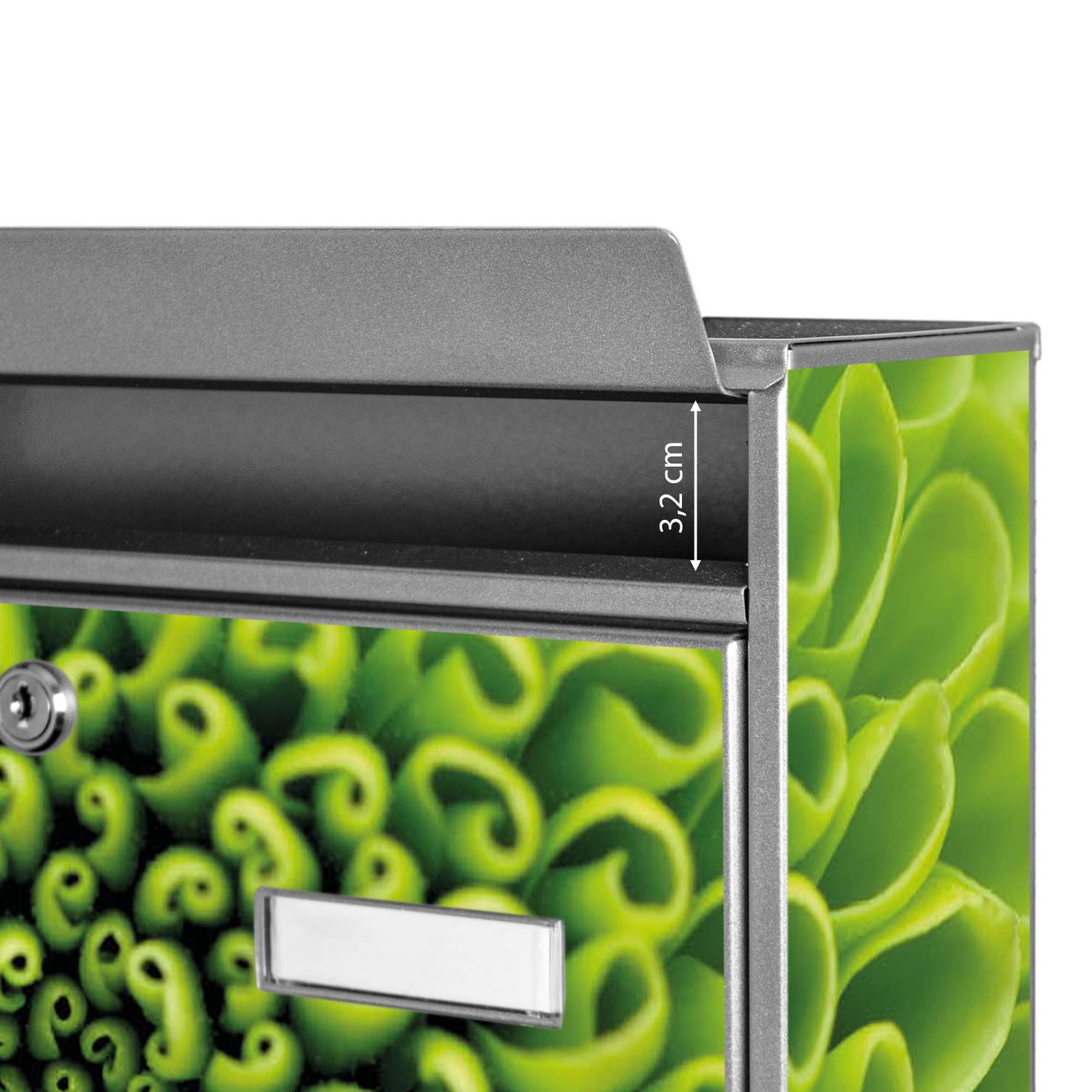 Der Burg Wächter Mail Briefkasten mit Motiv Grüne Chrysantheme bietet Ihnen mit seinem Fassungsvermögen genügend Platz auch für große A4 Sendungen. Auf Wunsch können Sie bei uns den passenden Standfuß kaufen und so aus dem Wandbriefkasten einen Standbriefkasten machen. Wir bieten Ihnen ebenfalls Namensschilder, bereits beschriftet oder frei zu beschriften, und verschiedene selbst gestaltete Bitte-Keine-Werbung-Aufkleber.
