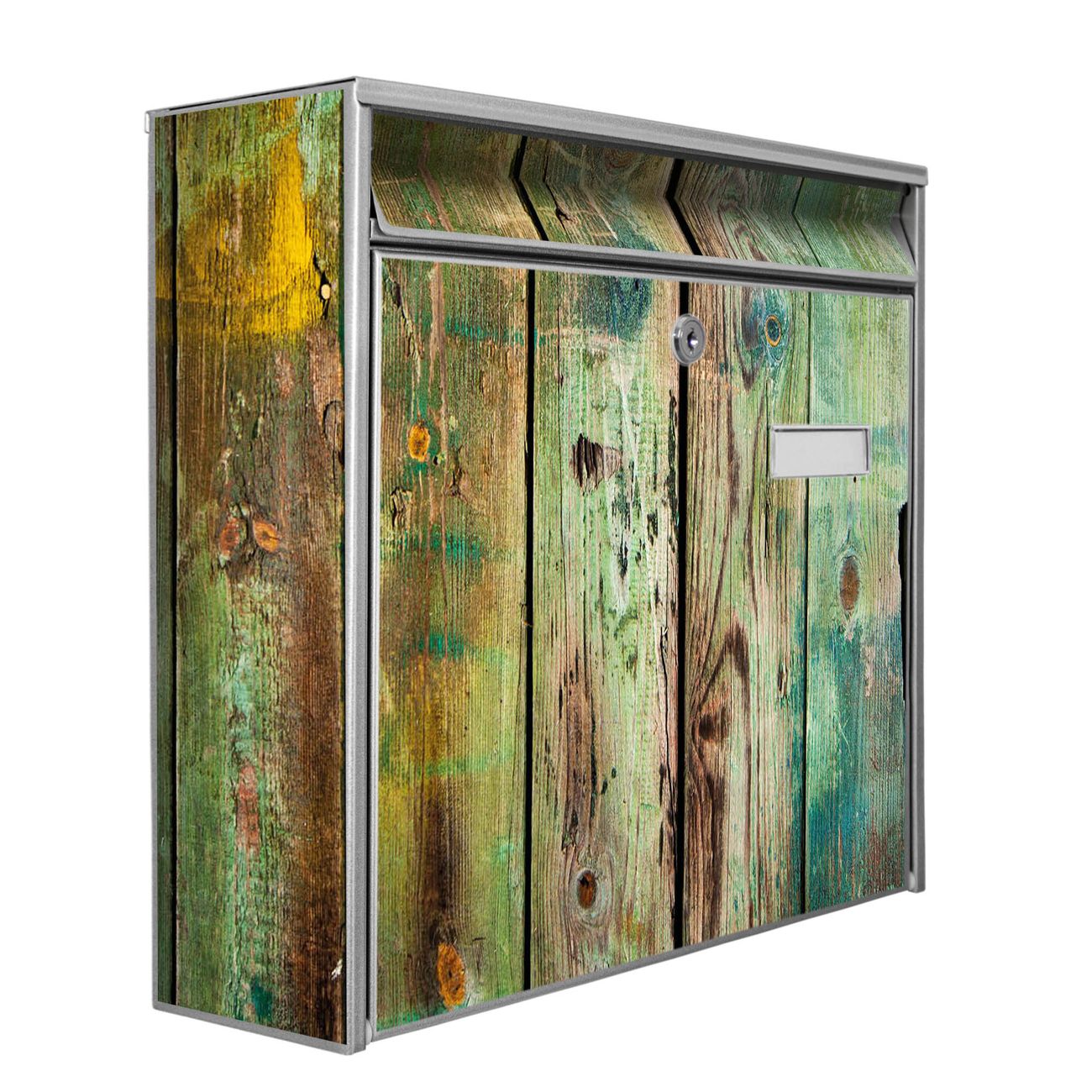 Der Postkasten mit Motiv Grünes Holz hat ein sehr ansprechendes und zeitloses Design. Heben Sie Sich von der tristen grauen Masse ab, ohne auf Funktionalität zu verzichten. Die weite Öffnung ohne scharfe Kanten ermöglicht eine einfache Handhabung beim Entnehmen der Post. Die Größe bietet genügend Platz für Sendungen aller Art, der Einwurf fasst auch größere A4 Sendungen. Ihr Burg-Wächter Motivbriefkasten wird in Sachsen in einer kleinen Manufaktur von Hand veredelt. Die Motivfolie ist lösungsmittelfrei und schutzlaminiert, dies sorgt für einen langen Halt. Wir legen großen Wert auf die Verbindung von Funktionalität und Design.
