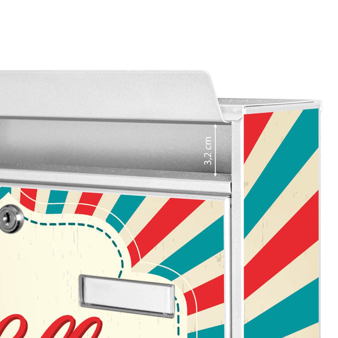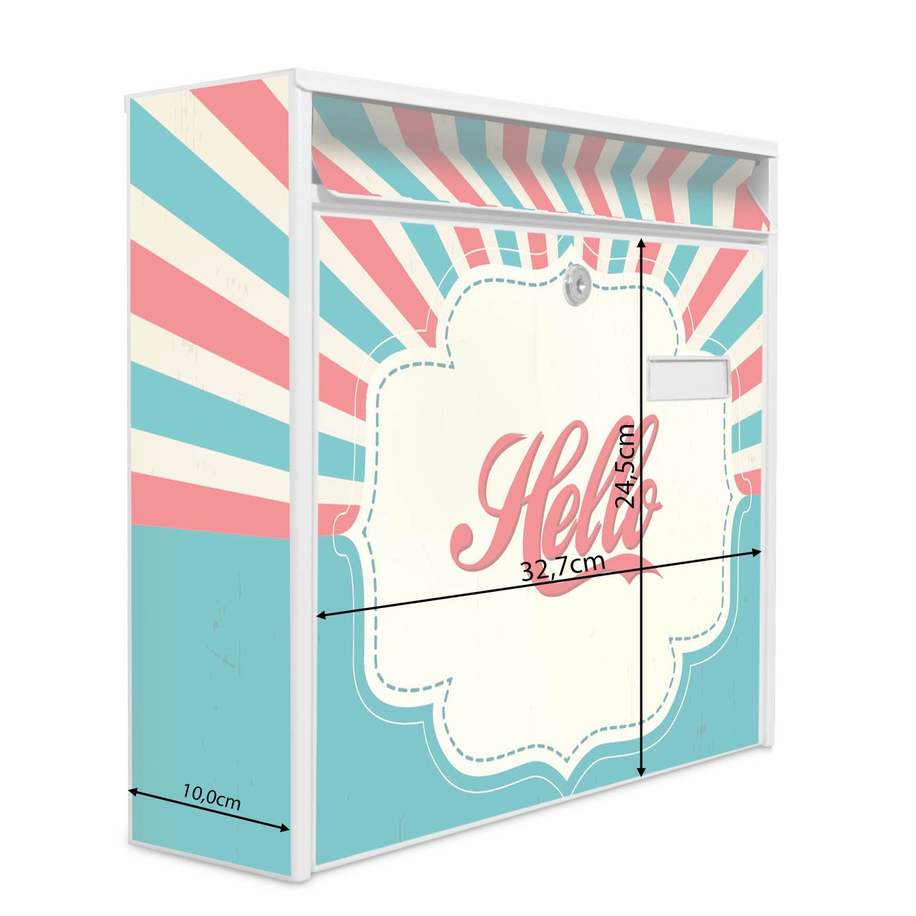 Die Größe des Briefkastens ist 36 x 32 x 10cm (BxHxT) groß. Das Motiv besteht aus einer wetter- und UV-festen Folie, die mit einem Schutzlaminat überzogen ist und Ihren Briefkasten zusätzlich vor Kratzern schützt. Sie erhalten 2 Schlüssel sowie das Montagematerial.