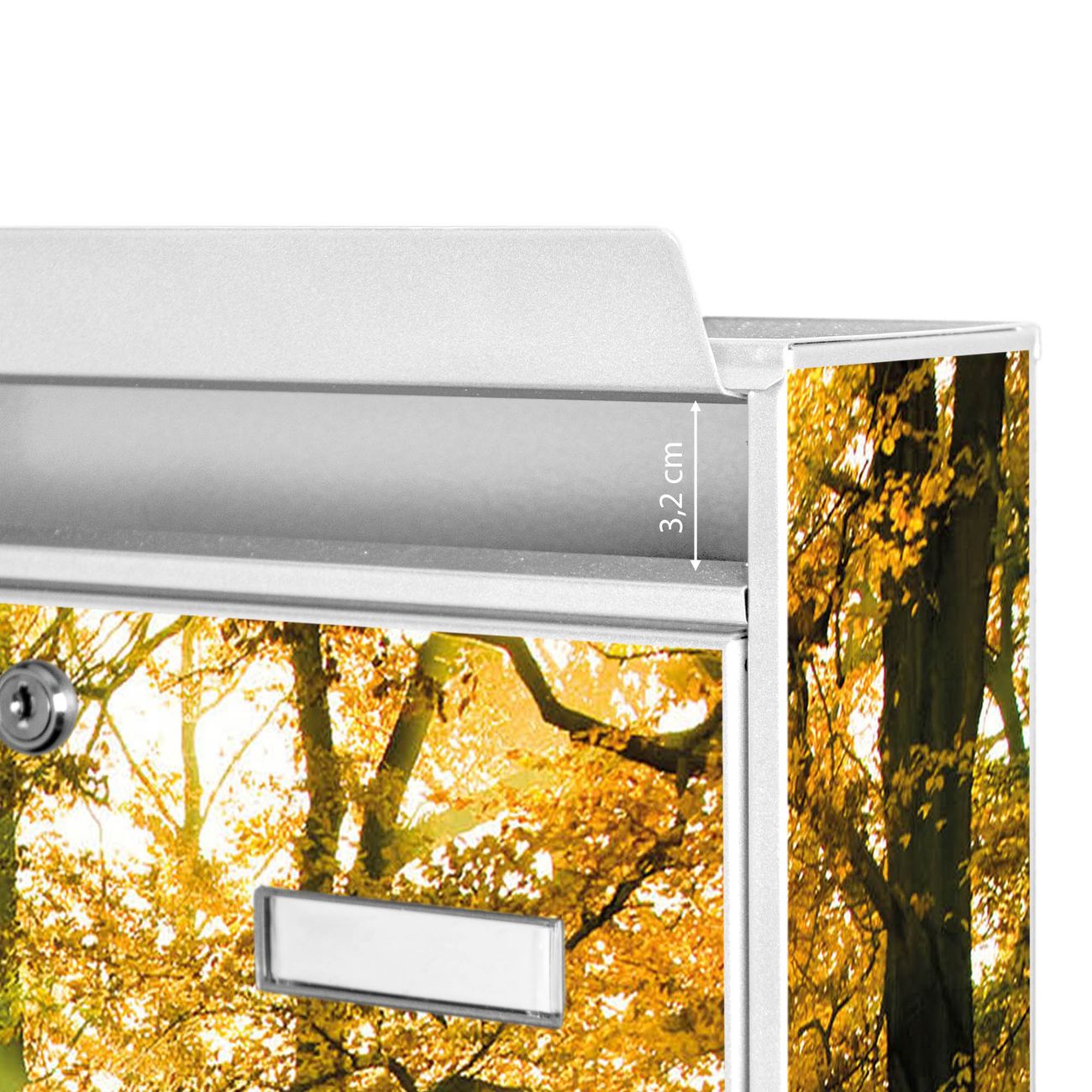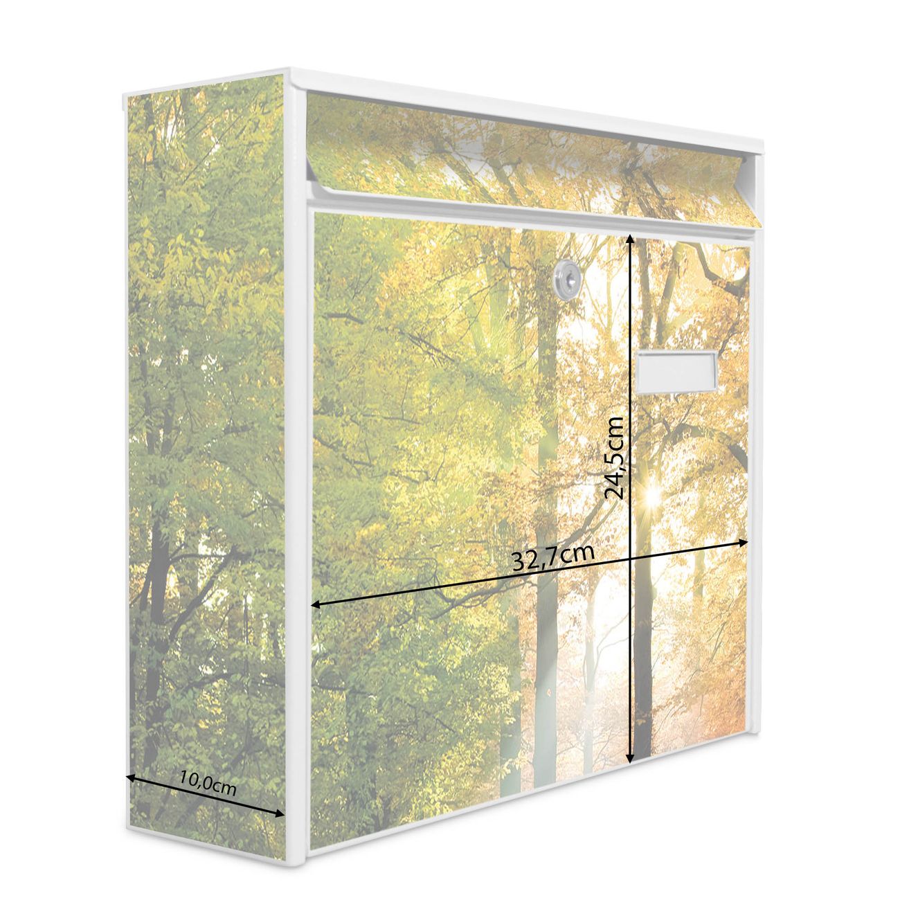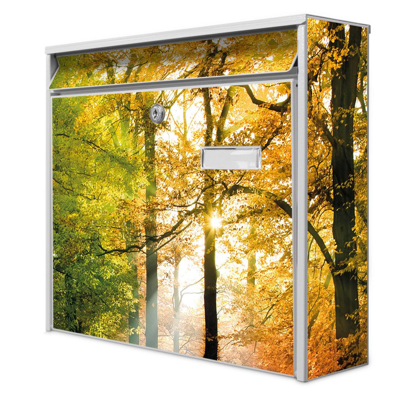 Der Burg Wächter Mail Briefkasten mit Motiv Herbstwald bietet Ihnen mit seinem Fassungsvermögen genügend Platz auch für große A4 Sendungen. Auf Wunsch können Sie bei uns den passenden Standfuß kaufen und so aus dem Wandbriefkasten einen Standbriefkasten machen. Wir bieten Ihnen ebenfalls Namensschilder, bereits beschriftet oder frei zu beschriften, und verschiedene selbst gestaltete Bitte-Keine-Werbung-Aufkleber.