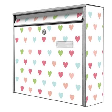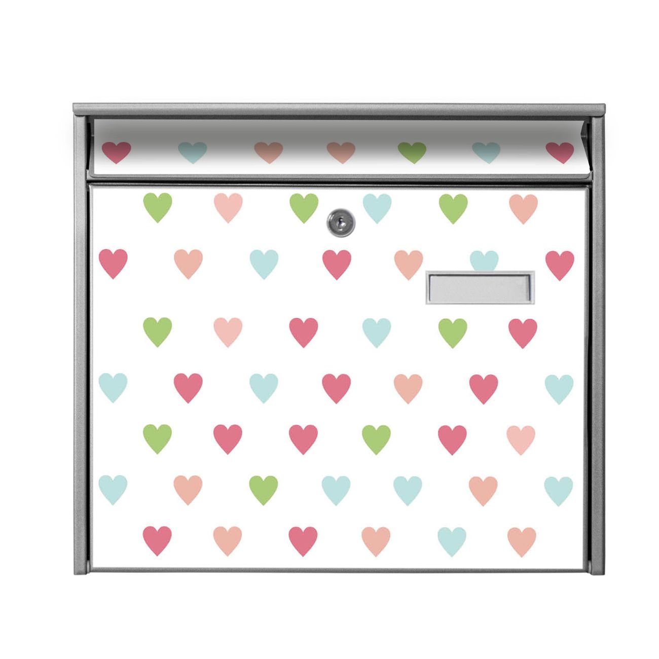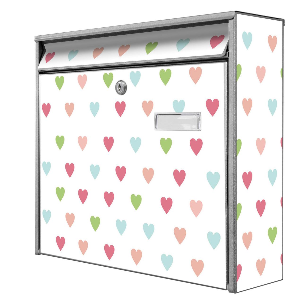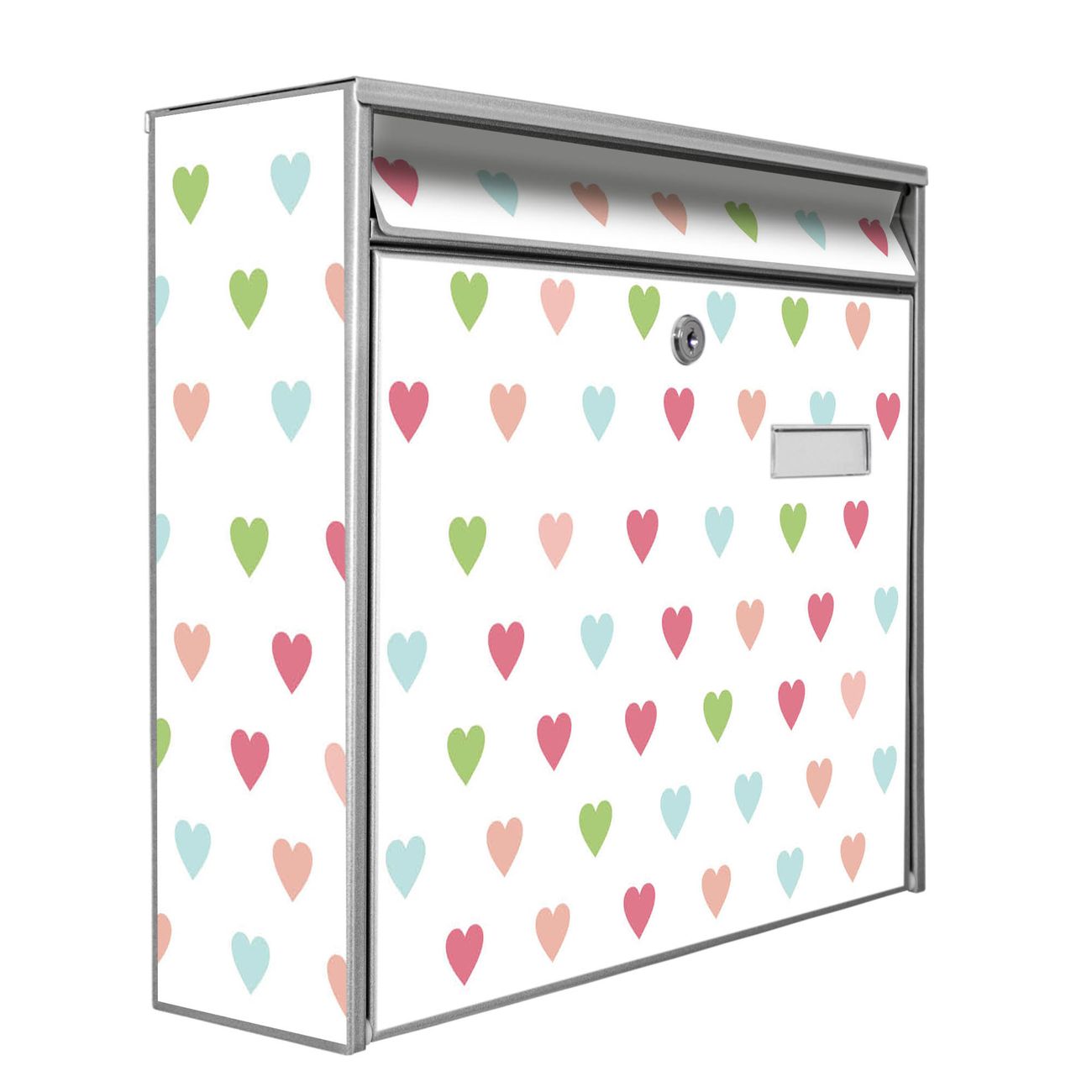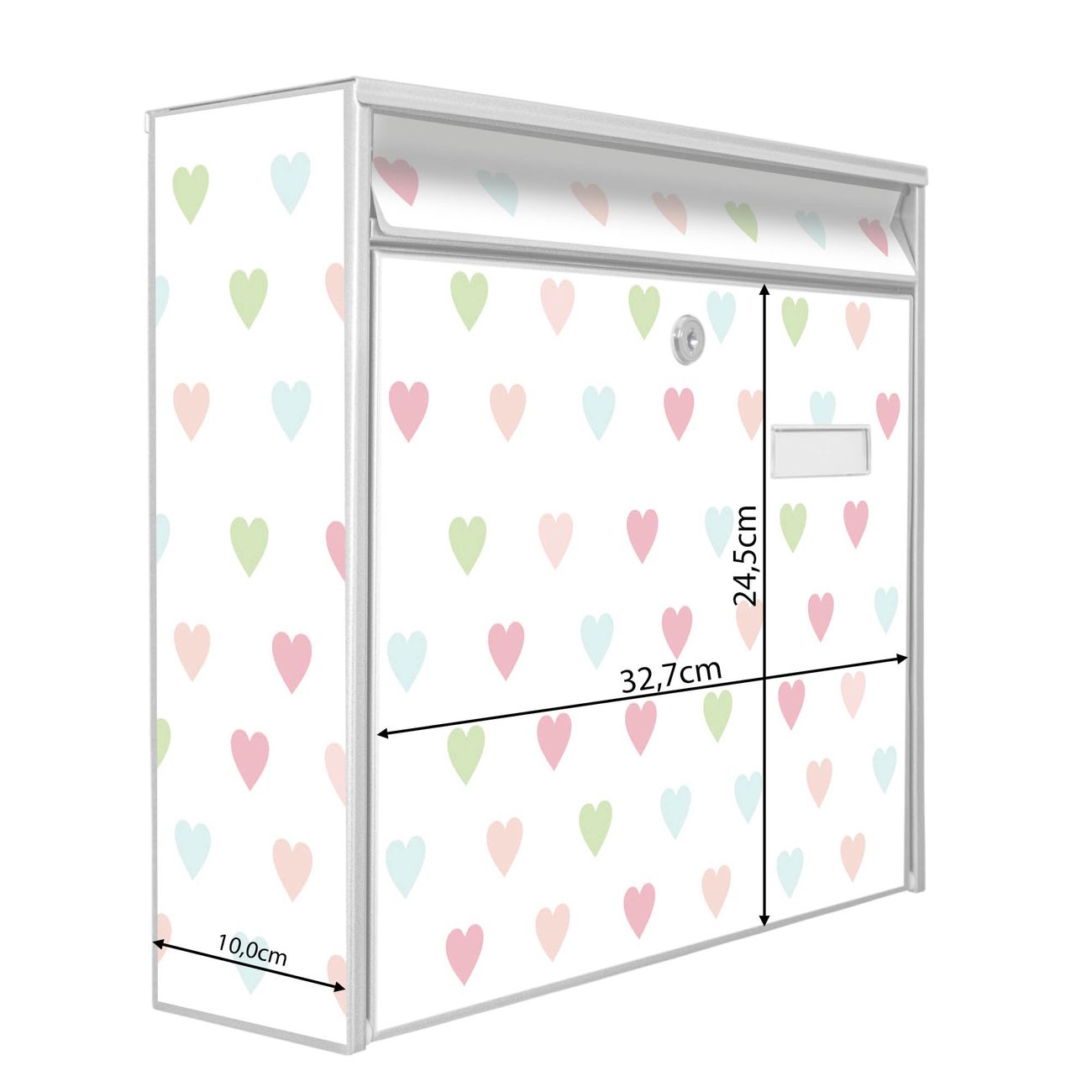 Der Burg Wächter Mail Briefkasten mit Motiv Herzen Auf Weiß bietet Ihnen mit seinem Fassungsvermögen genügend Platz auch für große A4 Sendungen. Auf Wunsch können Sie bei uns den passenden Standfuß kaufen und so aus dem Wandbriefkasten einen Standbriefkasten machen. Wir bieten Ihnen ebenfalls Namensschilder, bereits beschriftet oder frei zu beschriften, und verschiedene selbst gestaltete Bitte-Keine-Werbung-Aufkleber.