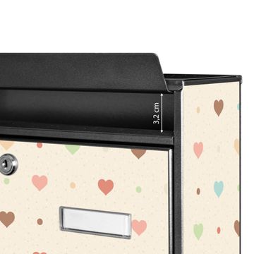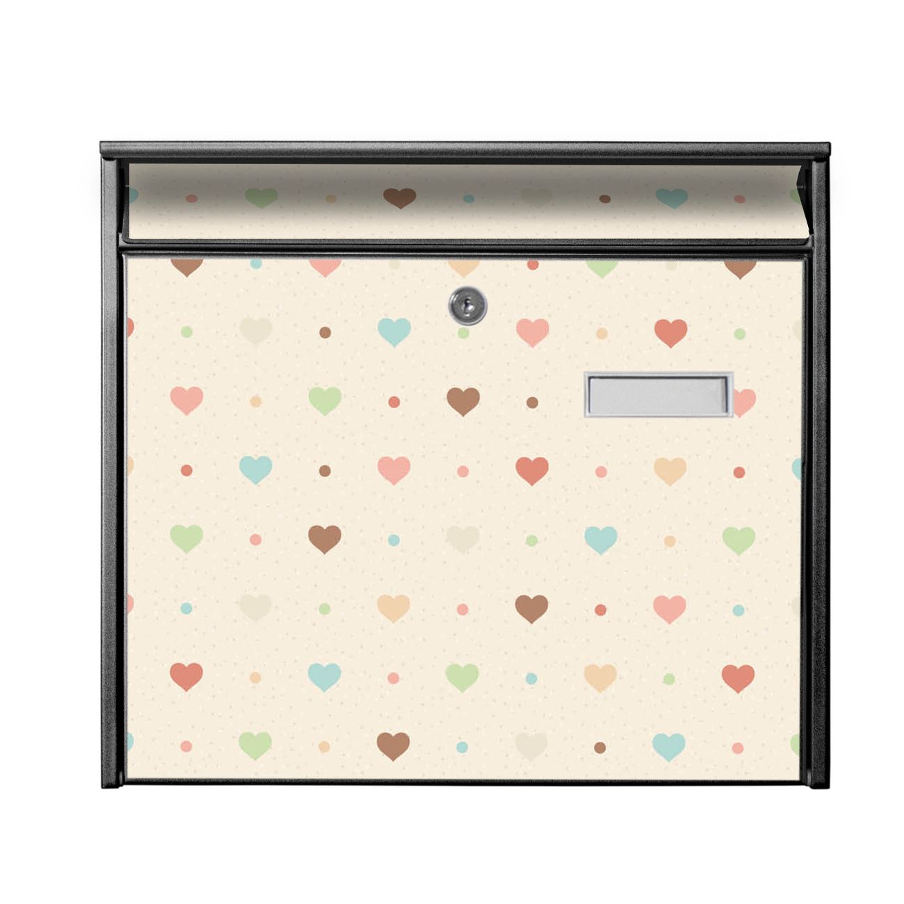 Der Burg Wächter Mail Briefkasten mit Motiv Herzen bunt bietet Ihnen mit seinem Fassungsvermögen genügend Platz auch für große A4 Sendungen. Auf Wunsch können Sie bei uns den passenden Standfuß kaufen und so aus dem Wandbriefkasten einen Standbriefkasten machen. Wir bieten Ihnen ebenfalls Namensschilder, bereits beschriftet oder frei zu beschriften, und verschiedene selbst gestaltete Bitte-Keine-Werbung-Aufkleber.