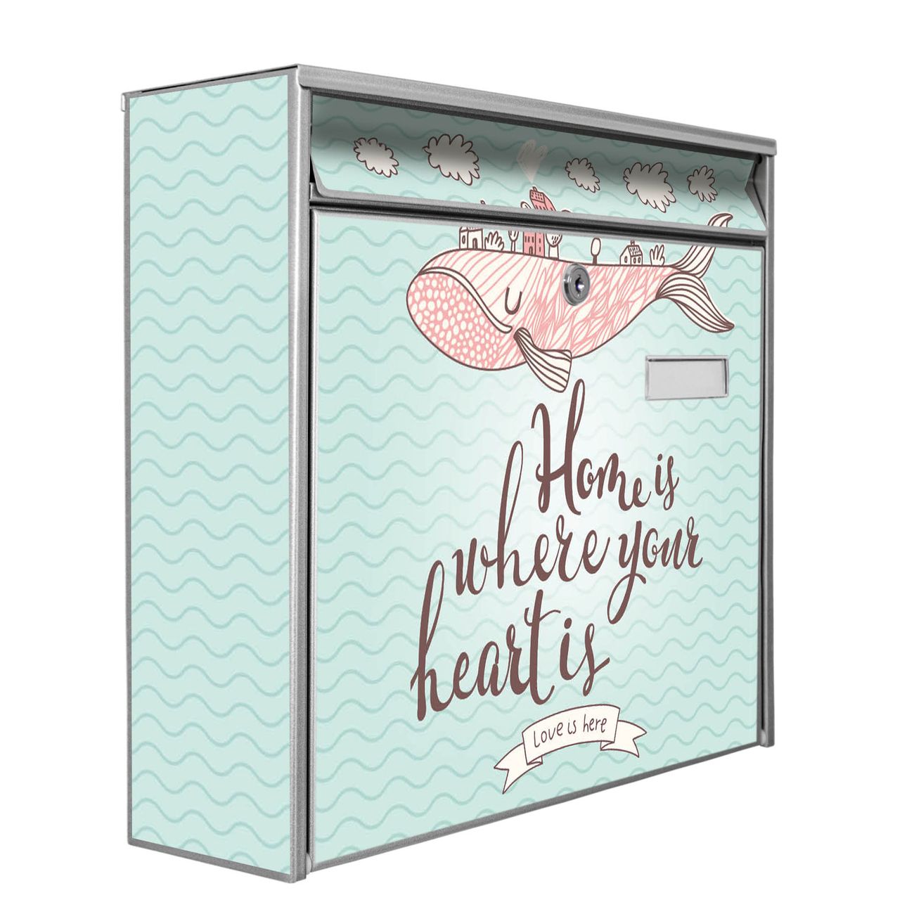 Der Burg Wächter Mail Briefkasten mit Motiv Herzensangelegenheit bietet Ihnen mit seinem Fassungsvermögen genügend Platz auch für große A4 Sendungen. Auf Wunsch können Sie bei uns den passenden Standfuß kaufen und so aus dem Wandbriefkasten einen Standbriefkasten machen. Wir bieten Ihnen ebenfalls Namensschilder, bereits beschriftet oder frei zu beschriften, und verschiedene selbst gestaltete Bitte-Keine-Werbung-Aufkleber.