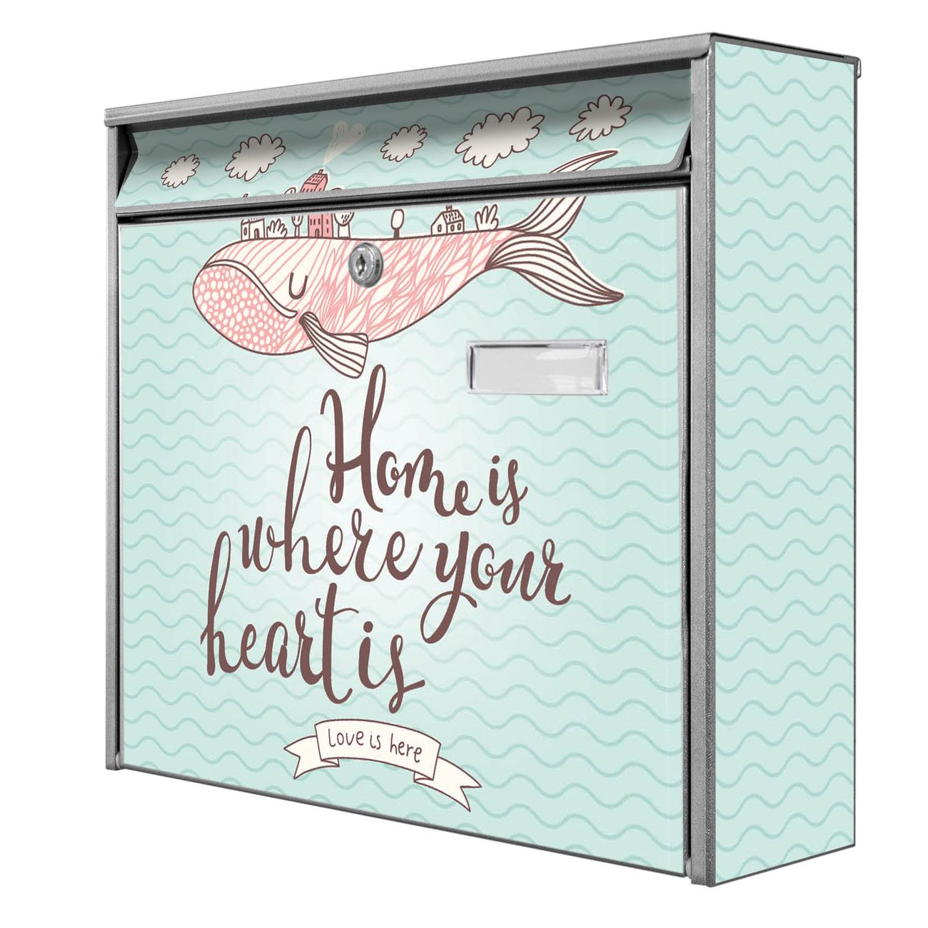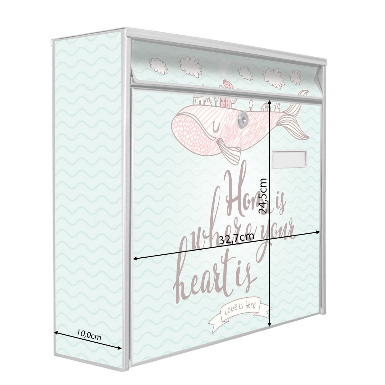 Die Größe des Briefkastens ist 36 x 32 x 10cm (BxHxT) groß. Das Motiv besteht aus einer wetter- und UV-festen Folie, die mit einem Schutzlaminat überzogen ist und Ihren Briefkasten zusätzlich vor Kratzern schützt. Sie erhalten 2 Schlüssel sowie das Montagematerial.