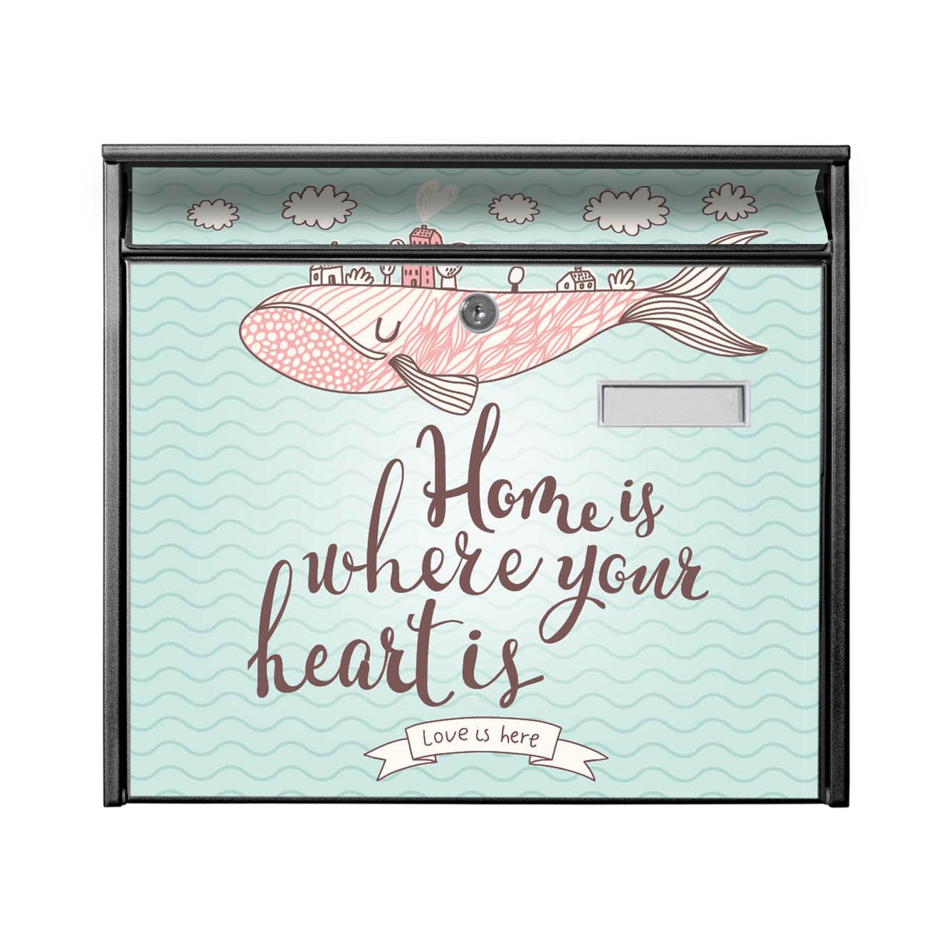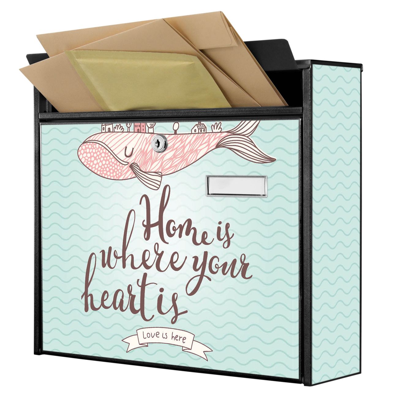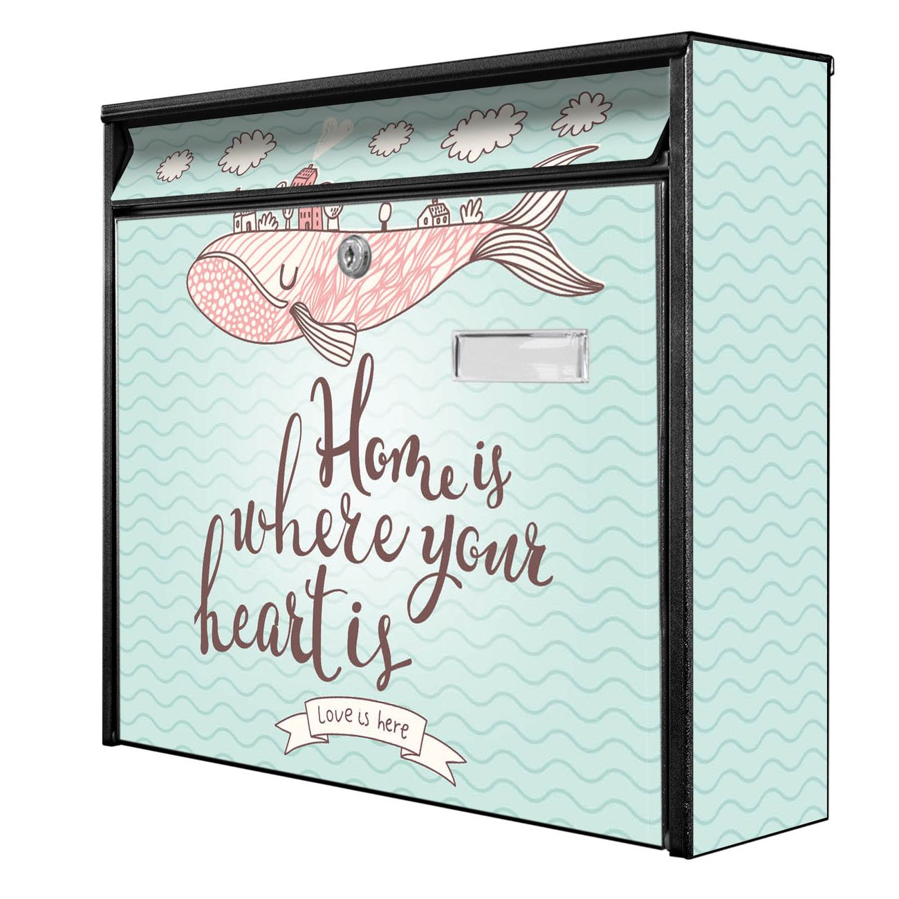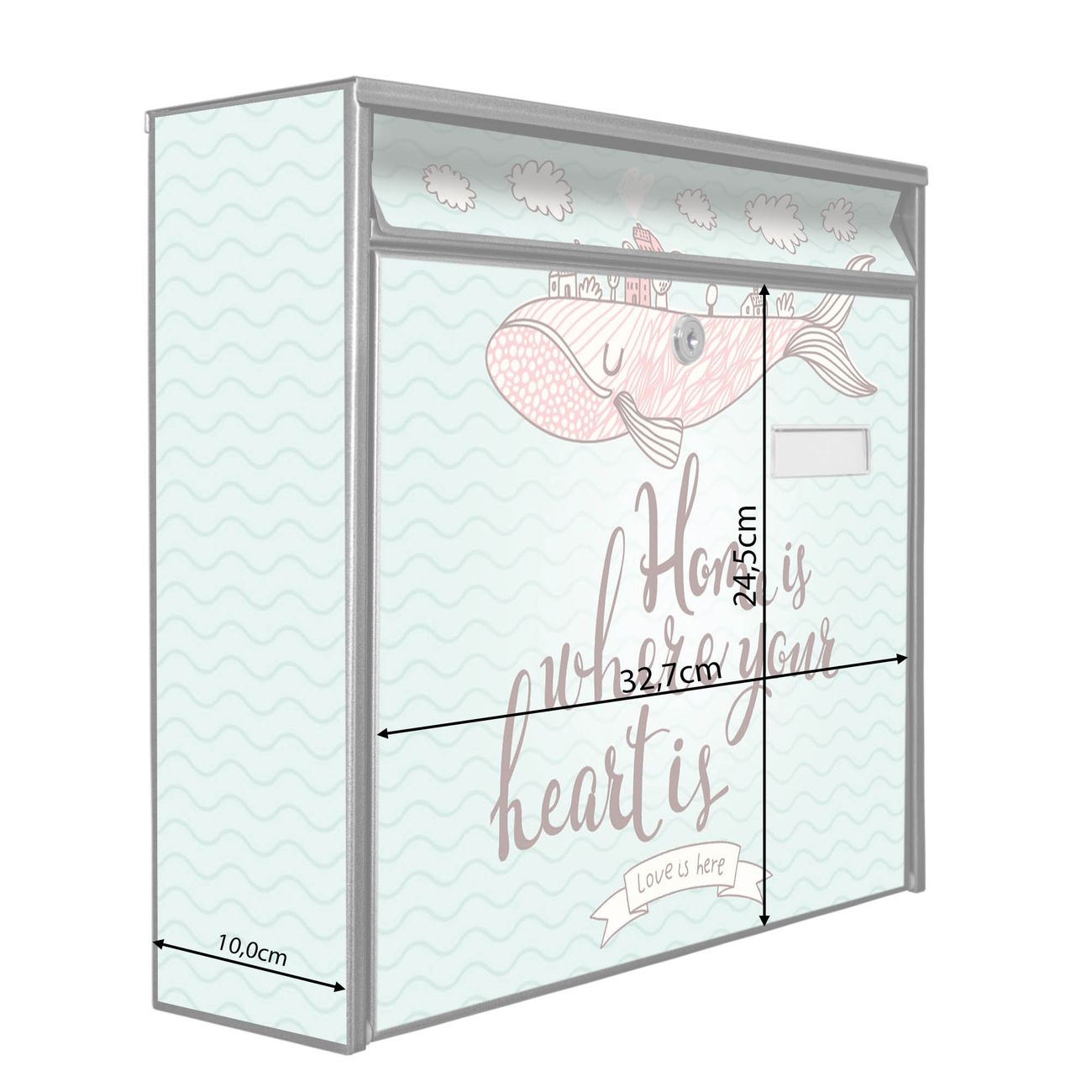 Die Größe des Briefkastens ist 36 x 32 x 10cm (BxHxT) groß. Das Motiv besteht aus einer wetter- und UV-festen Folie, die mit einem Schutzlaminat überzogen ist und Ihren Briefkasten zusätzlich vor Kratzern schützt. Sie erhalten 2 Schlüssel sowie das Montagematerial.