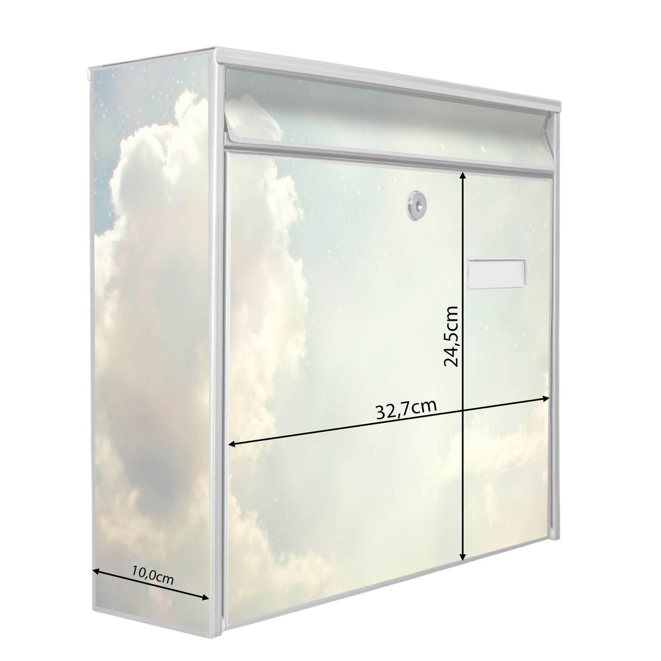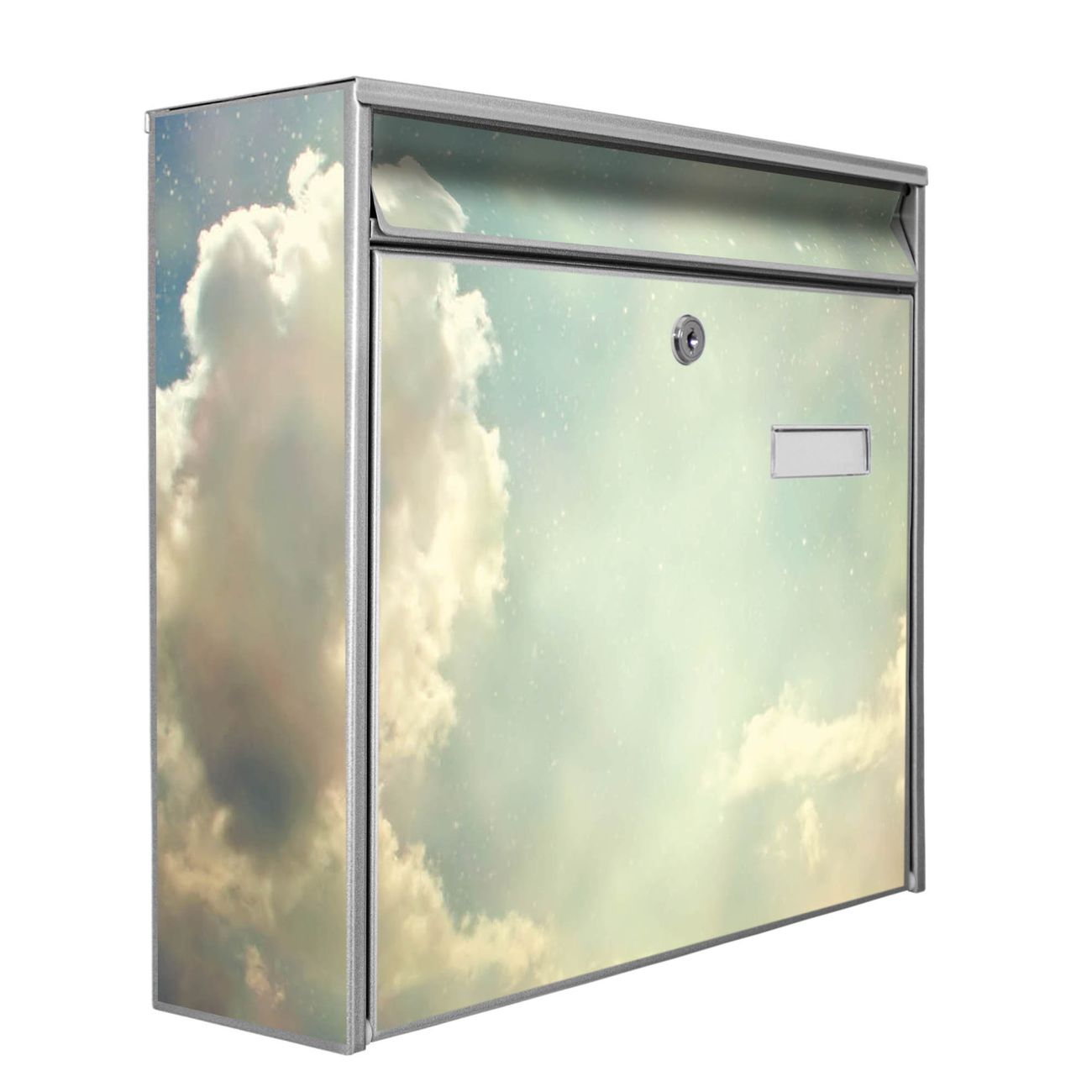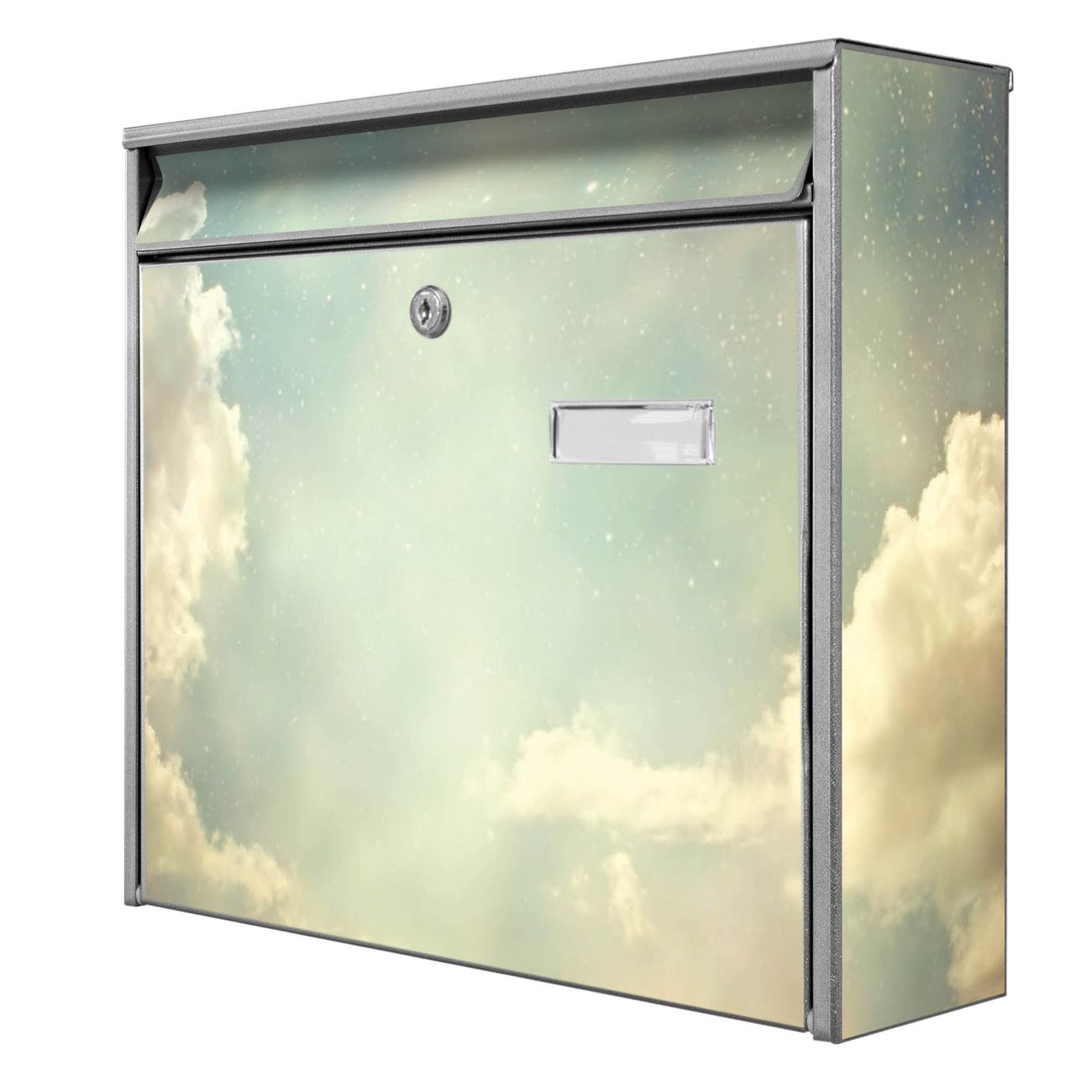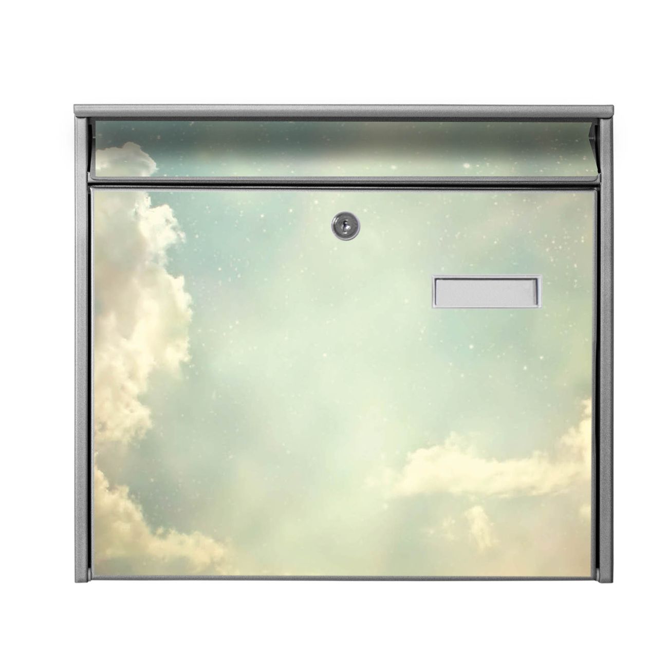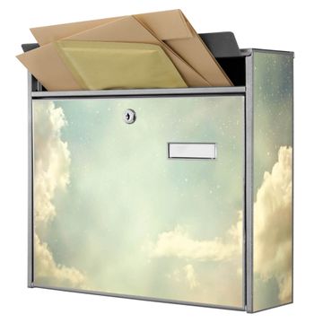 Der Burg Wächter Mail Briefkasten mit Motiv Himmel Vintage bietet Ihnen mit seinem Fassungsvermögen genügend Platz auch für große A4 Sendungen. Auf Wunsch können Sie bei uns den passenden Standfuß kaufen und so aus dem Wandbriefkasten einen Standbriefkasten machen. Wir bieten Ihnen ebenfalls Namensschilder, bereits beschriftet oder frei zu beschriften, und verschiedene selbst gestaltete Bitte-Keine-Werbung-Aufkleber.