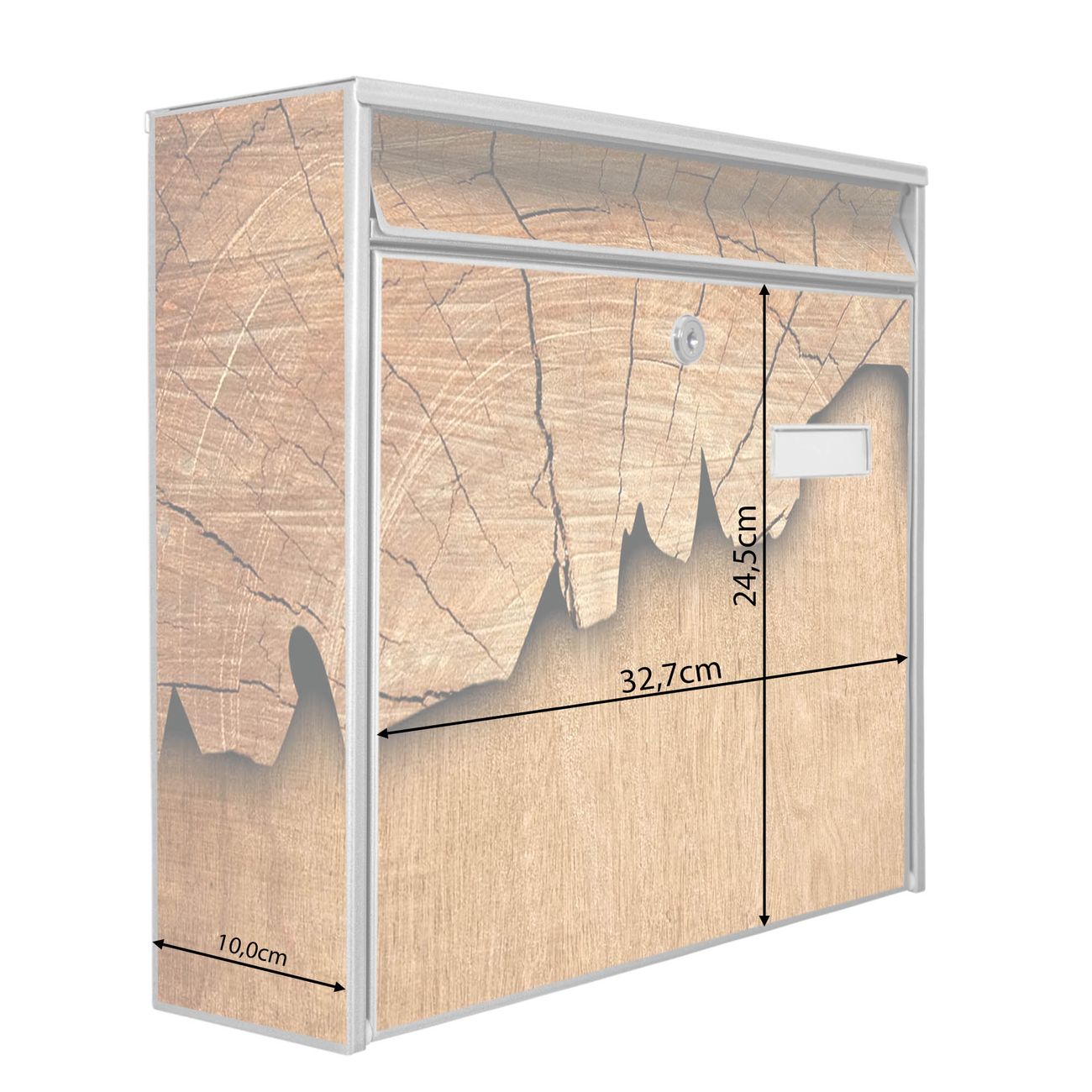 Die Größe des Briefkastens ist 36 x 32 x 10cm (BxHxT) groß. Das Motiv besteht aus einer wetter- und UV-festen Folie, die mit einem Schutzlaminat überzogen ist und Ihren Briefkasten zusätzlich vor Kratzern schützt. Sie erhalten 2 Schlüssel sowie das Montagematerial.