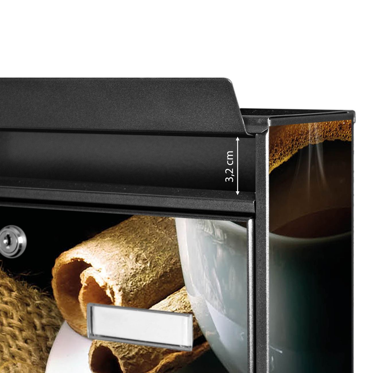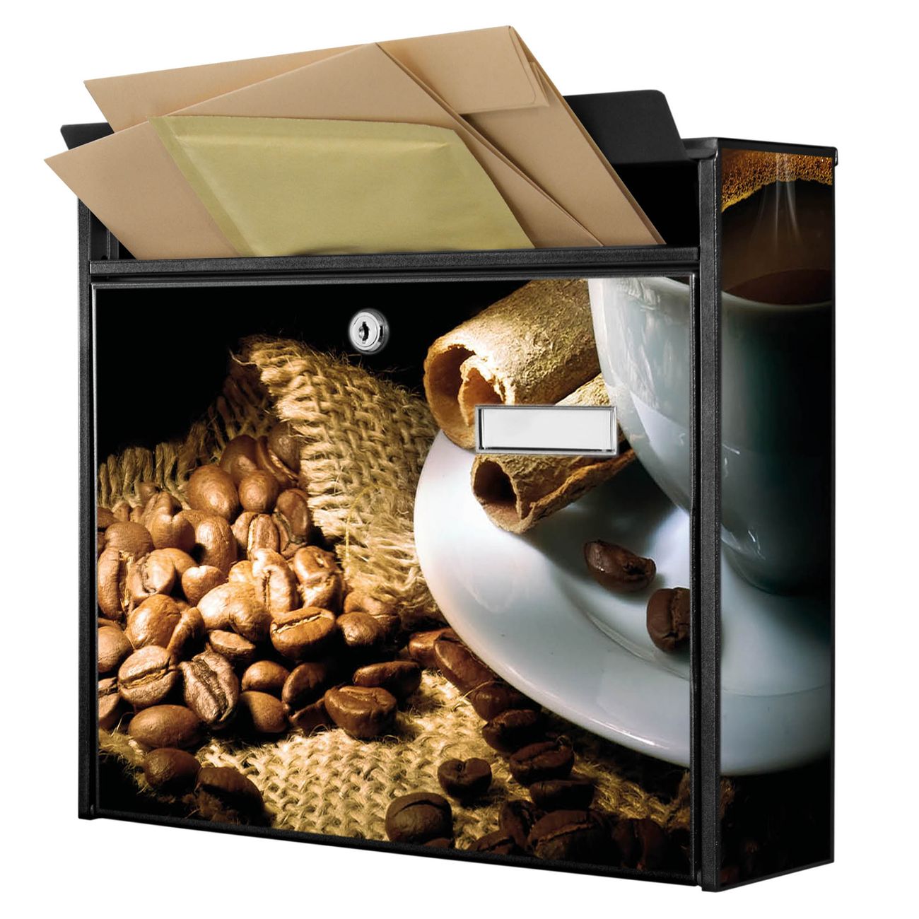 Der Postkasten mit Motiv Hot Coffee hat ein sehr ansprechendes und zeitloses Design. Heben Sie Sich von der tristen grauen Masse ab, ohne auf Funktionalität zu verzichten. Die weite Öffnung ohne scharfe Kanten ermöglicht eine einfache Handhabung beim Entnehmen der Post. Die Größe bietet genügend Platz für Sendungen aller Art, der Einwurf fasst auch größere A4 Sendungen. Ihr Burg-Wächter Motivbriefkasten wird in Sachsen in einer kleinen Manufaktur von Hand veredelt. Die Motivfolie ist lösungsmittelfrei und schutzlaminiert, dies sorgt für einen langen Halt. Wir legen großen Wert auf die Verbindung von Funktionalität und Design.