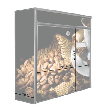 Der Burg Wächter Mail Briefkasten mit Motiv Hot Coffee bietet Ihnen mit seinem Fassungsvermögen genügend Platz auch für große A4 Sendungen. Auf Wunsch können Sie bei uns den passenden Standfuß kaufen und so aus dem Wandbriefkasten einen Standbriefkasten machen. Wir bieten Ihnen ebenfalls Namensschilder, bereits beschriftet oder frei zu beschriften, und verschiedene selbst gestaltete Bitte-Keine-Werbung-Aufkleber.