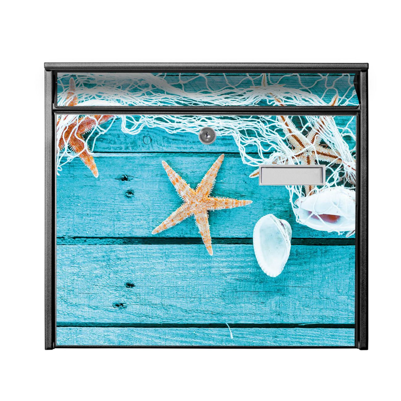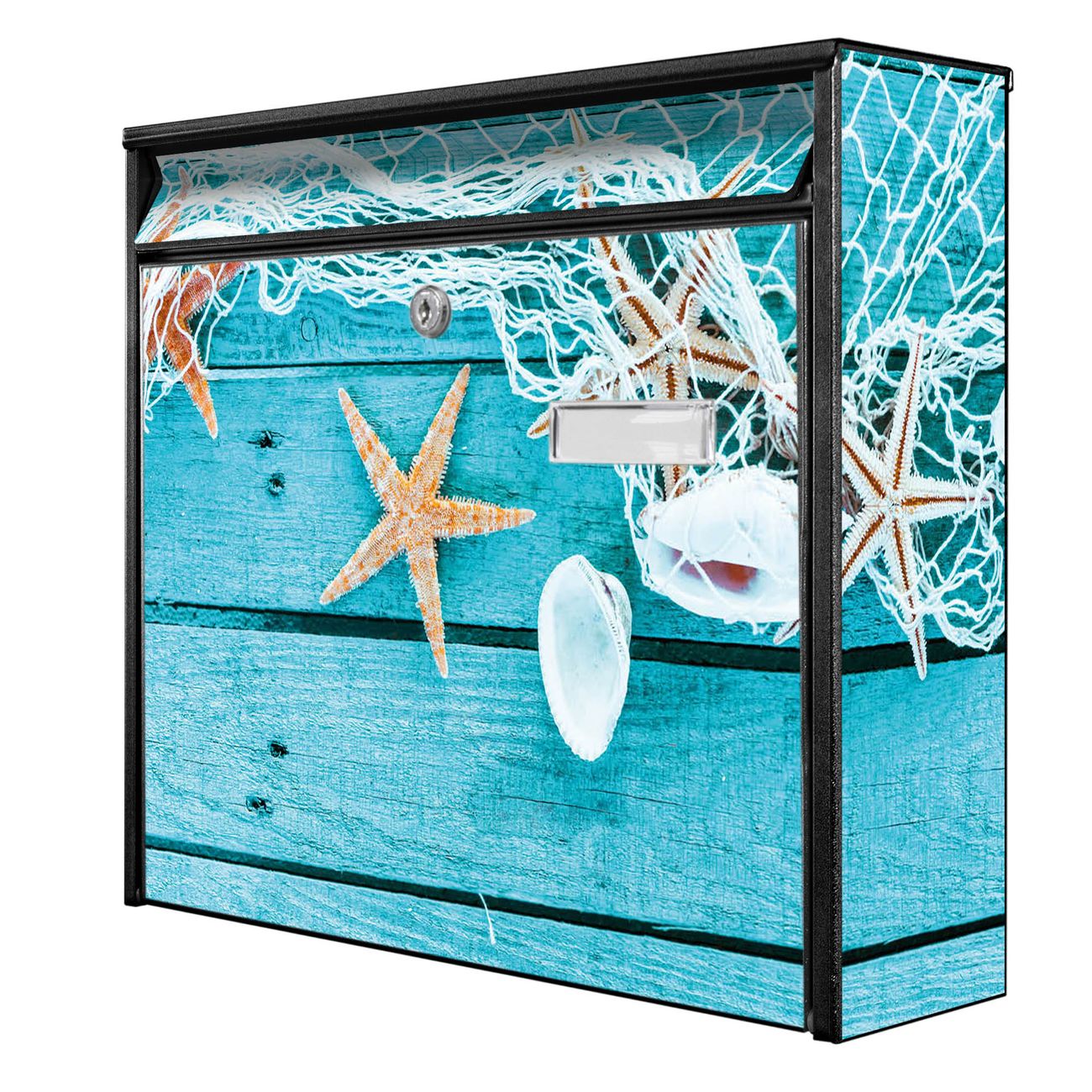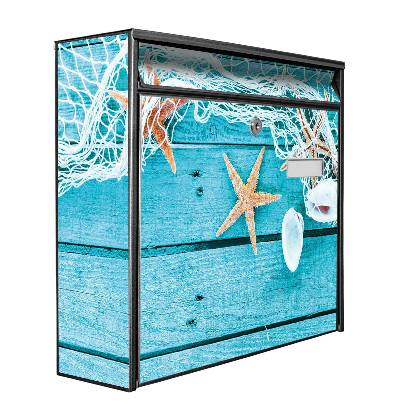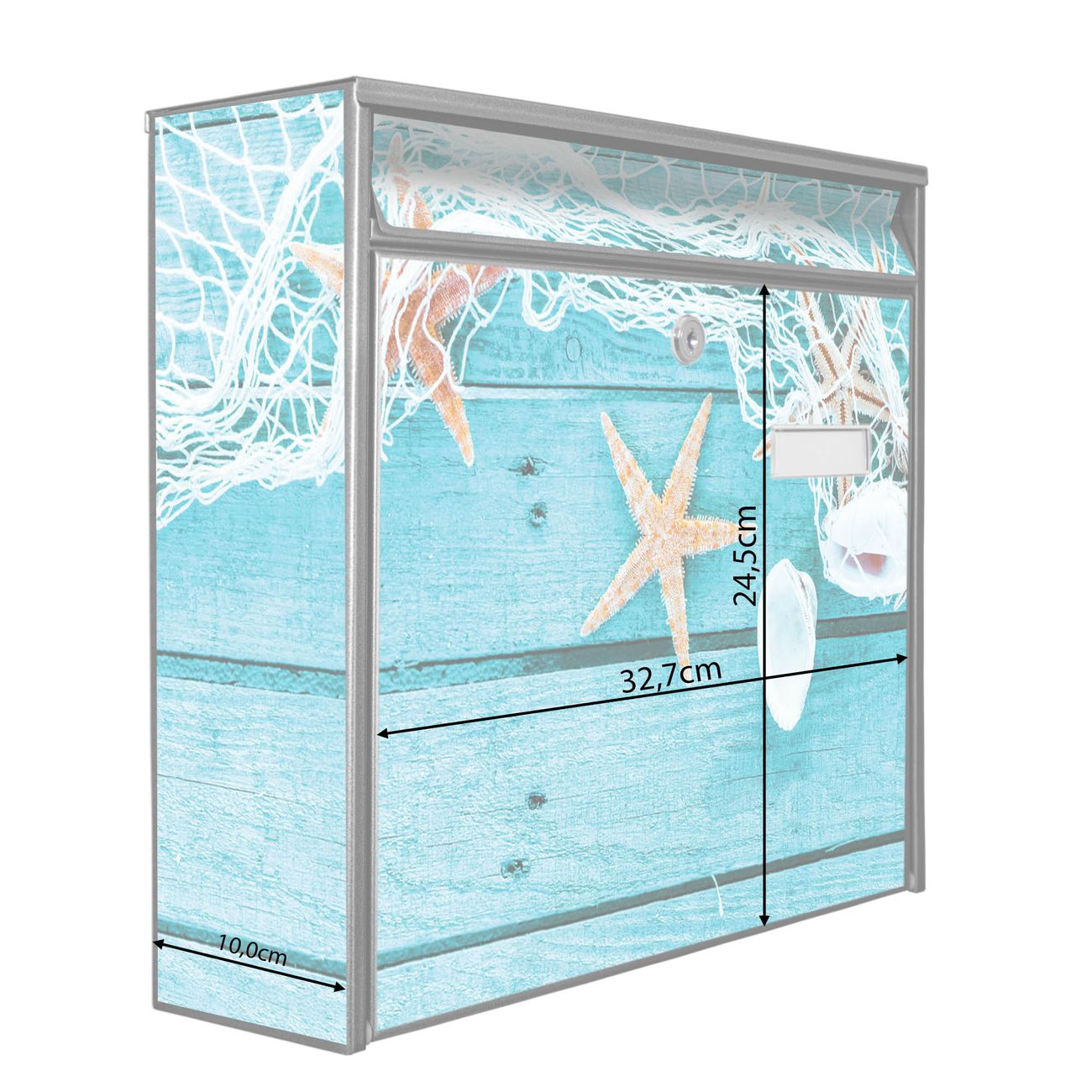 Die Größe des Briefkastens ist 36 x 32 x 10cm (BxHxT) groß. Das Motiv besteht aus einer wetter- und UV-festen Folie, die mit einem Schutzlaminat überzogen ist und Ihren Briefkasten zusätzlich vor Kratzern schützt. Sie erhalten 2 Schlüssel sowie das Montagematerial.