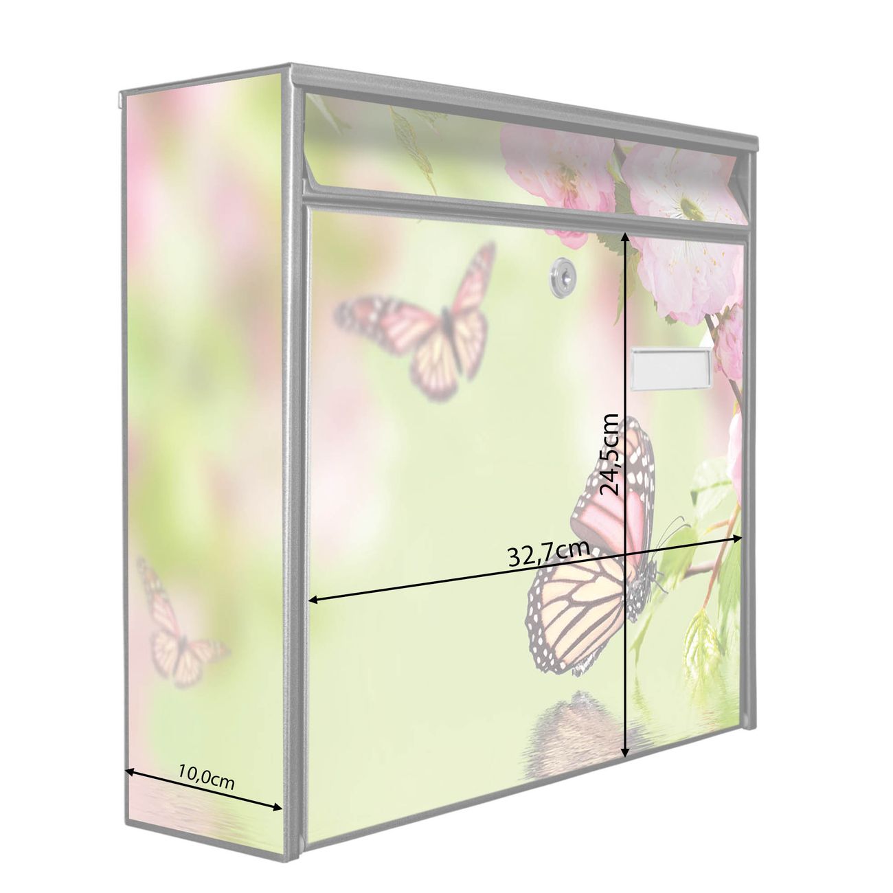 Die Größe des Briefkastens ist 36 x 32 x 10cm (BxHxT) groß. Das Motiv besteht aus einer wetter- und UV-festen Folie, die mit einem Schutzlaminat überzogen ist und Ihren Briefkasten zusätzlich vor Kratzern schützt. Sie erhalten 2 Schlüssel sowie das Montagematerial.