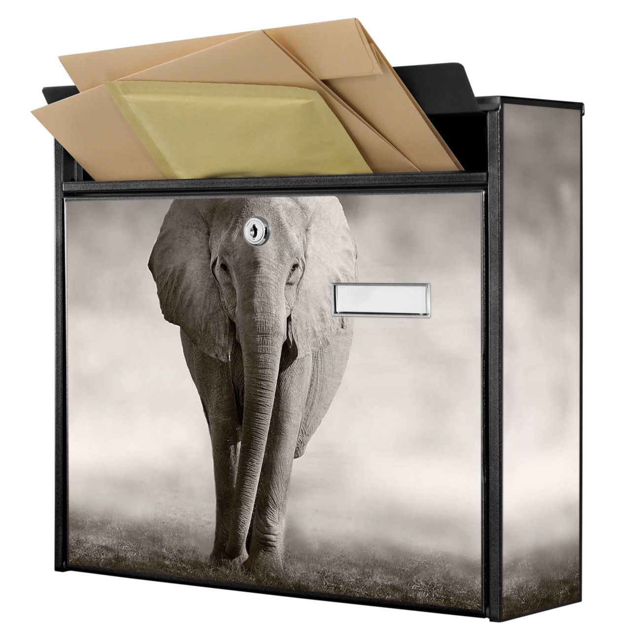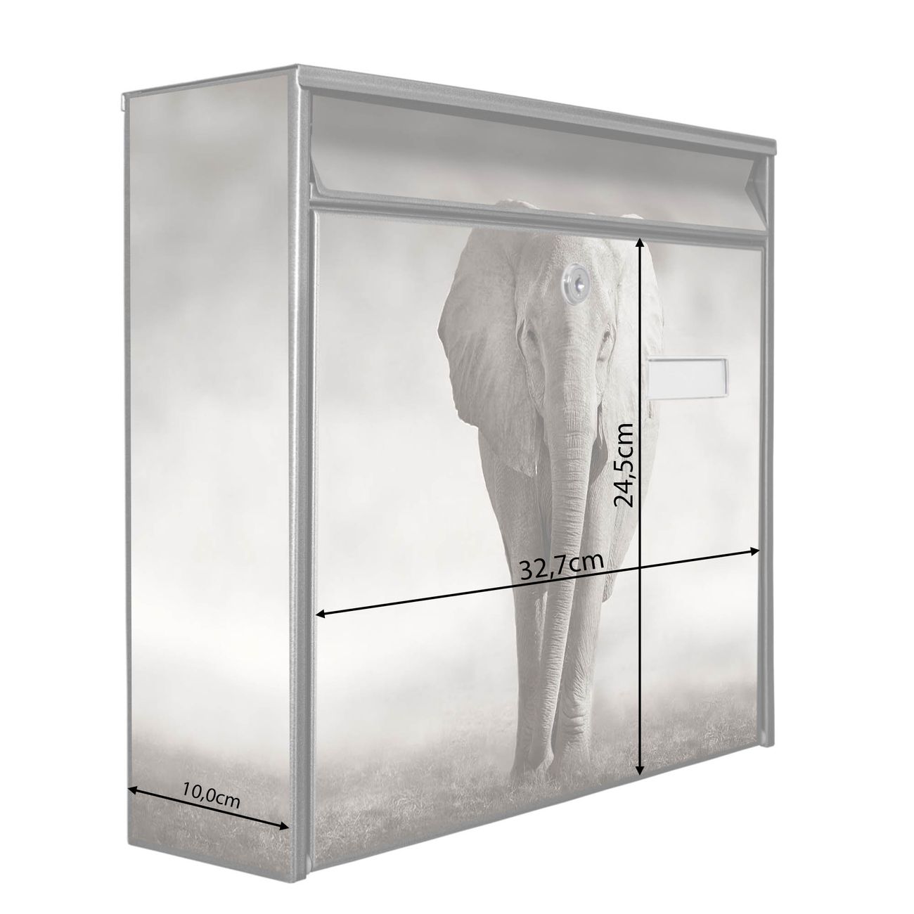 Die Größe des Briefkastens ist 36 x 32 x 10cm (BxHxT) groß. Das Motiv besteht aus einer wetter- und UV-festen Folie, die mit einem Schutzlaminat überzogen ist und Ihren Briefkasten zusätzlich vor Kratzern schützt. Sie erhalten 2 Schlüssel sowie das Montagematerial.
