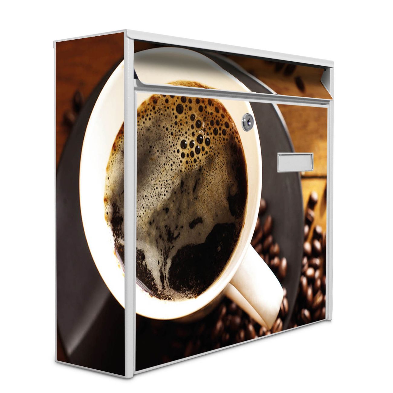 Der Postkasten mit Motiv Kaffee&Schokolade hat ein sehr ansprechendes und zeitloses Design. Heben Sie Sich von der tristen grauen Masse ab, ohne auf Funktionalität zu verzichten. Die weite Öffnung ohne scharfe Kanten ermöglicht eine einfache Handhabung beim Entnehmen der Post. Die Größe bietet genügend Platz für Sendungen aller Art, der Einwurf fasst auch größere A4 Sendungen. Ihr Burg-Wächter Motivbriefkasten wird in Sachsen in einer kleinen Manufaktur von Hand veredelt. Die Motivfolie ist lösungsmittelfrei und schutzlaminiert, dies sorgt für einen langen Halt. Wir legen großen Wert auf die Verbindung von Funktionalität und Design.
