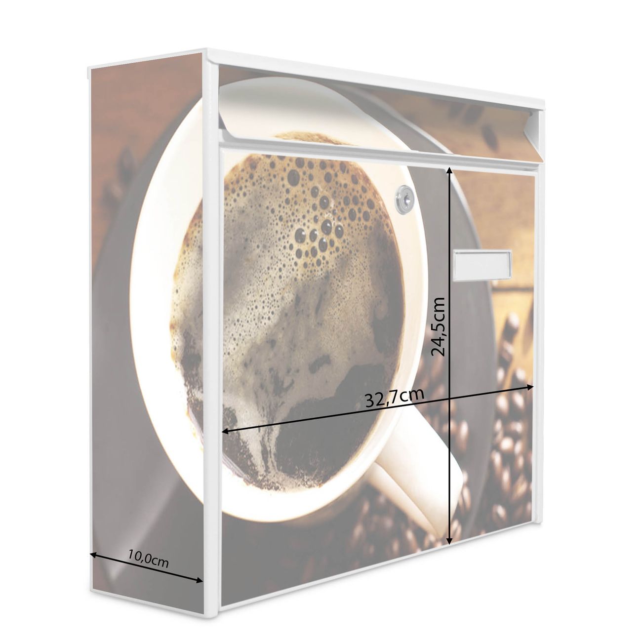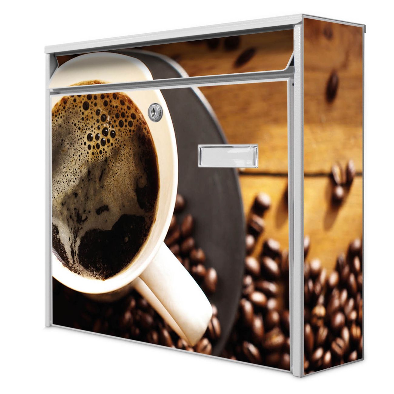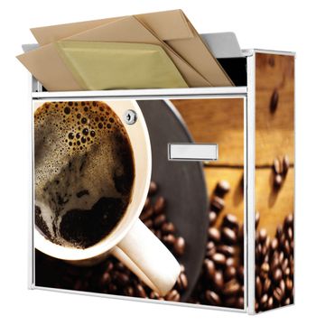 Der Burg Wächter Mail Briefkasten mit Motiv Kaffee&Schokolade bietet Ihnen mit seinem Fassungsvermögen genügend Platz auch für große A4 Sendungen. Auf Wunsch können Sie bei uns den passenden Standfuß kaufen und so aus dem Wandbriefkasten einen Standbriefkasten machen. Wir bieten Ihnen ebenfalls Namensschilder, bereits beschriftet oder frei zu beschriften, und verschiedene selbst gestaltete Bitte-Keine-Werbung-Aufkleber.