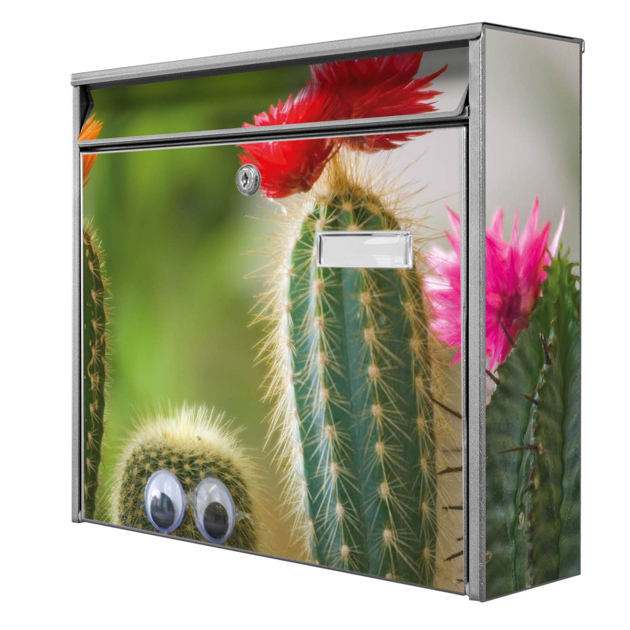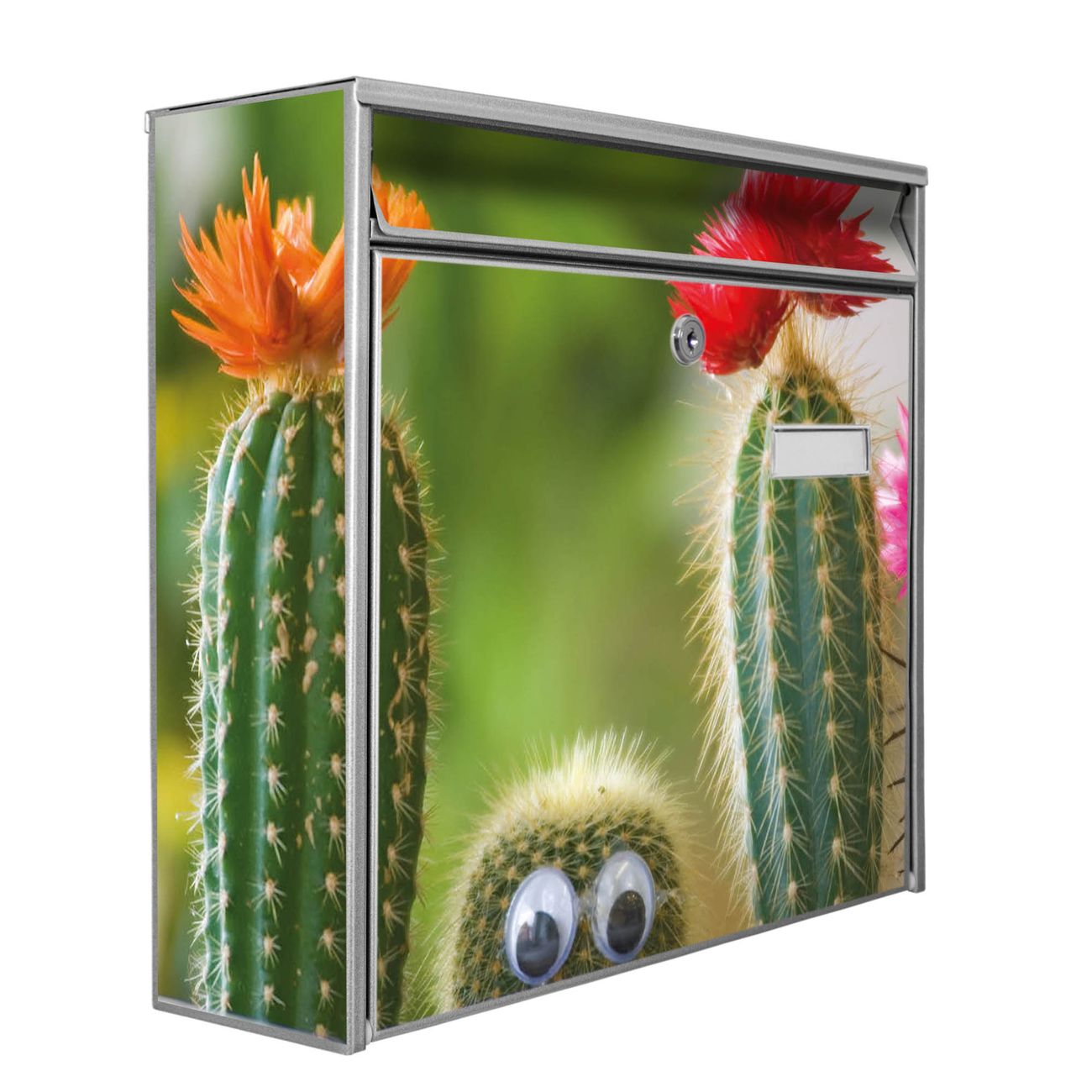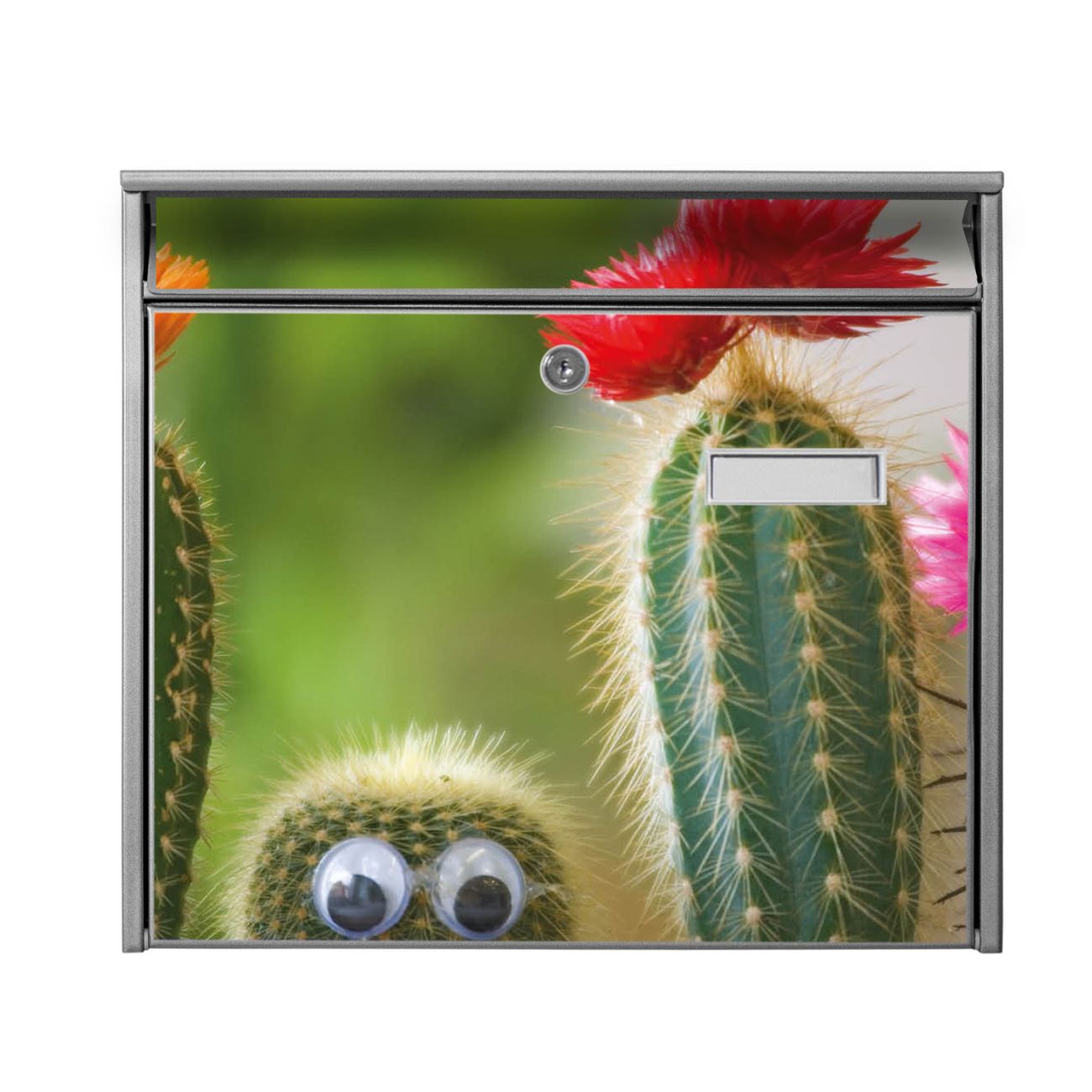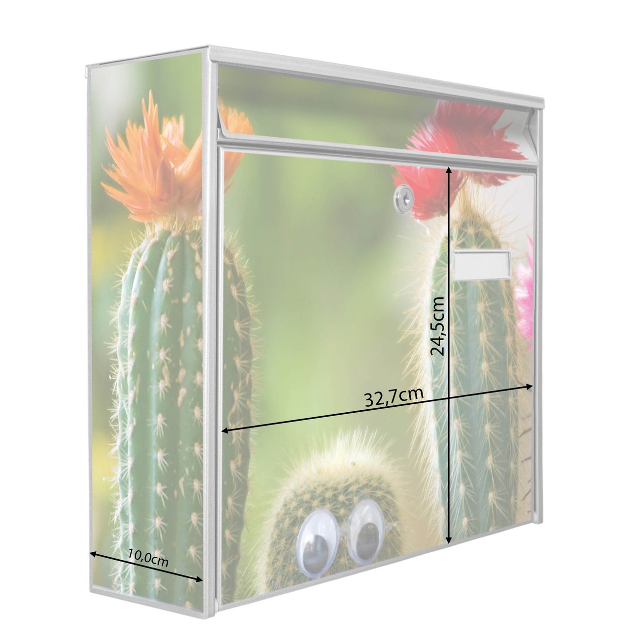 Der Burg Wächter Mail Briefkasten mit Motiv Kakteen bietet Ihnen mit seinem Fassungsvermögen genügend Platz auch für große A4 Sendungen. Auf Wunsch können Sie bei uns den passenden Standfuß kaufen und so aus dem Wandbriefkasten einen Standbriefkasten machen. Wir bieten Ihnen ebenfalls Namensschilder, bereits beschriftet oder frei zu beschriften, und verschiedene selbst gestaltete Bitte-Keine-Werbung-Aufkleber.