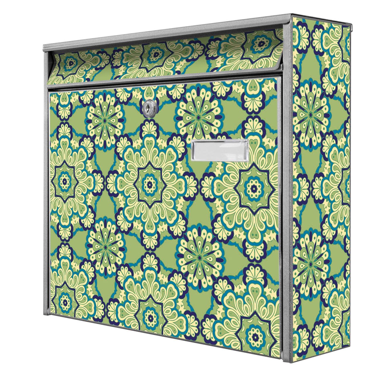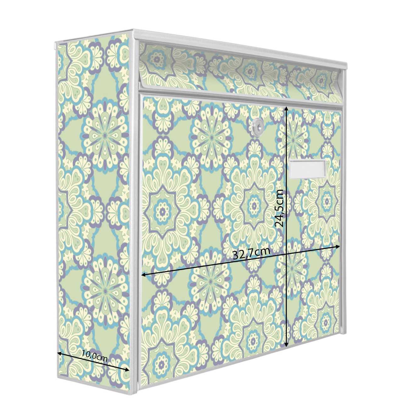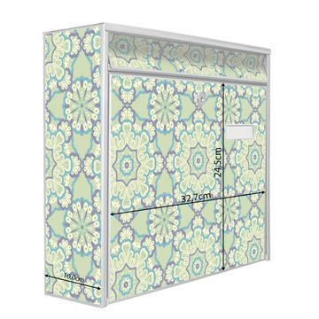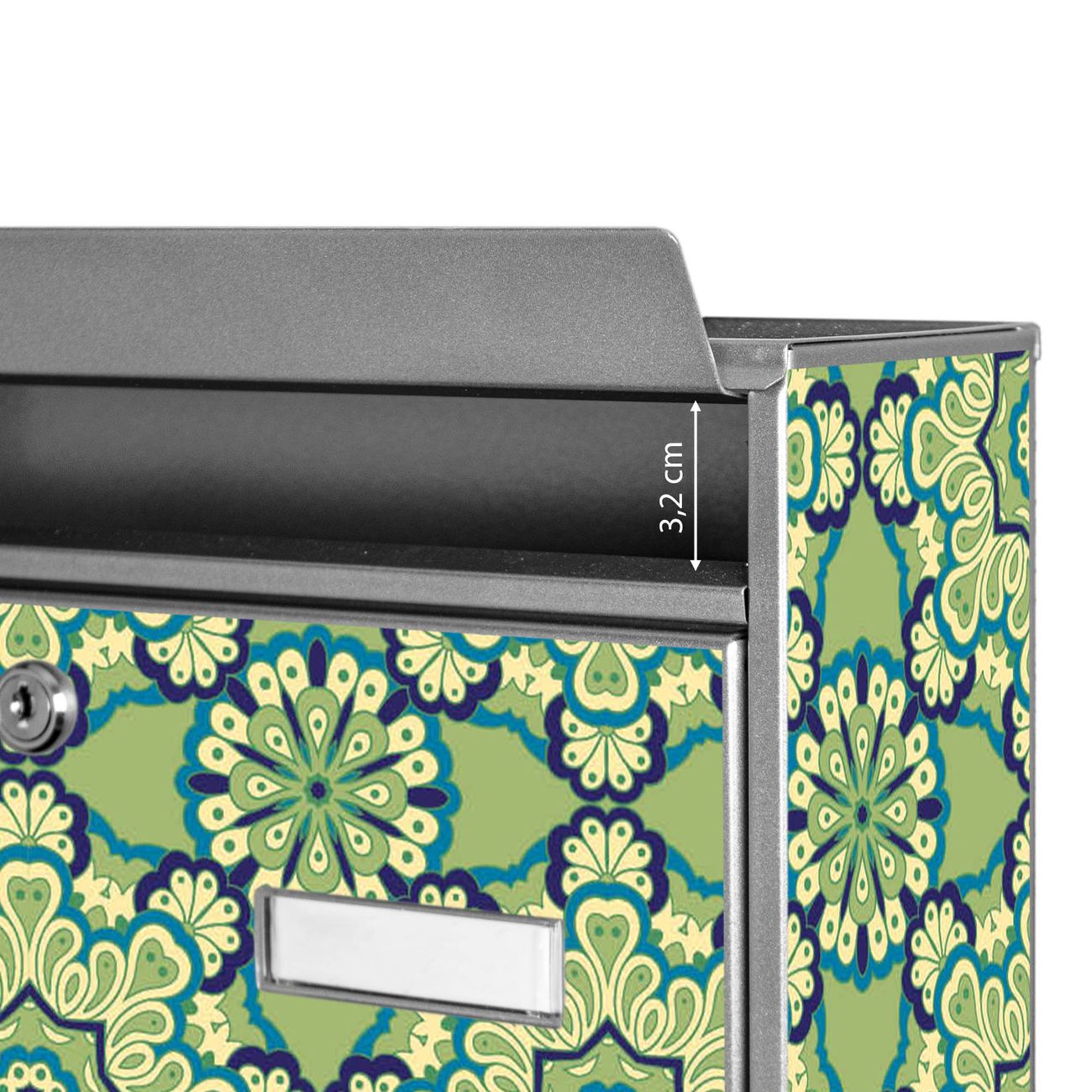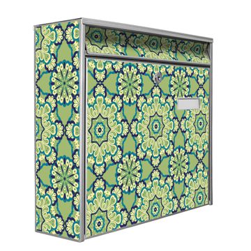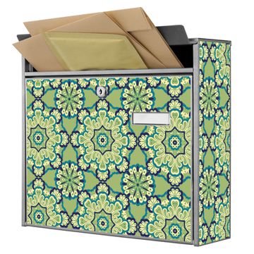Der Burg Wächter Mail Briefkasten mit Motiv Kaleidoscop Grün bietet Ihnen mit seinem Fassungsvermögen genügend Platz auch für große A4 Sendungen. Auf Wunsch können Sie bei uns den passenden Standfuß kaufen und so aus dem Wandbriefkasten einen Standbriefkasten machen. Wir bieten Ihnen ebenfalls Namensschilder, bereits beschriftet oder frei zu beschriften, und verschiedene selbst gestaltete Bitte-Keine-Werbung-Aufkleber.