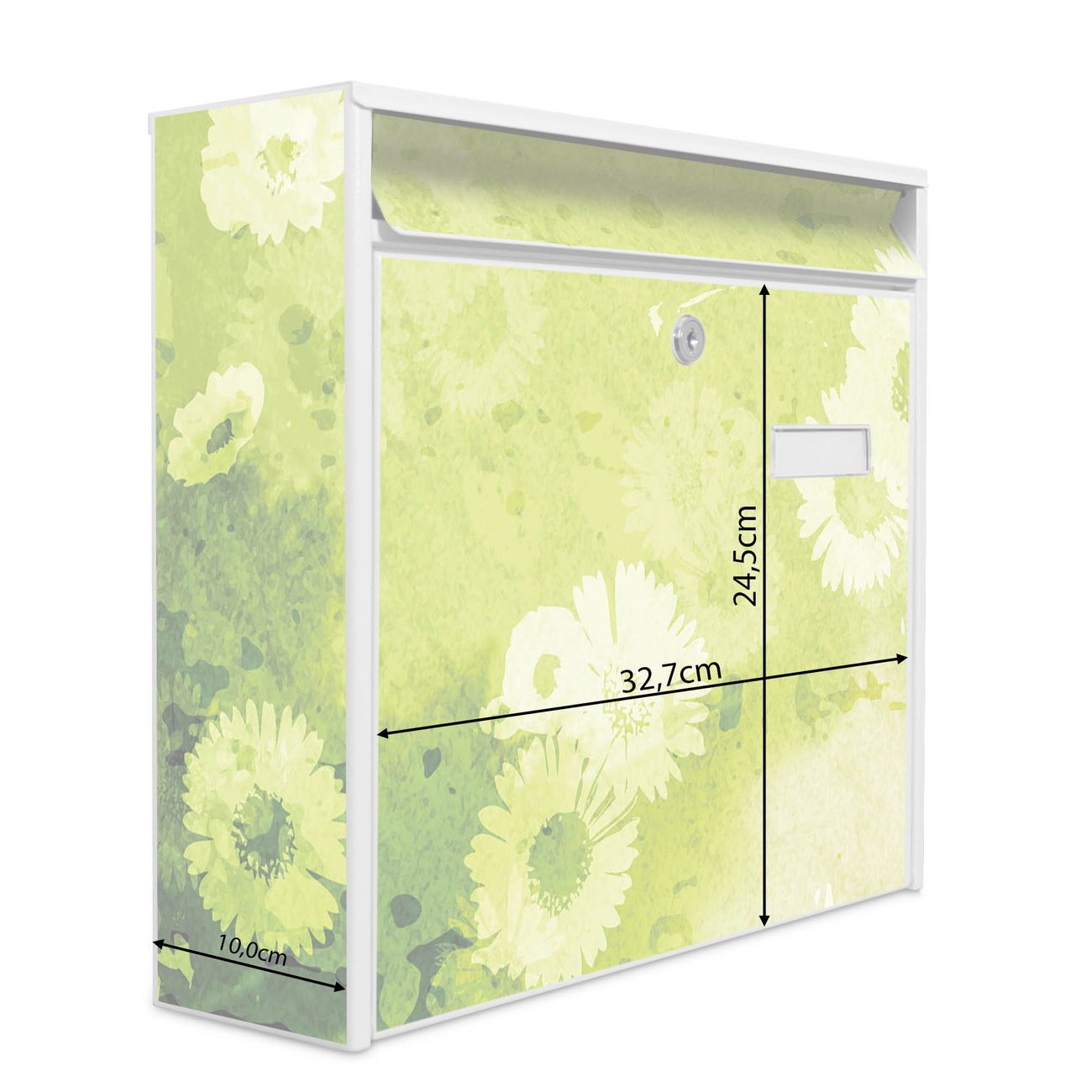 Die Größe des Briefkastens ist 36 x 32 x 10cm (BxHxT) groß. Das Motiv besteht aus einer wetter- und UV-festen Folie, die mit einem Schutzlaminat überzogen ist und Ihren Briefkasten zusätzlich vor Kratzern schützt. Sie erhalten 2 Schlüssel sowie das Montagematerial.