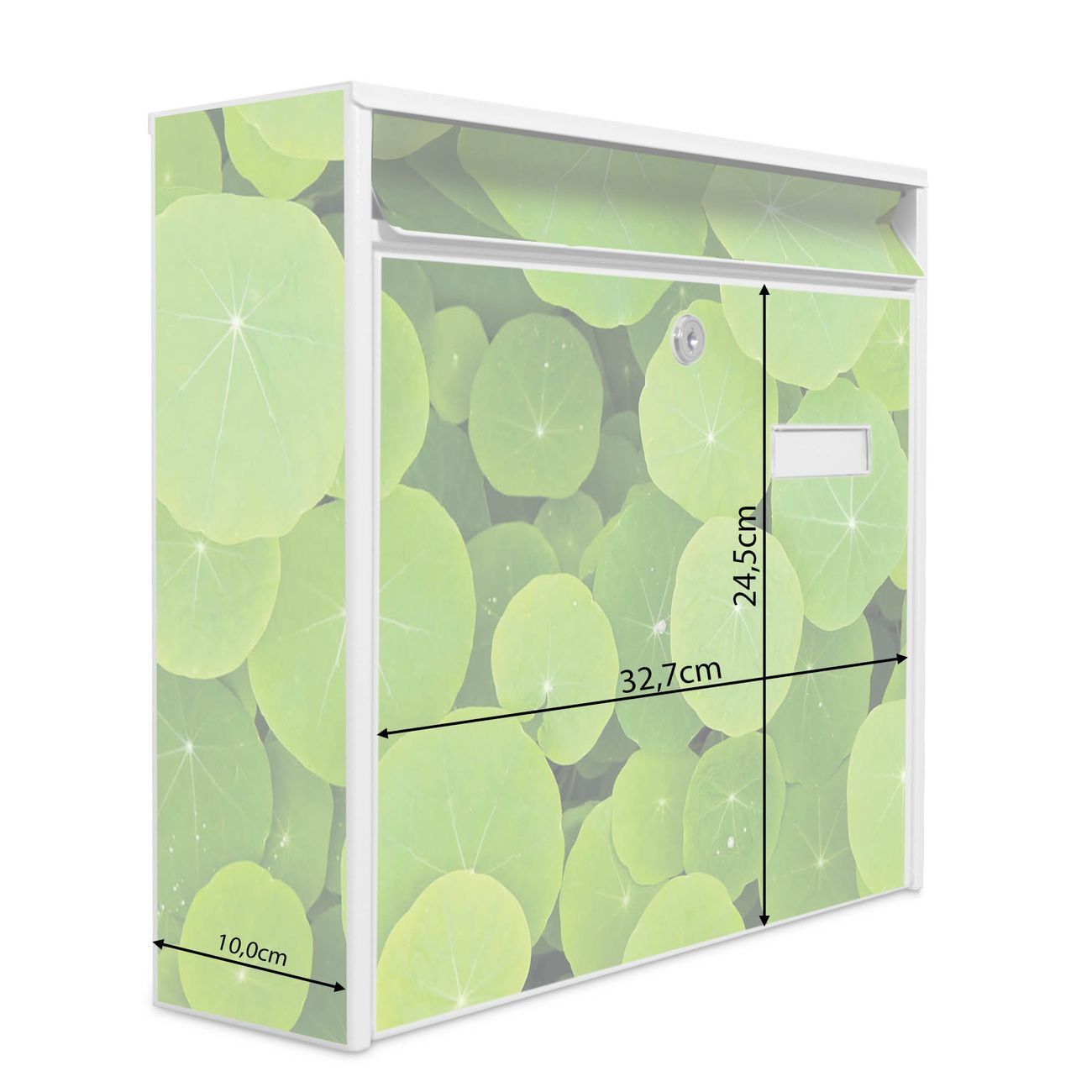 Die Größe des Briefkastens ist 36 x 32 x 10cm (BxHxT) groß. Das Motiv besteht aus einer wetter- und UV-festen Folie, die mit einem Schutzlaminat überzogen ist und Ihren Briefkasten zusätzlich vor Kratzern schützt. Sie erhalten 2 Schlüssel sowie das Montagematerial.