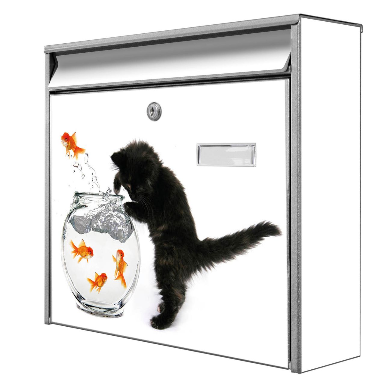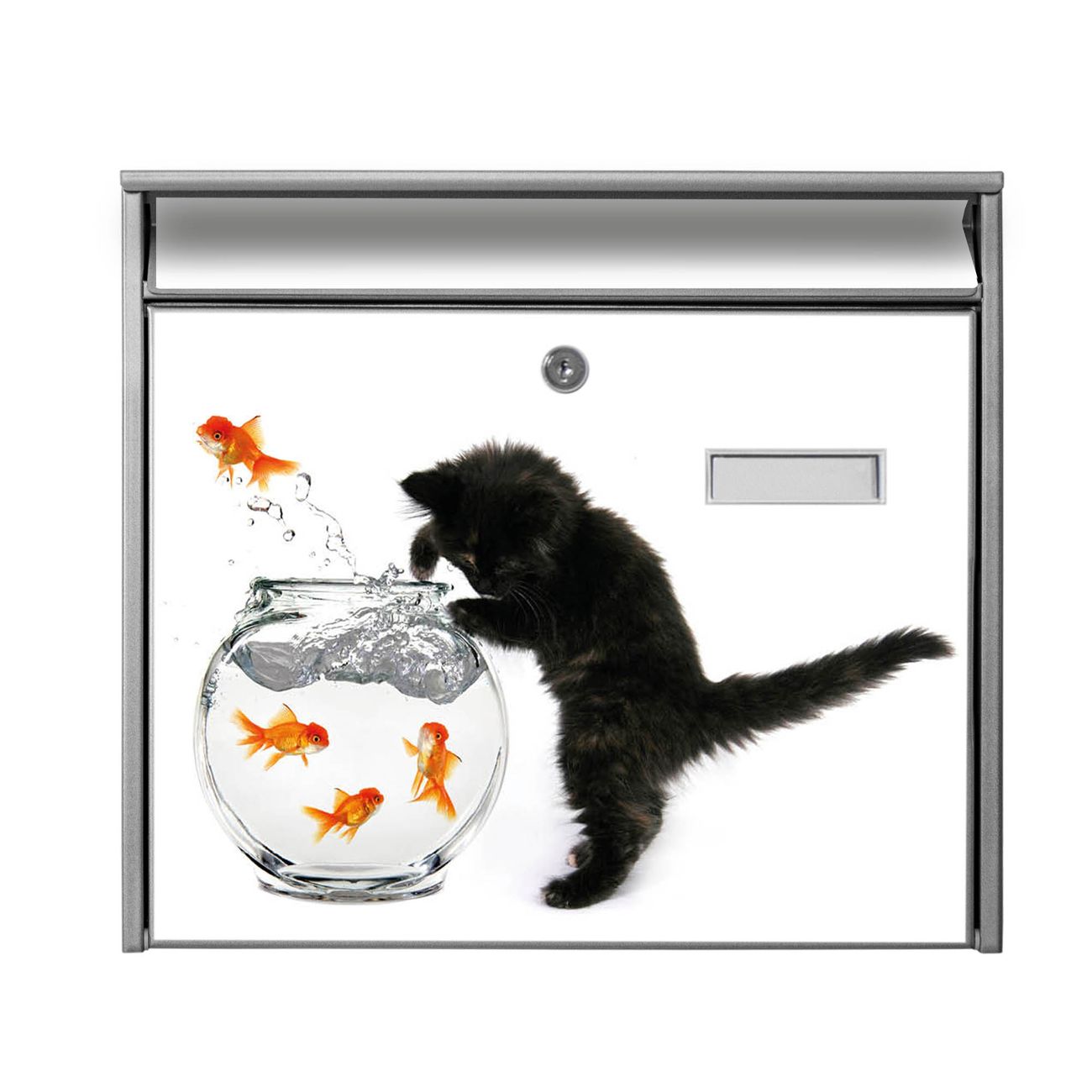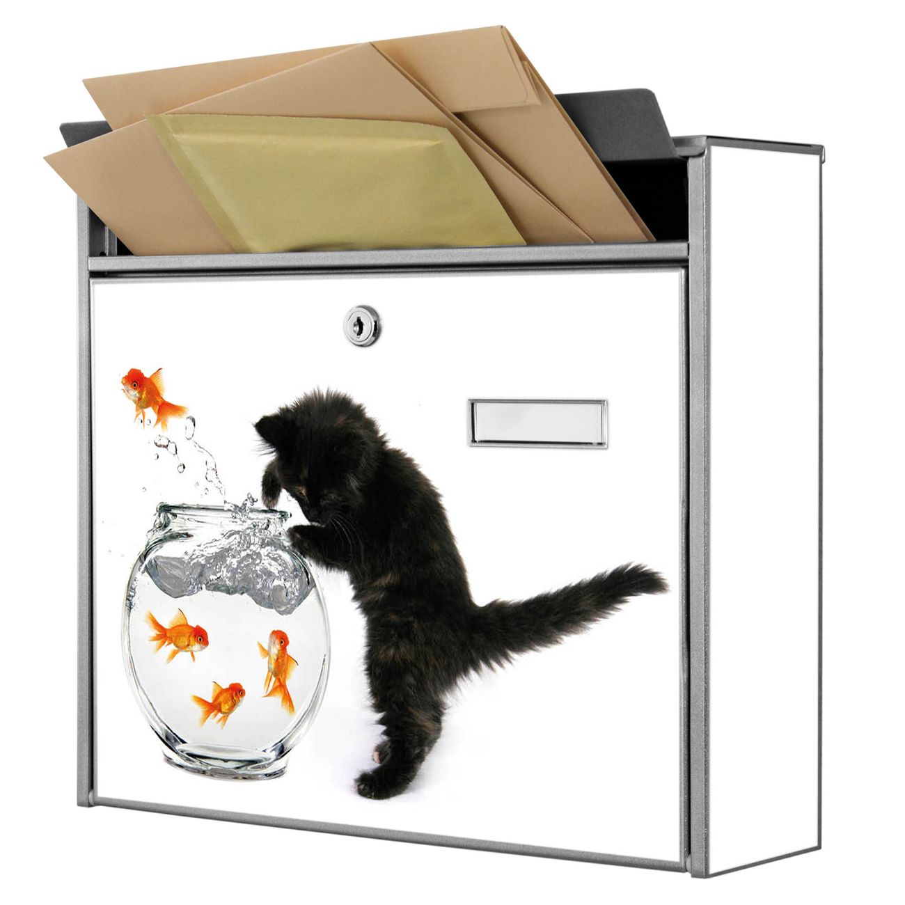 Der Burg Wächter Mail Briefkasten mit Motiv Katze Und Fisch bietet Ihnen mit seinem Fassungsvermögen genügend Platz auch für große A4 Sendungen. Auf Wunsch können Sie bei uns den passenden Standfuß kaufen und so aus dem Wandbriefkasten einen Standbriefkasten machen. Wir bieten Ihnen ebenfalls Namensschilder, bereits beschriftet oder frei zu beschriften, und verschiedene selbst gestaltete Bitte-Keine-Werbung-Aufkleber.