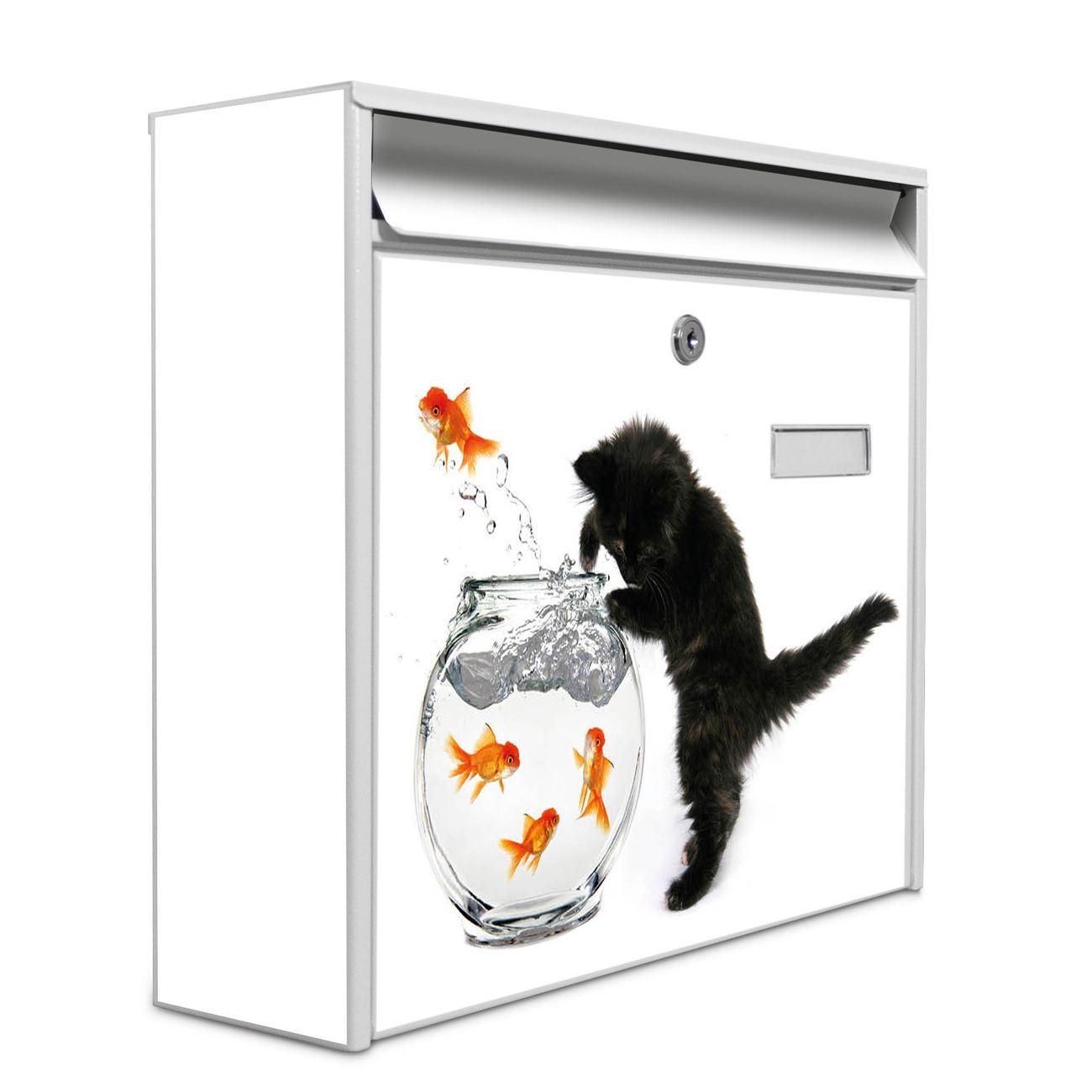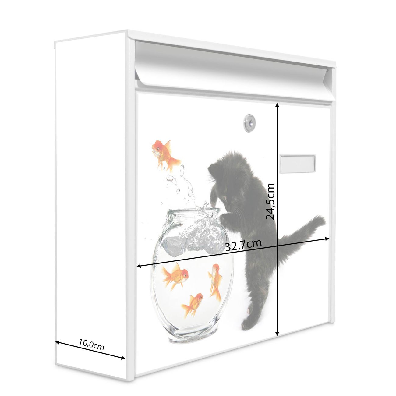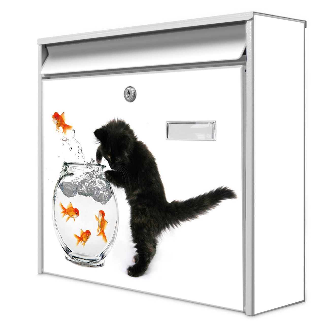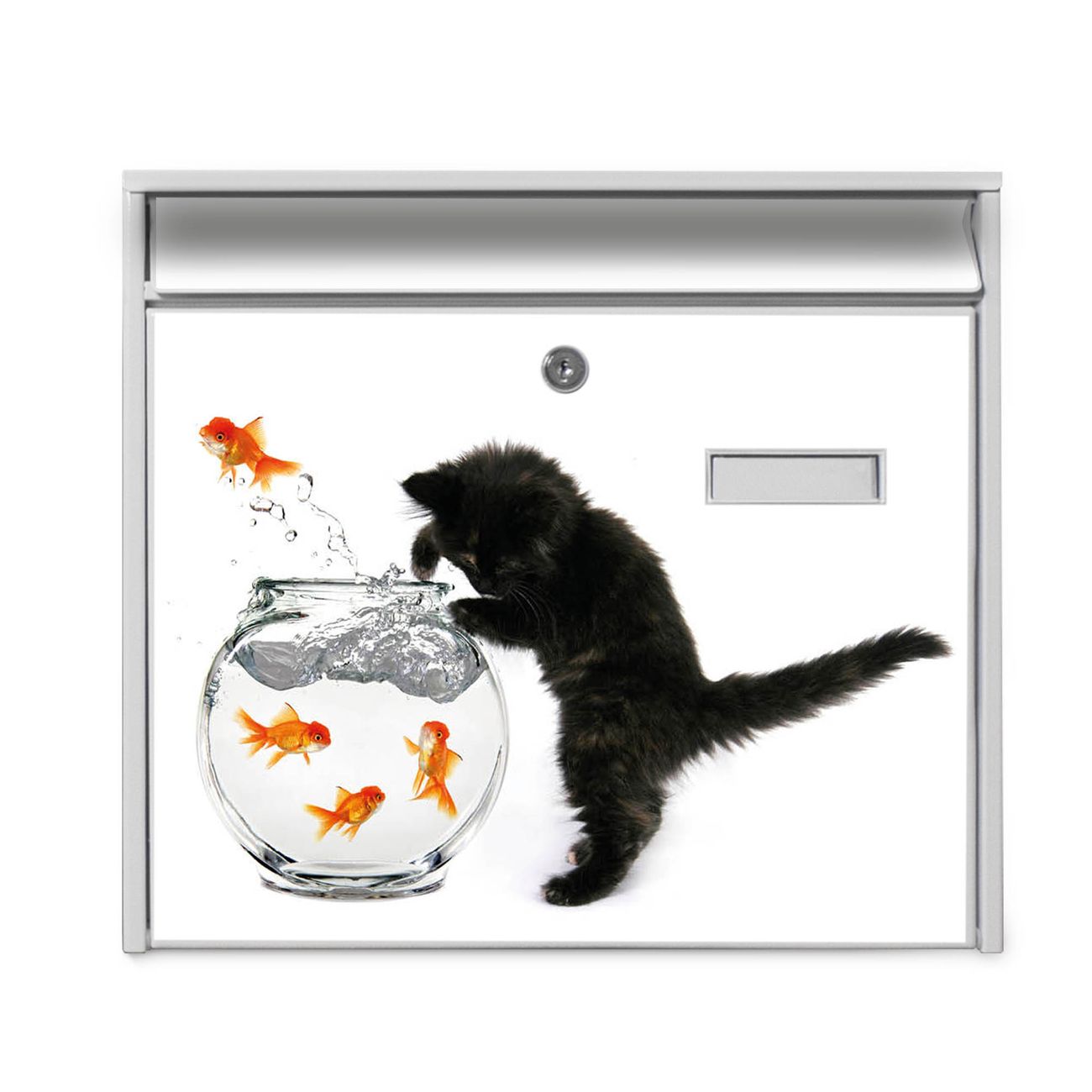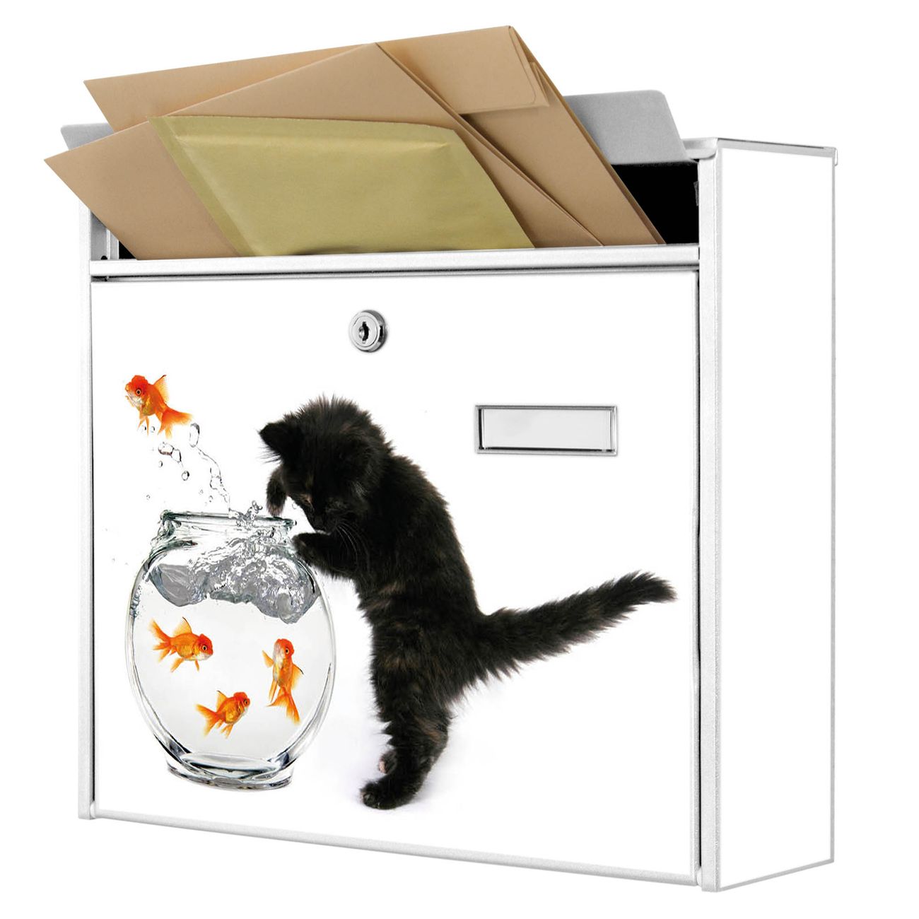 Der Burg Wächter Mail Briefkasten mit Motiv Katze Und Fisch bietet Ihnen mit seinem Fassungsvermögen genügend Platz auch für große A4 Sendungen. Auf Wunsch können Sie bei uns den passenden Standfuß kaufen und so aus dem Wandbriefkasten einen Standbriefkasten machen. Wir bieten Ihnen ebenfalls Namensschilder, bereits beschriftet oder frei zu beschriften, und verschiedene selbst gestaltete Bitte-Keine-Werbung-Aufkleber.