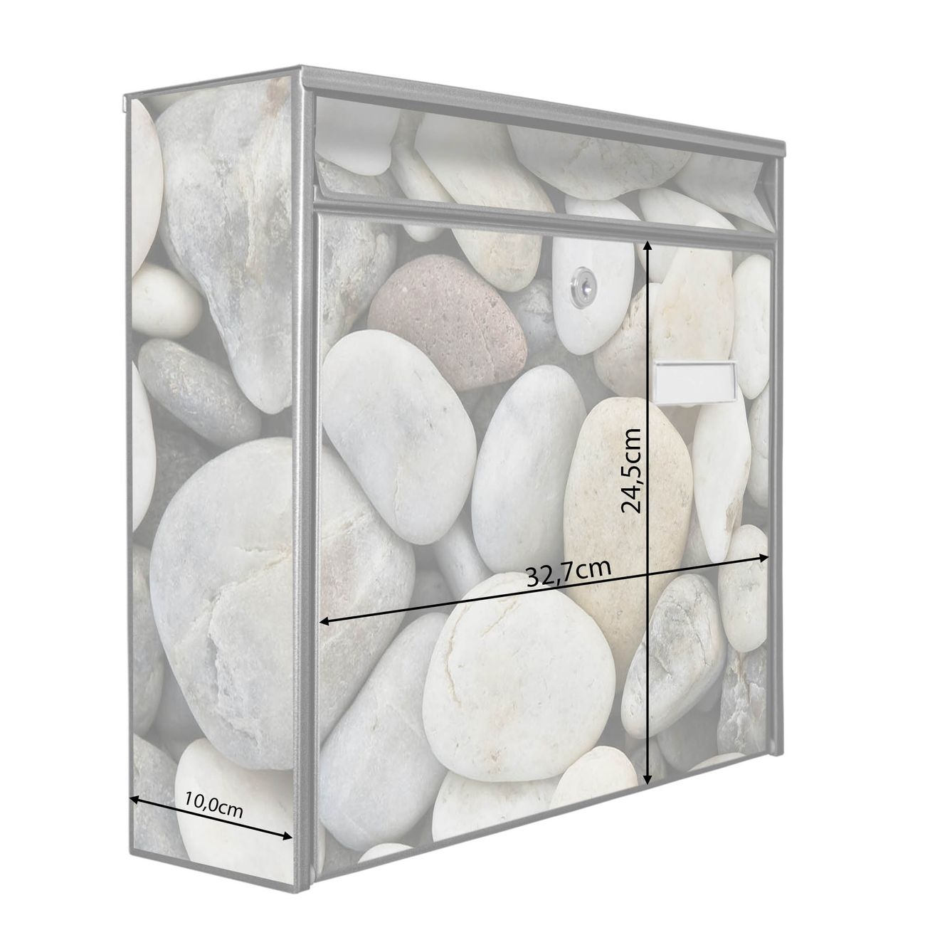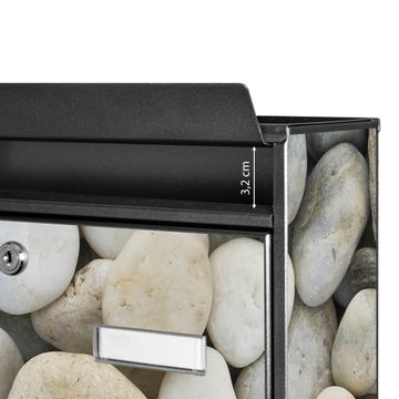 Der Burg Wächter Mail Briefkasten mit Motiv Kieselsteine bietet Ihnen mit seinem Fassungsvermögen genügend Platz auch für große A4 Sendungen. Auf Wunsch können Sie bei uns den passenden Standfuß kaufen und so aus dem Wandbriefkasten einen Standbriefkasten machen. Wir bieten Ihnen ebenfalls Namensschilder, bereits beschriftet oder frei zu beschriften, und verschiedene selbst gestaltete Bitte-Keine-Werbung-Aufkleber.