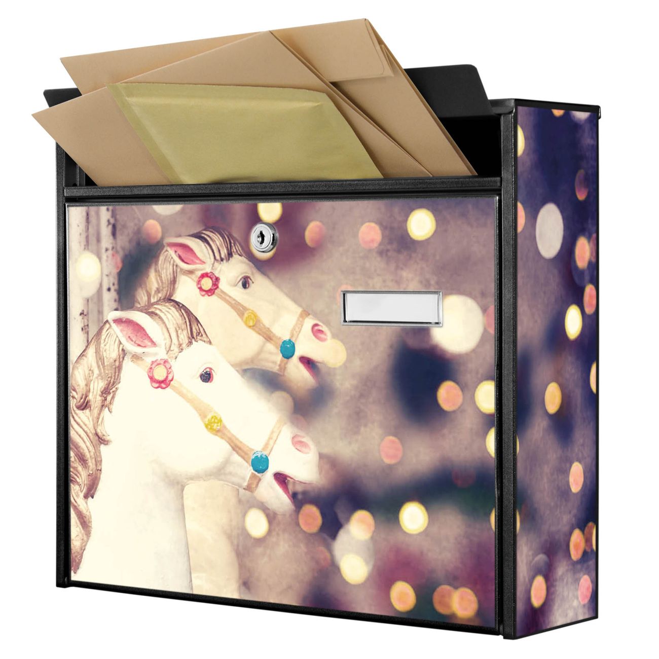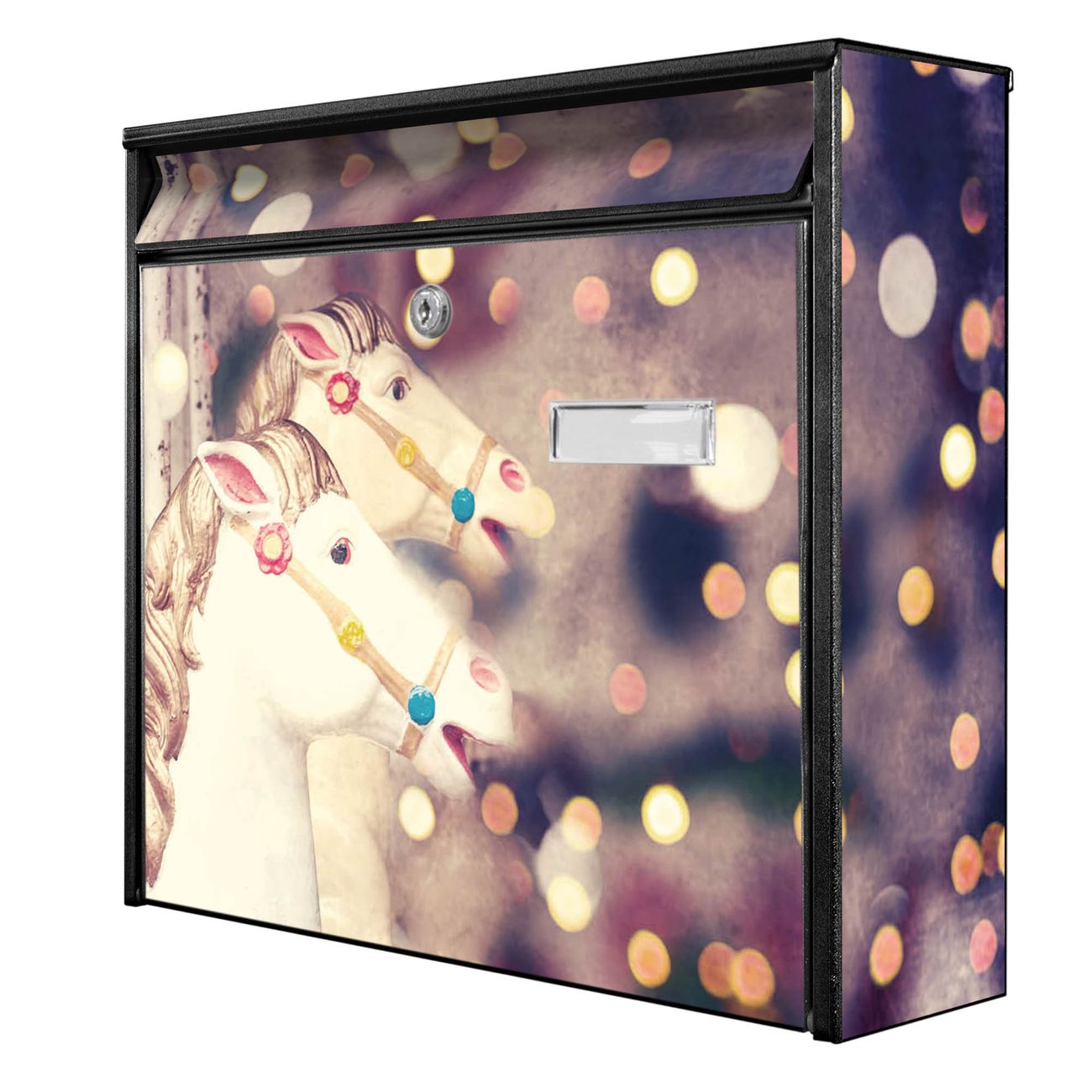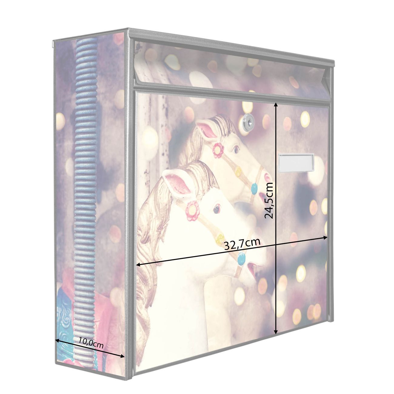 Der Burg Wächter Mail Briefkasten mit Motiv Kinderkarussell bietet Ihnen mit seinem Fassungsvermögen genügend Platz auch für große A4 Sendungen. Auf Wunsch können Sie bei uns den passenden Standfuß kaufen und so aus dem Wandbriefkasten einen Standbriefkasten machen. Wir bieten Ihnen ebenfalls Namensschilder, bereits beschriftet oder frei zu beschriften, und verschiedene selbst gestaltete Bitte-Keine-Werbung-Aufkleber.