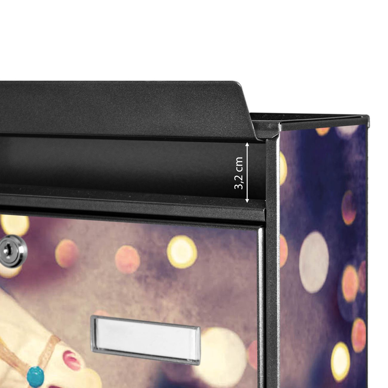 Die Größe des Briefkastens ist 36 x 32 x 10cm (BxHxT) groß. Das Motiv besteht aus einer wetter- und UV-festen Folie, die mit einem Schutzlaminat überzogen ist und Ihren Briefkasten zusätzlich vor Kratzern schützt. Sie erhalten 2 Schlüssel sowie das Montagematerial.