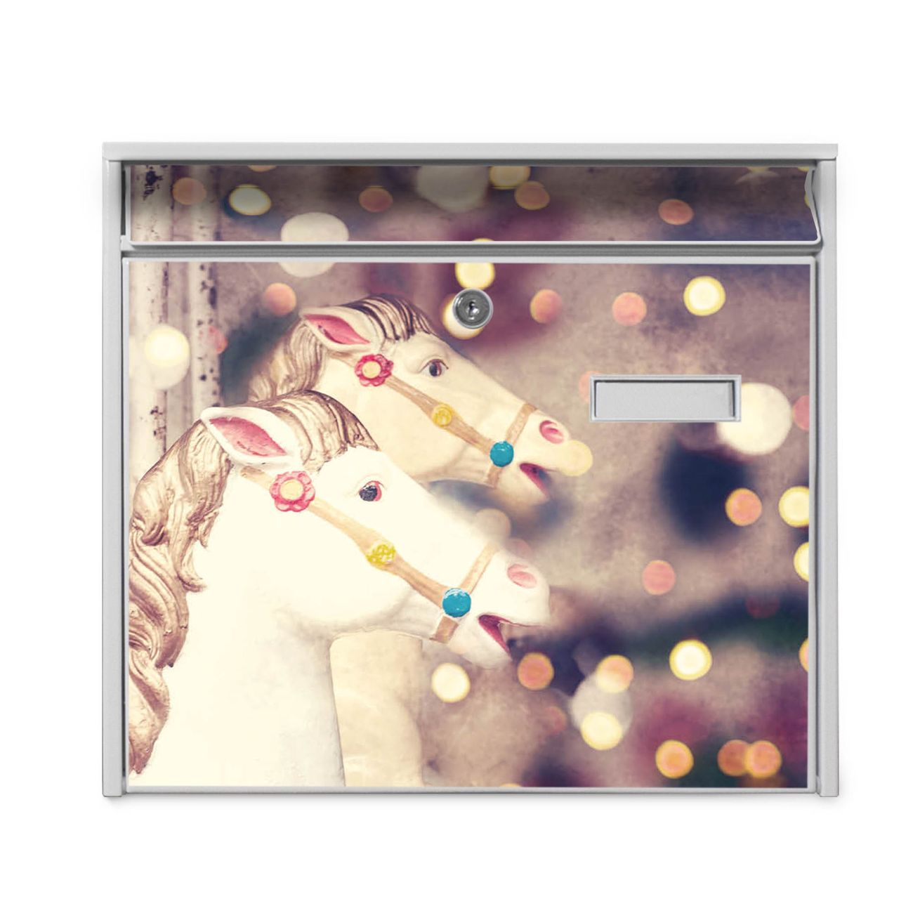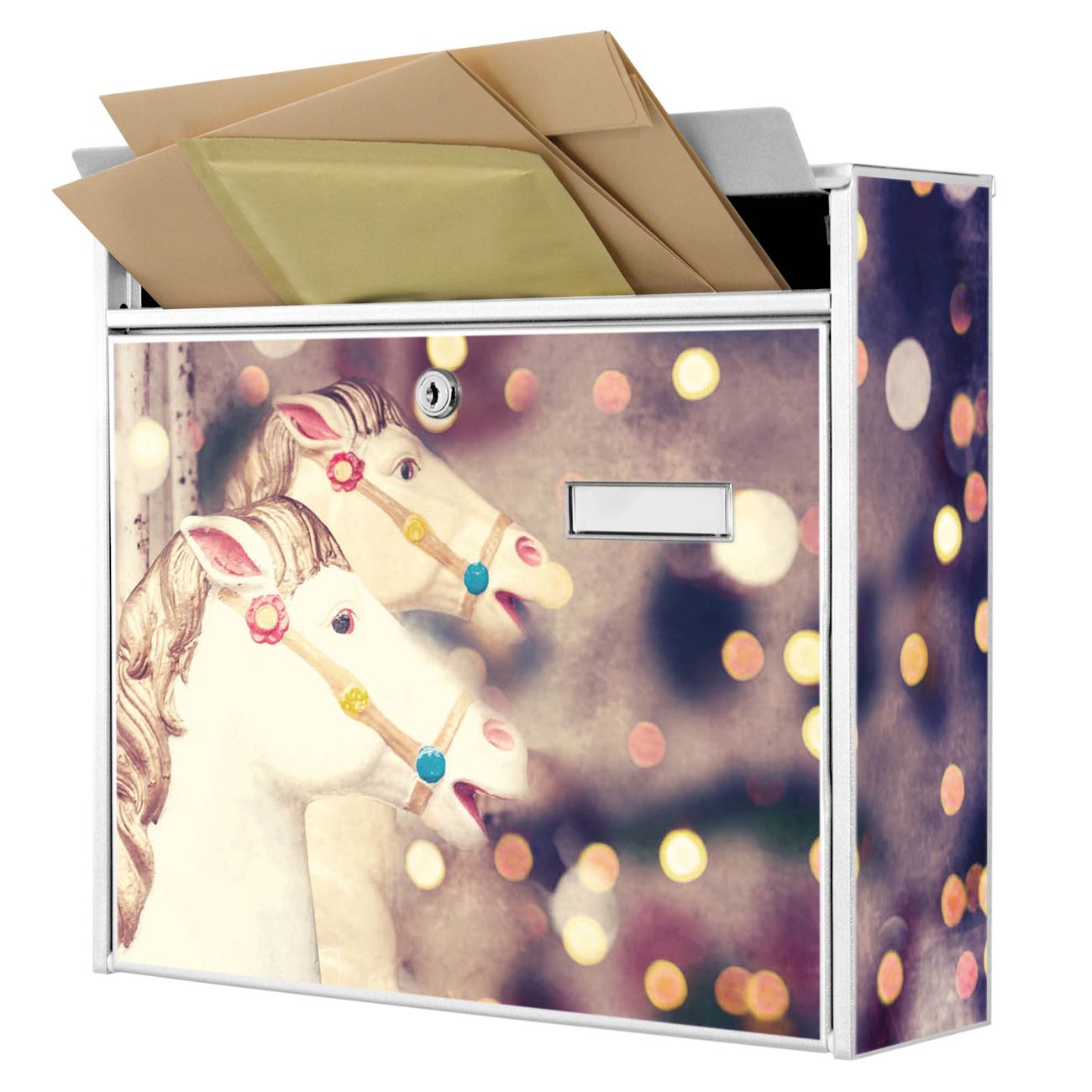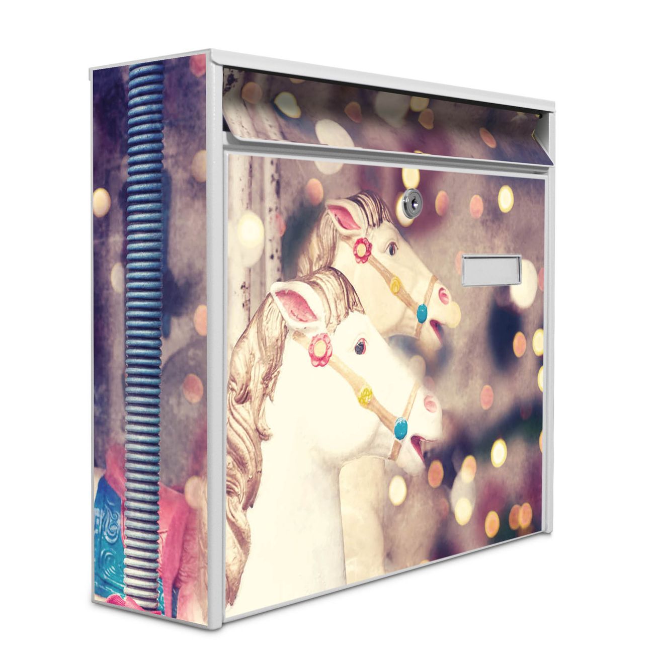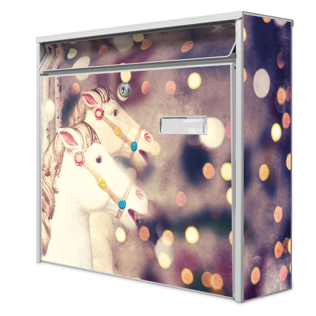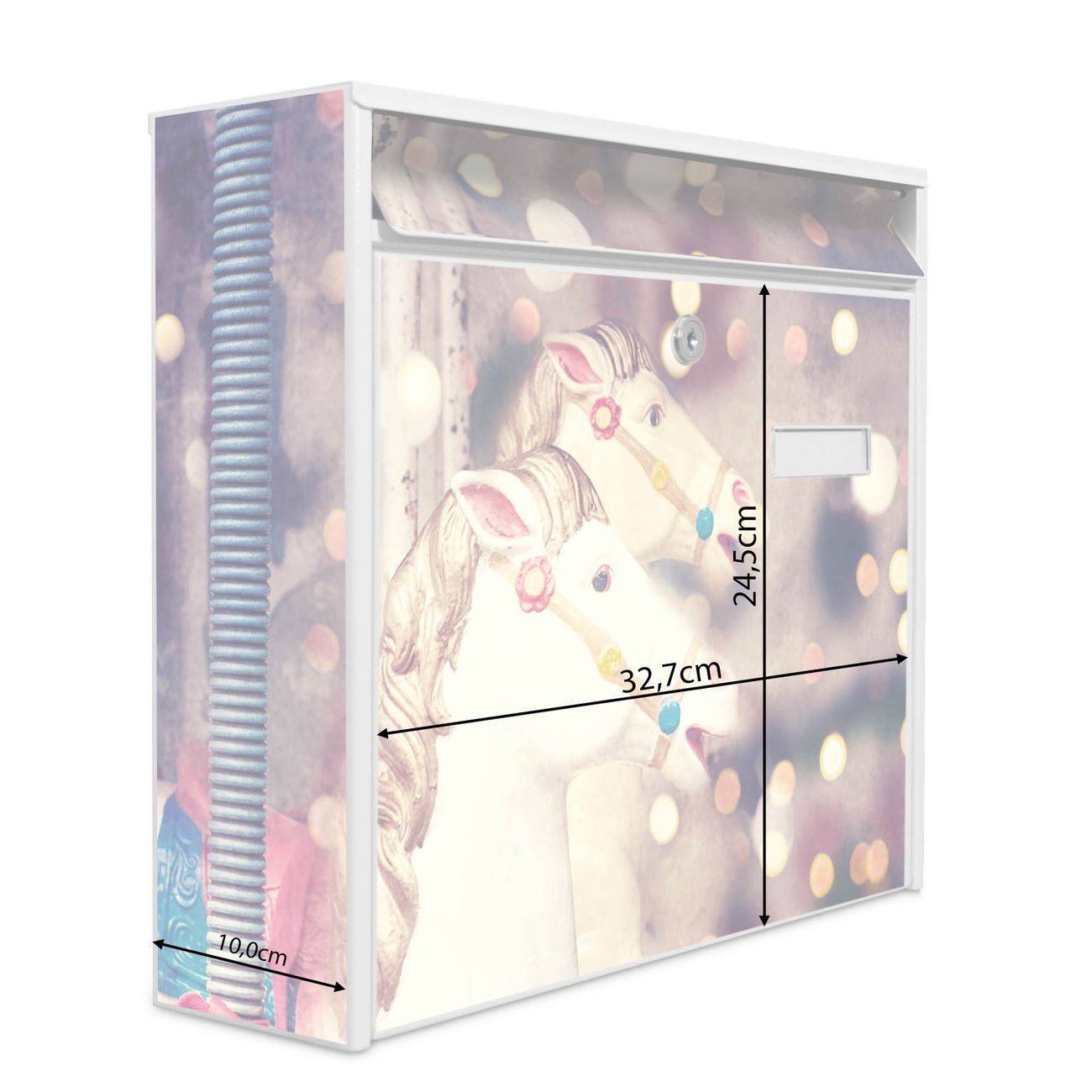 Der Burg Wächter Mail Briefkasten mit Motiv Kinderkarussell bietet Ihnen mit seinem Fassungsvermögen genügend Platz auch für große A4 Sendungen. Auf Wunsch können Sie bei uns den passenden Standfuß kaufen und so aus dem Wandbriefkasten einen Standbriefkasten machen. Wir bieten Ihnen ebenfalls Namensschilder, bereits beschriftet oder frei zu beschriften, und verschiedene selbst gestaltete Bitte-Keine-Werbung-Aufkleber.