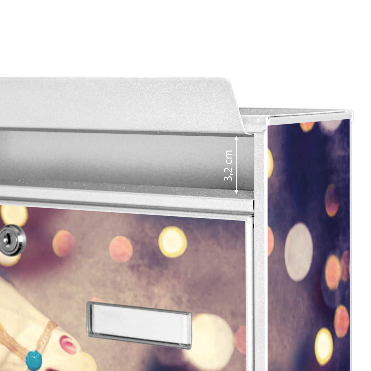 Die Größe des Briefkastens ist 36 x 32 x 10cm (BxHxT) groß. Das Motiv besteht aus einer wetter- und UV-festen Folie, die mit einem Schutzlaminat überzogen ist und Ihren Briefkasten zusätzlich vor Kratzern schützt. Sie erhalten 2 Schlüssel sowie das Montagematerial.