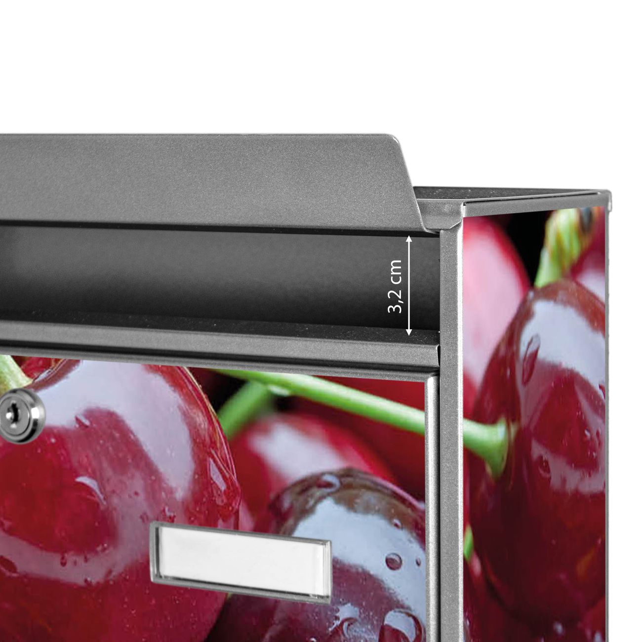 Der Burg Wächter Mail Briefkasten mit Motiv Kirschen bietet Ihnen mit seinem Fassungsvermögen genügend Platz auch für große A4 Sendungen. Auf Wunsch können Sie bei uns den passenden Standfuß kaufen und so aus dem Wandbriefkasten einen Standbriefkasten machen. Wir bieten Ihnen ebenfalls Namensschilder, bereits beschriftet oder frei zu beschriften, und verschiedene selbst gestaltete Bitte-Keine-Werbung-Aufkleber.