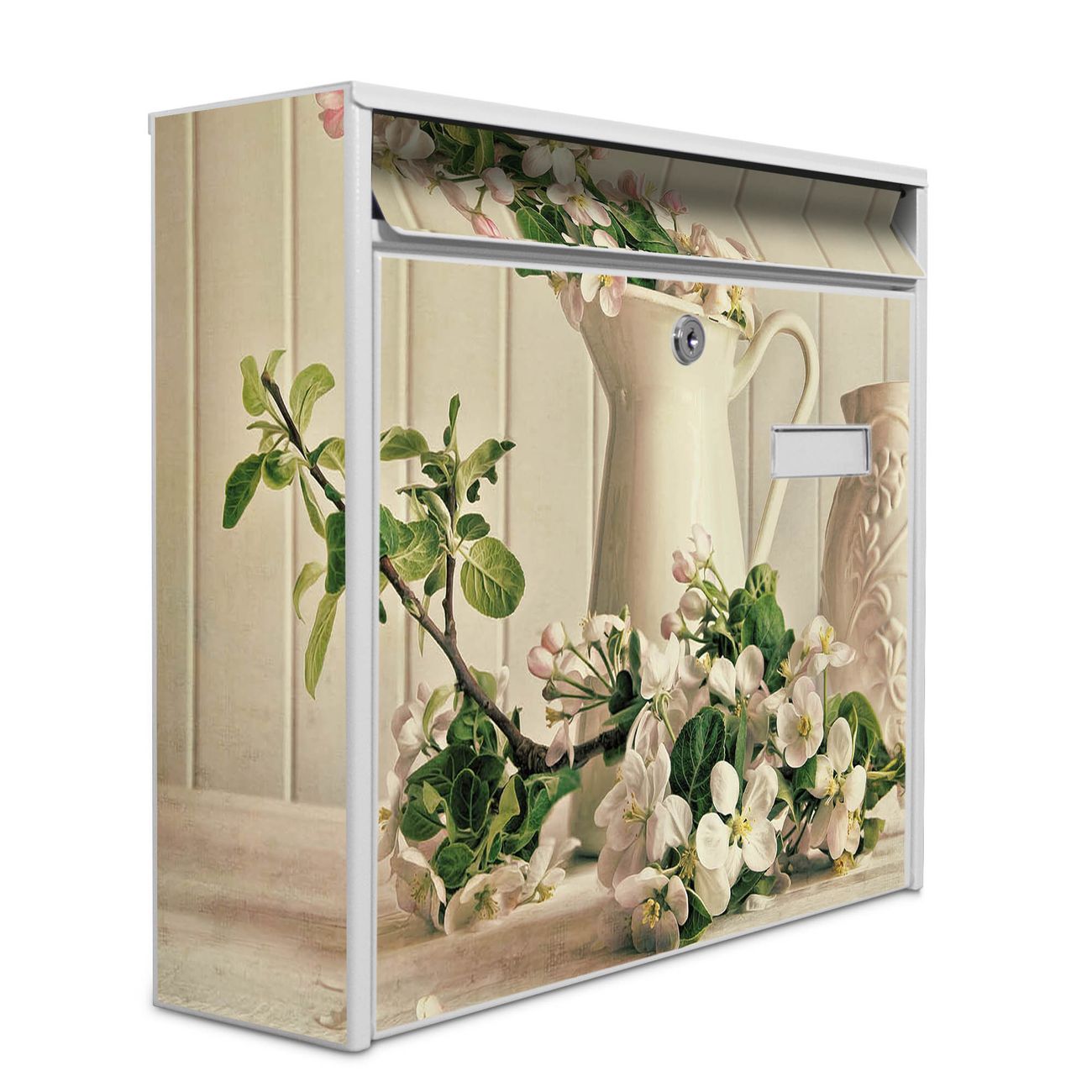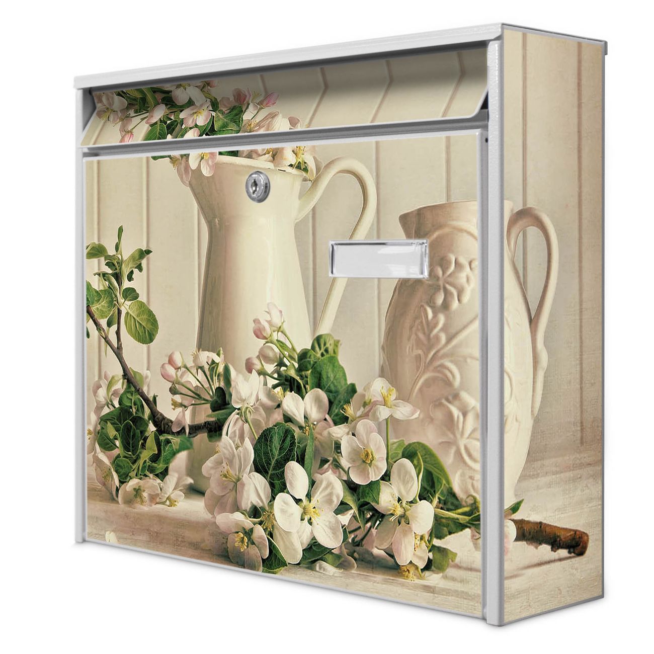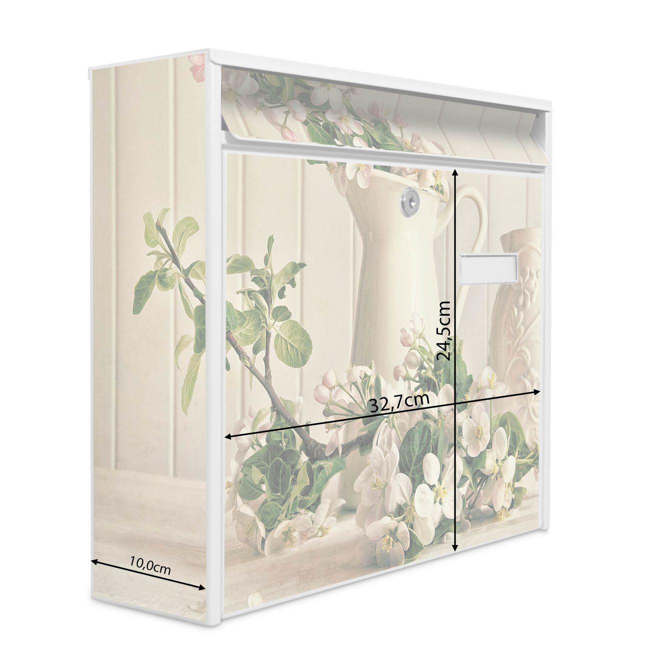 Der Burg Wächter Mail Briefkasten mit Motiv Kirschzweige bietet Ihnen mit seinem Fassungsvermögen genügend Platz auch für große A4 Sendungen. Auf Wunsch können Sie bei uns den passenden Standfuß kaufen und so aus dem Wandbriefkasten einen Standbriefkasten machen. Wir bieten Ihnen ebenfalls Namensschilder, bereits beschriftet oder frei zu beschriften, und verschiedene selbst gestaltete Bitte-Keine-Werbung-Aufkleber.