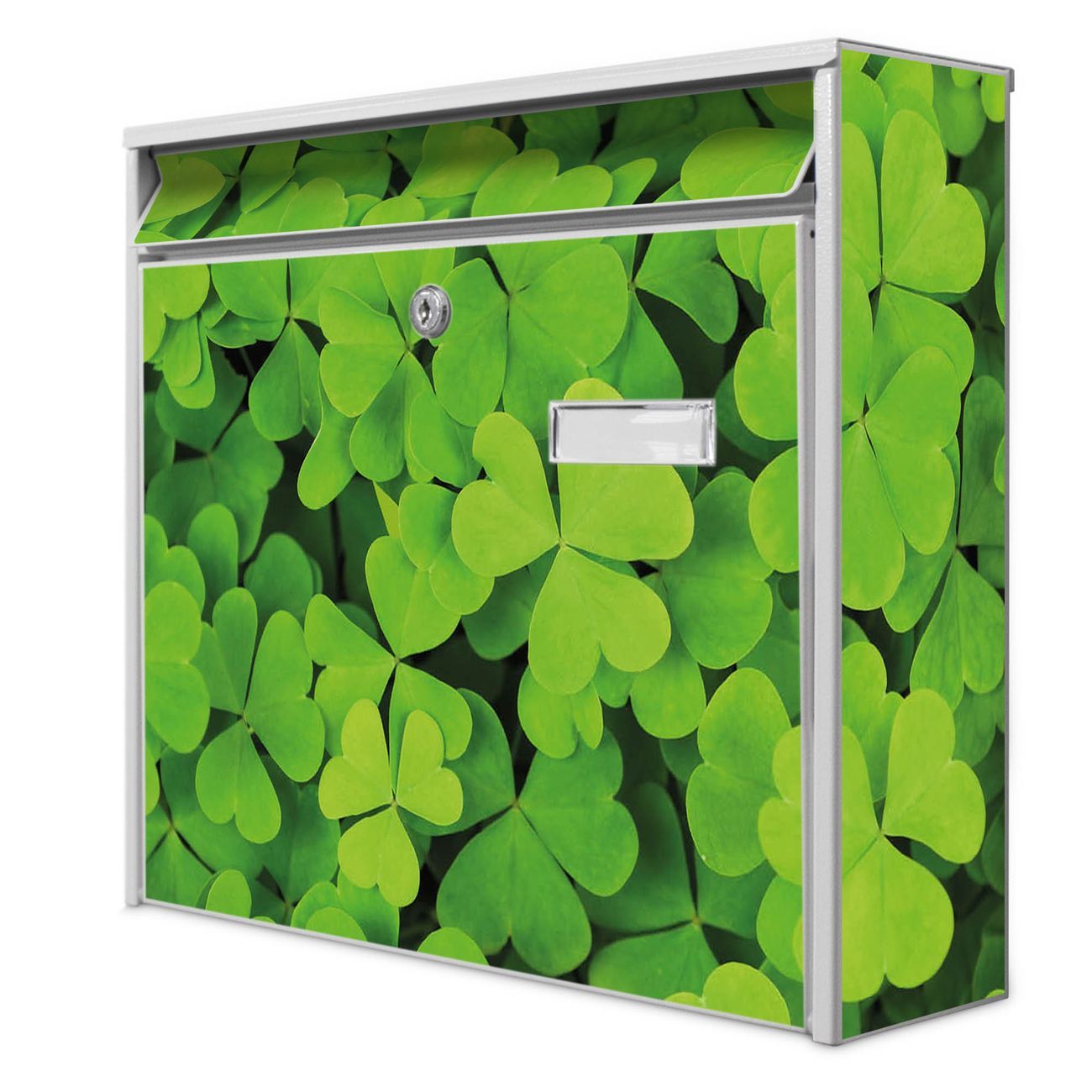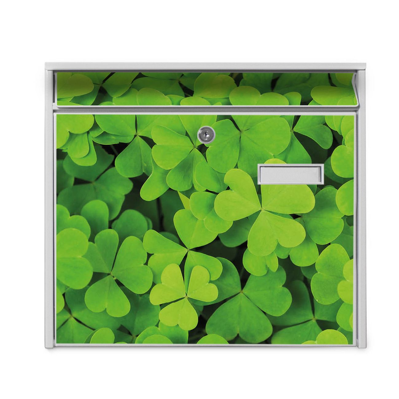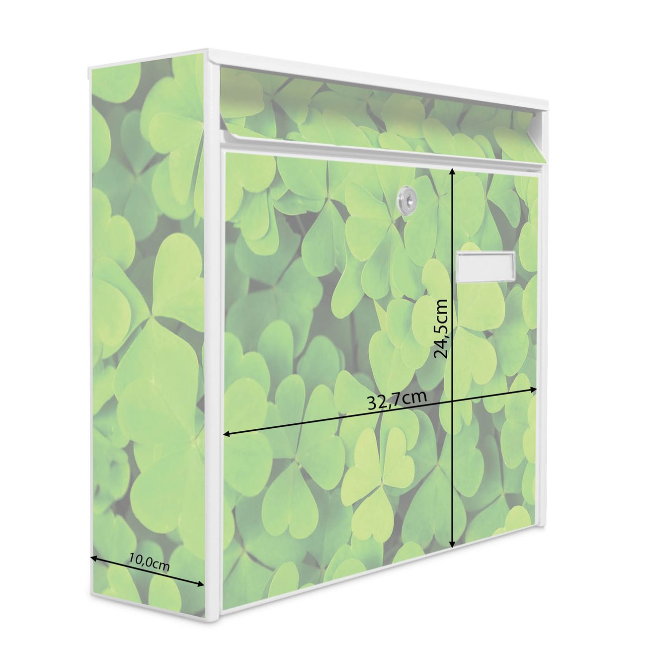 Der Burg Wächter Mail Briefkasten mit Motiv Klee bietet Ihnen mit seinem Fassungsvermögen genügend Platz auch für große A4 Sendungen. Auf Wunsch können Sie bei uns den passenden Standfuß kaufen und so aus dem Wandbriefkasten einen Standbriefkasten machen. Wir bieten Ihnen ebenfalls Namensschilder, bereits beschriftet oder frei zu beschriften, und verschiedene selbst gestaltete Bitte-Keine-Werbung-Aufkleber.