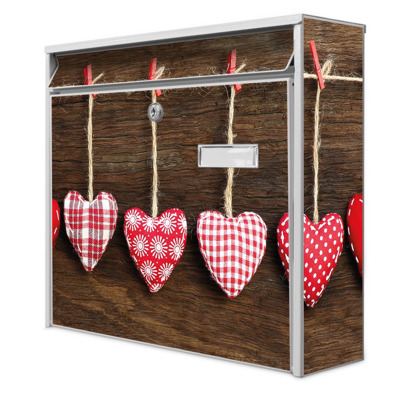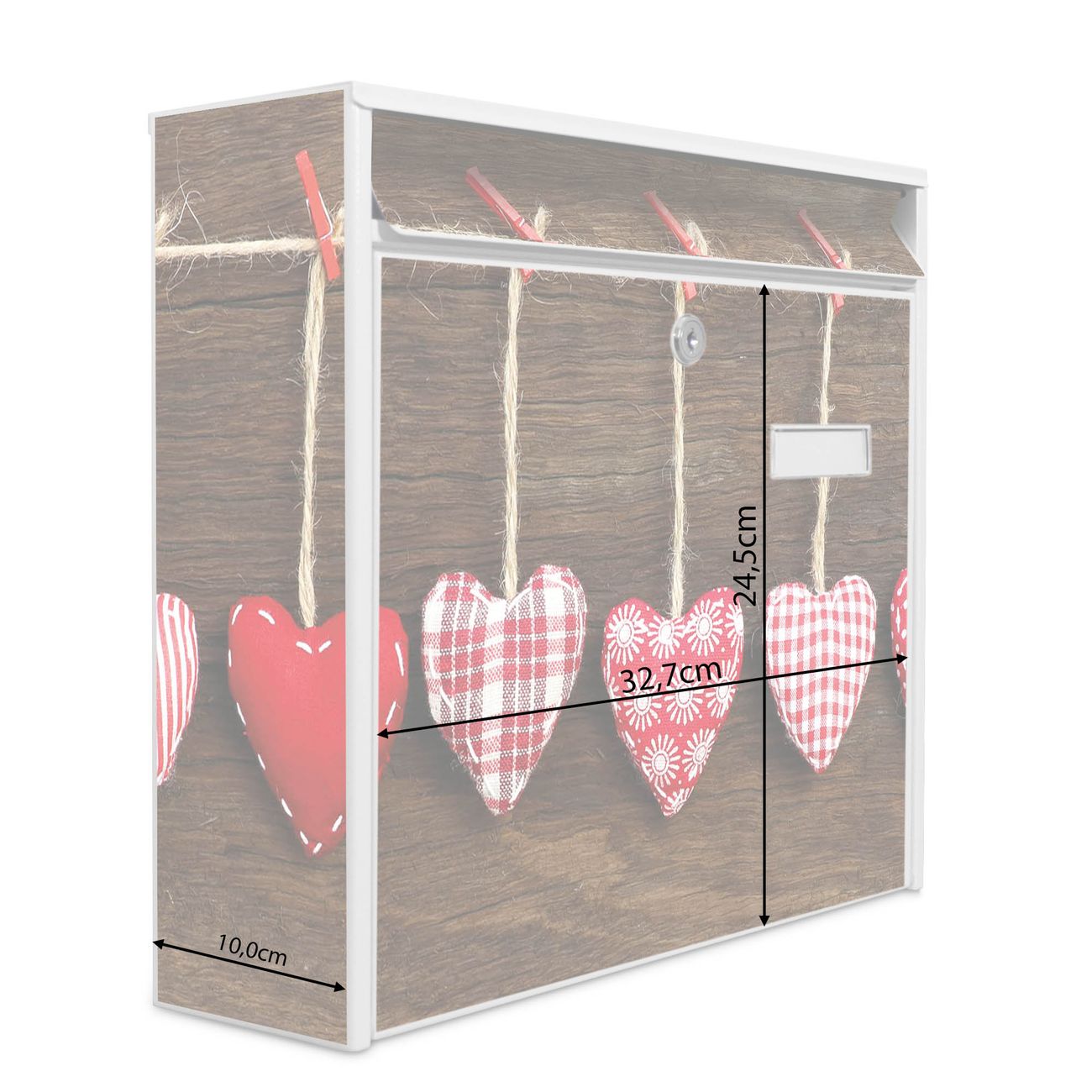 Der Postkasten mit Motiv Kleine Herzen hat ein sehr ansprechendes und zeitloses Design. Heben Sie Sich von der tristen grauen Masse ab, ohne auf Funktionalität zu verzichten. Die weite Öffnung ohne scharfe Kanten ermöglicht eine einfache Handhabung beim Entnehmen der Post. Die Größe bietet genügend Platz für Sendungen aller Art, der Einwurf fasst auch größere A4 Sendungen. Ihr Burg-Wächter Motivbriefkasten wird in Sachsen in einer kleinen Manufaktur von Hand veredelt. Die Motivfolie ist lösungsmittelfrei und schutzlaminiert, dies sorgt für einen langen Halt. Wir legen großen Wert auf die Verbindung von Funktionalität und Design.