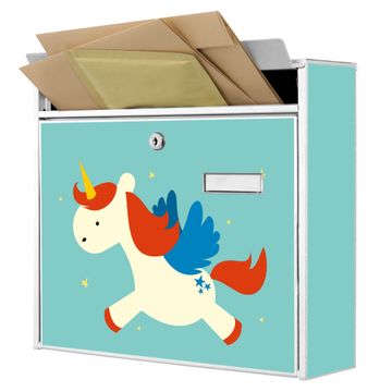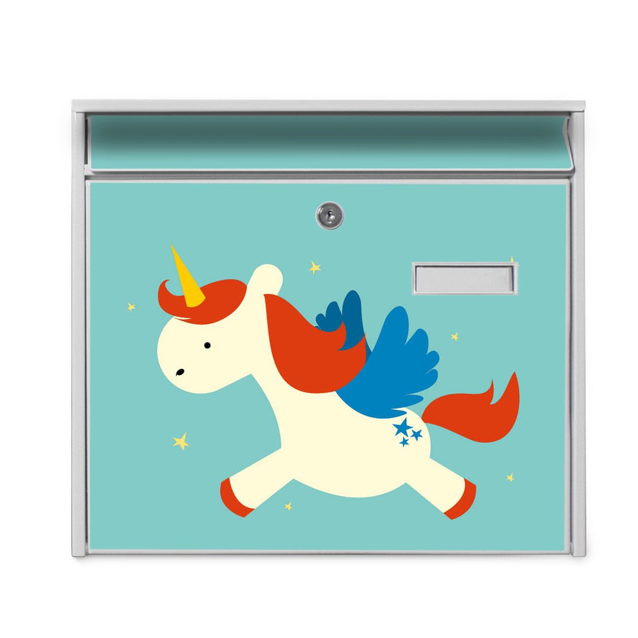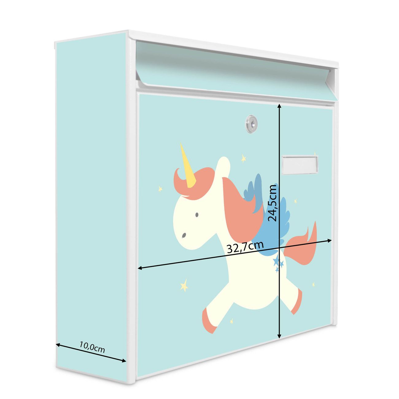 Der Burg Wächter Mail Briefkasten mit Motiv Kleines Einhorn bietet Ihnen mit seinem Fassungsvermögen genügend Platz auch für große A4 Sendungen. Auf Wunsch können Sie bei uns den passenden Standfuß kaufen und so aus dem Wandbriefkasten einen Standbriefkasten machen. Wir bieten Ihnen ebenfalls Namensschilder, bereits beschriftet oder frei zu beschriften, und verschiedene selbst gestaltete Bitte-Keine-Werbung-Aufkleber.
