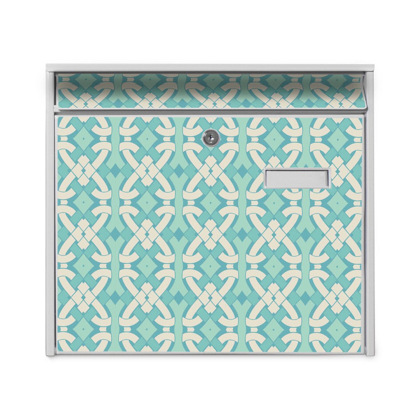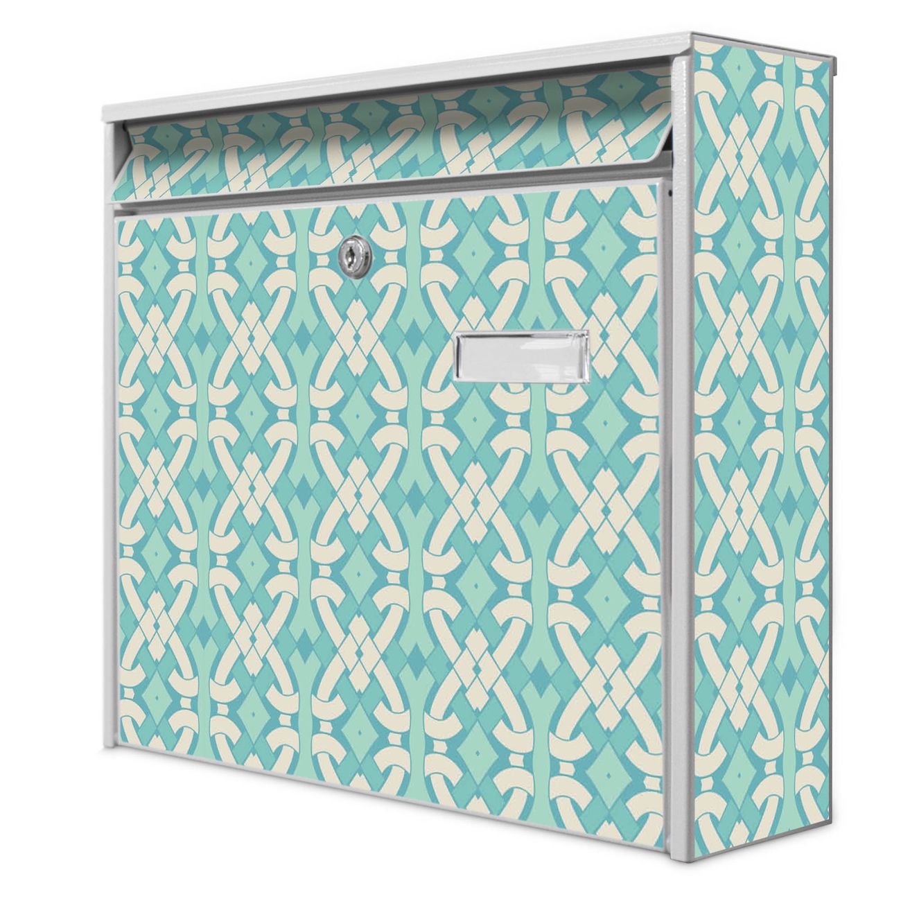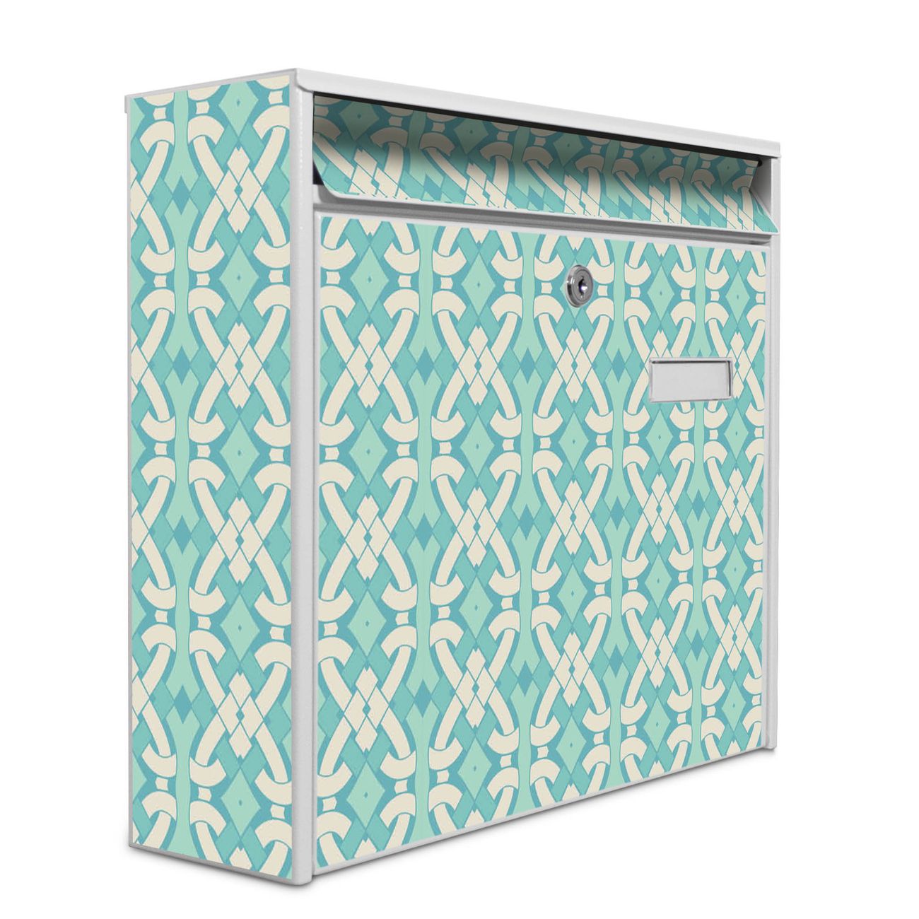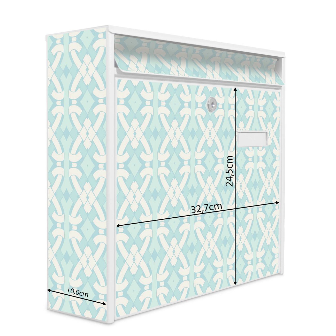 Der Burg Wächter Mail Briefkasten mit Motiv Knoten Türkis bietet Ihnen mit seinem Fassungsvermögen genügend Platz auch für große A4 Sendungen. Auf Wunsch können Sie bei uns den passenden Standfuß kaufen und so aus dem Wandbriefkasten einen Standbriefkasten machen. Wir bieten Ihnen ebenfalls Namensschilder, bereits beschriftet oder frei zu beschriften, und verschiedene selbst gestaltete Bitte-Keine-Werbung-Aufkleber.