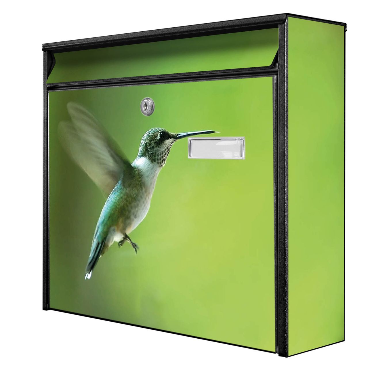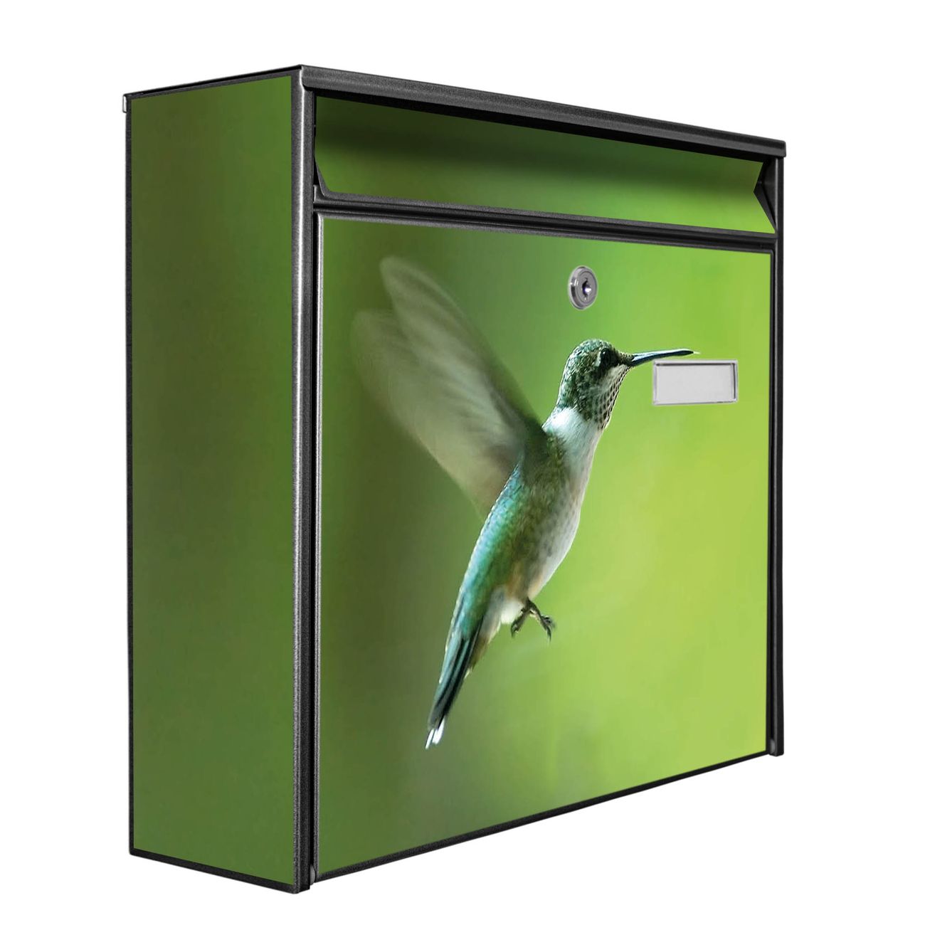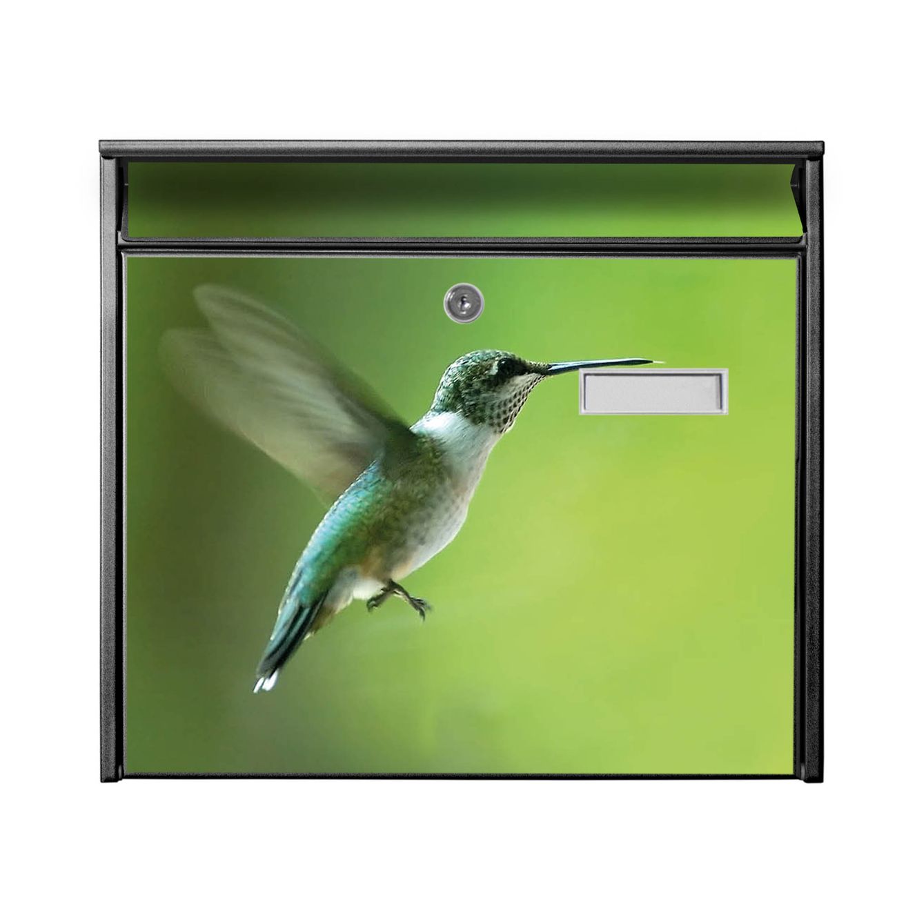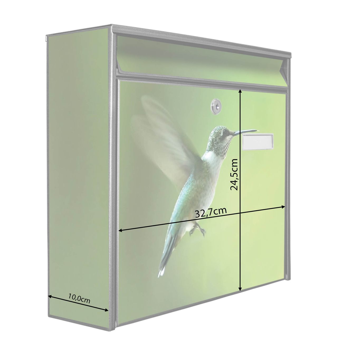 Der Burg Wächter Mail Briefkasten mit Motiv Kolibri bietet Ihnen mit seinem Fassungsvermögen genügend Platz auch für große A4 Sendungen. Auf Wunsch können Sie bei uns den passenden Standfuß kaufen und so aus dem Wandbriefkasten einen Standbriefkasten machen. Wir bieten Ihnen ebenfalls Namensschilder, bereits beschriftet oder frei zu beschriften, und verschiedene selbst gestaltete Bitte-Keine-Werbung-Aufkleber.